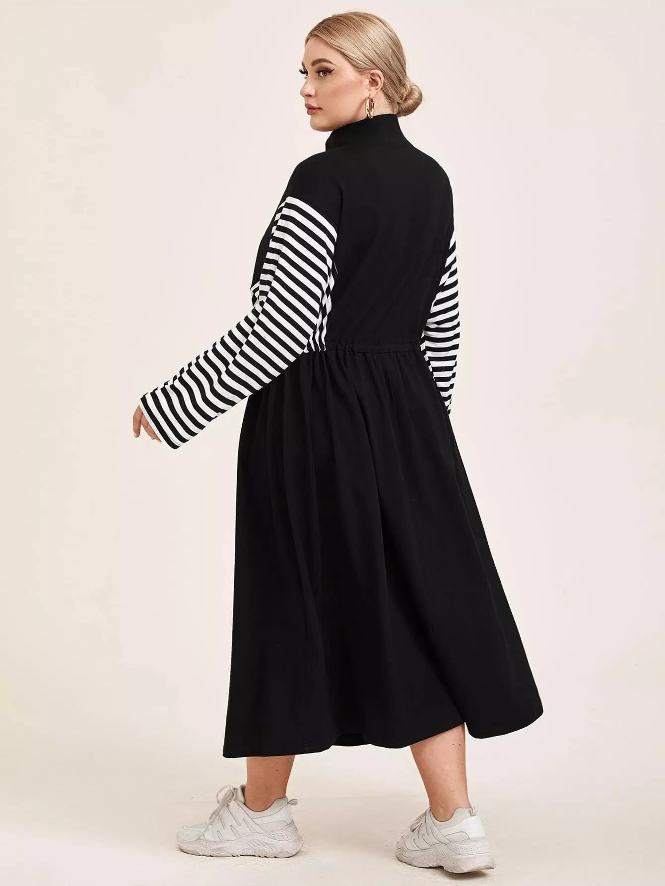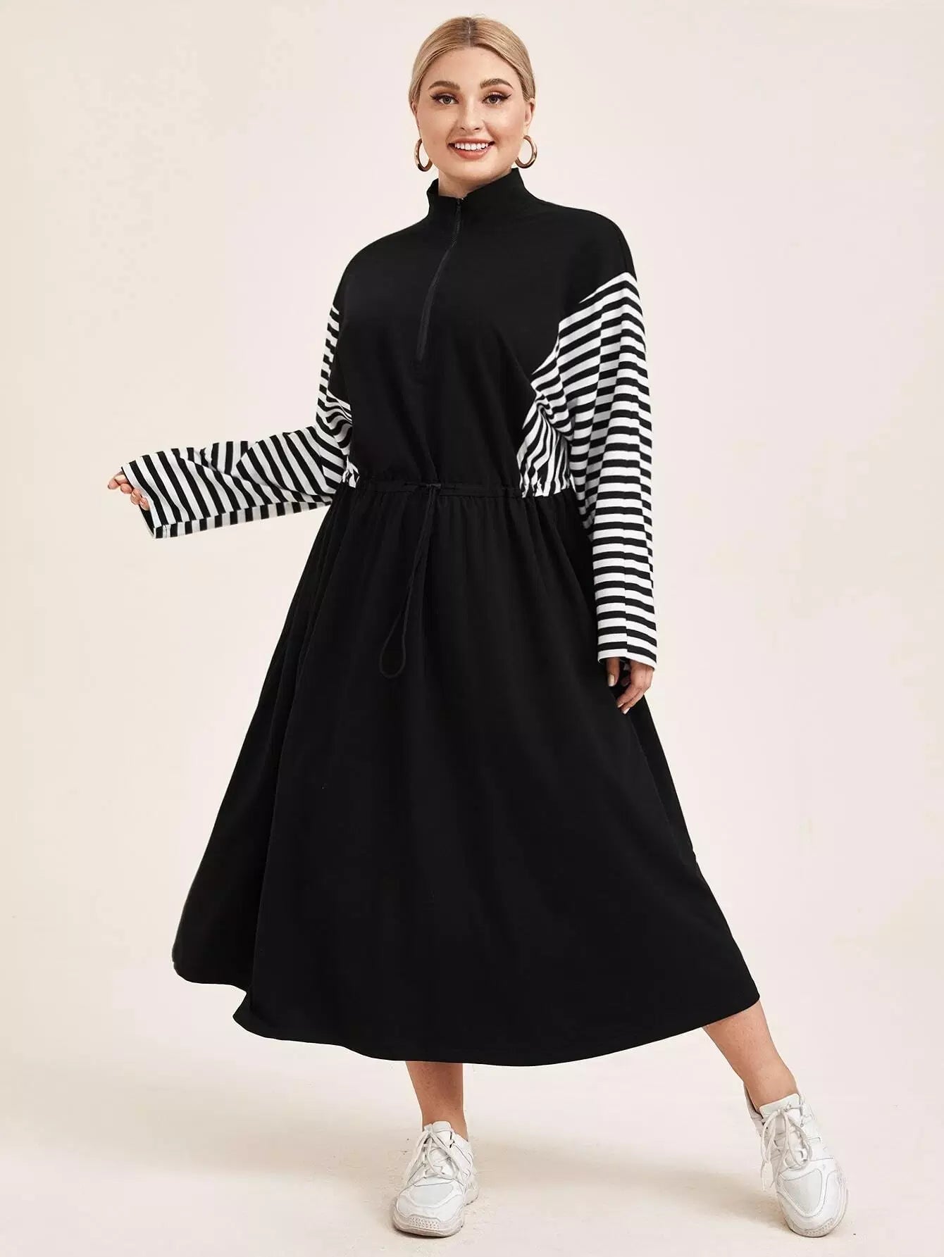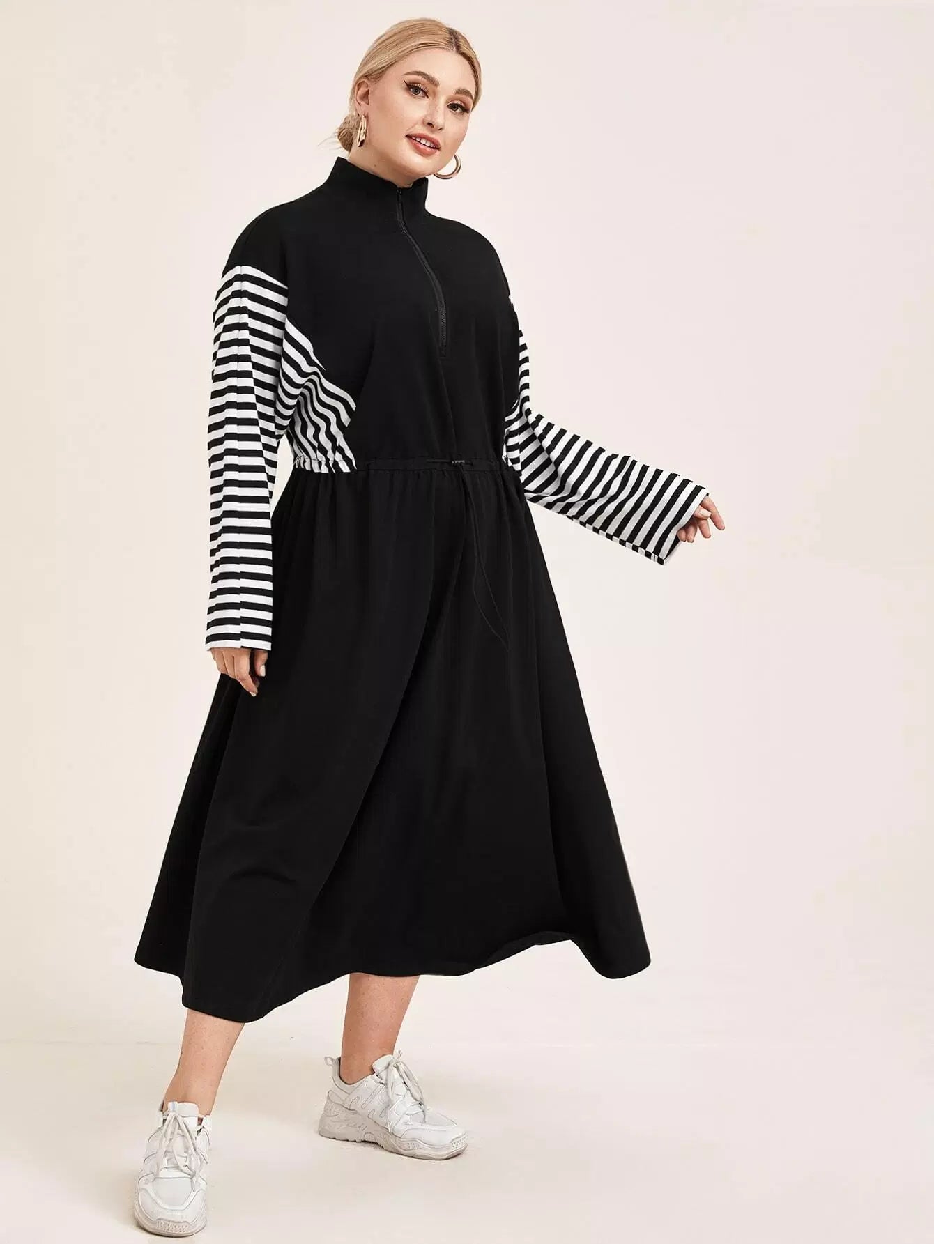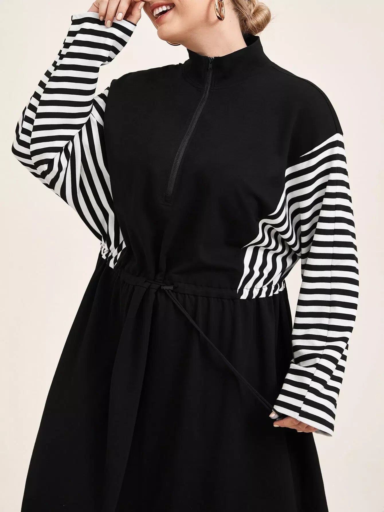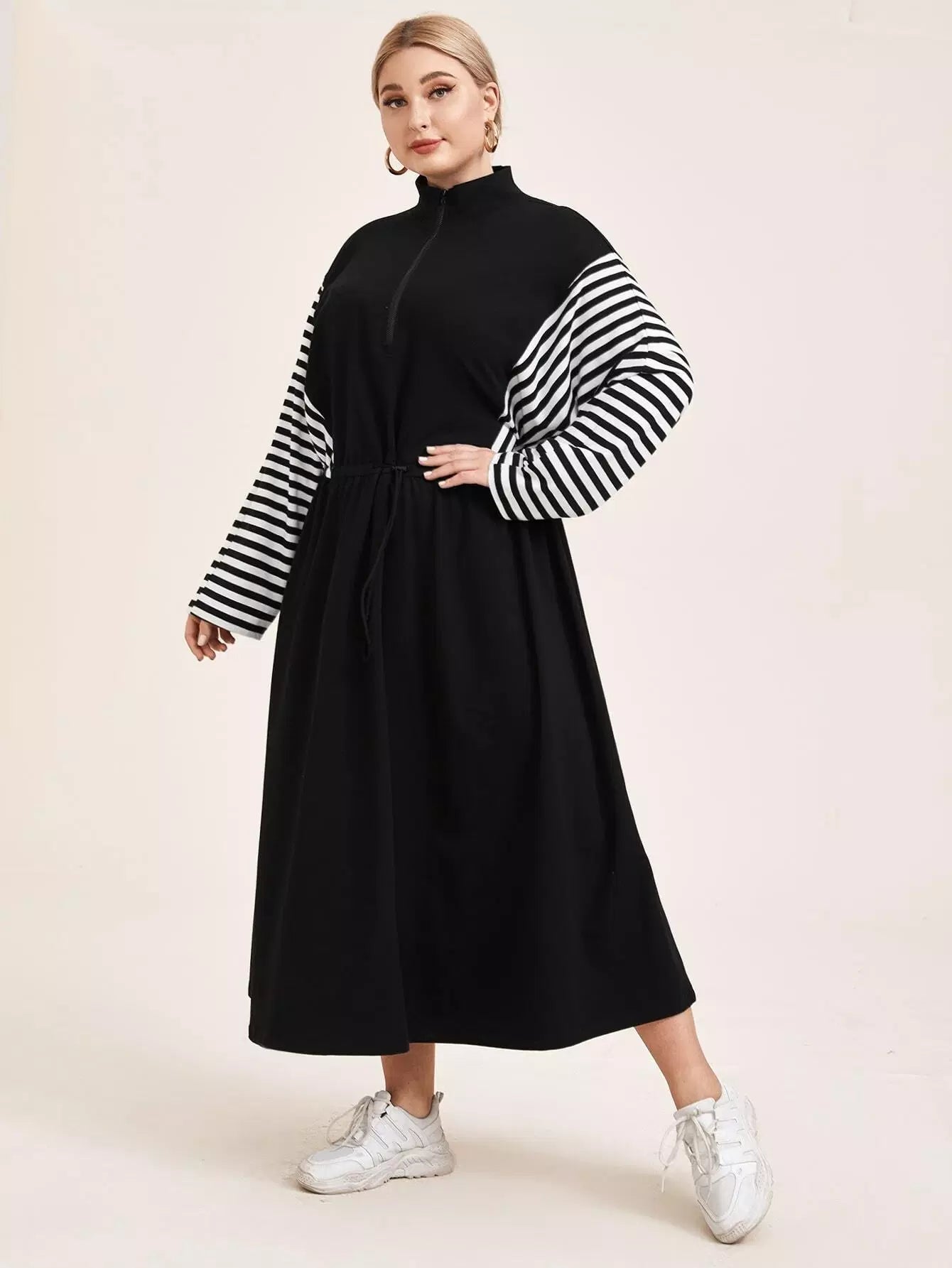 Plus Zip Half Placket Striped Sleeve Dress