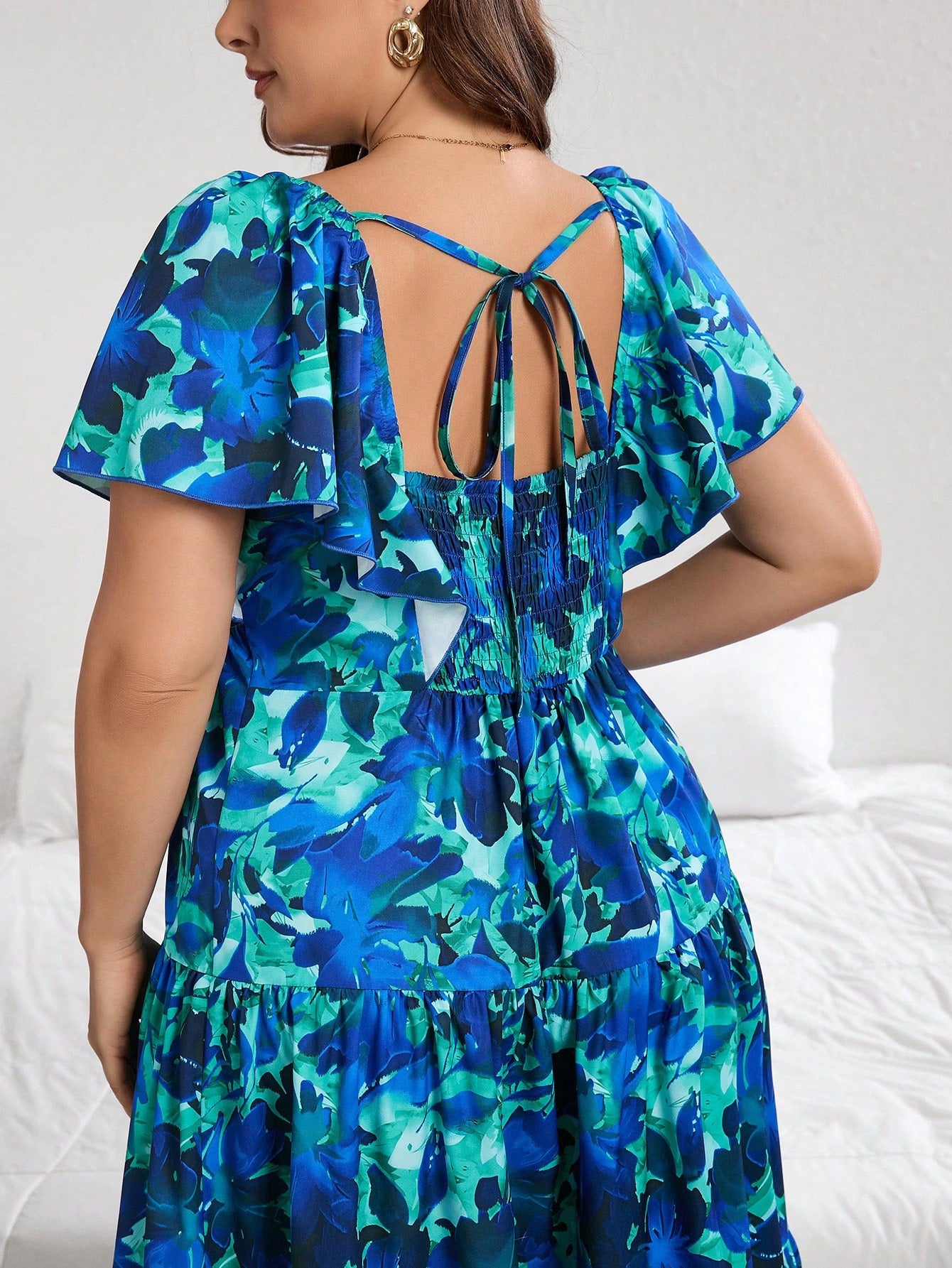 Privï½ Plus Size Women's Romantic Vacation Cap Sleeve V-Neck Ruffled Floral Print Dress, Suitable For