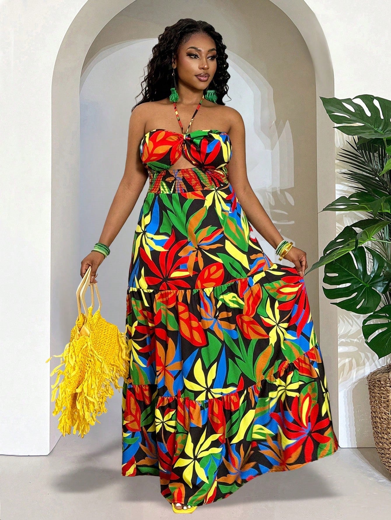 Slaydiva Plus Size Floral Print Sleeveless Backless Layered Dress, Casual Versatile Summer Outfit For
