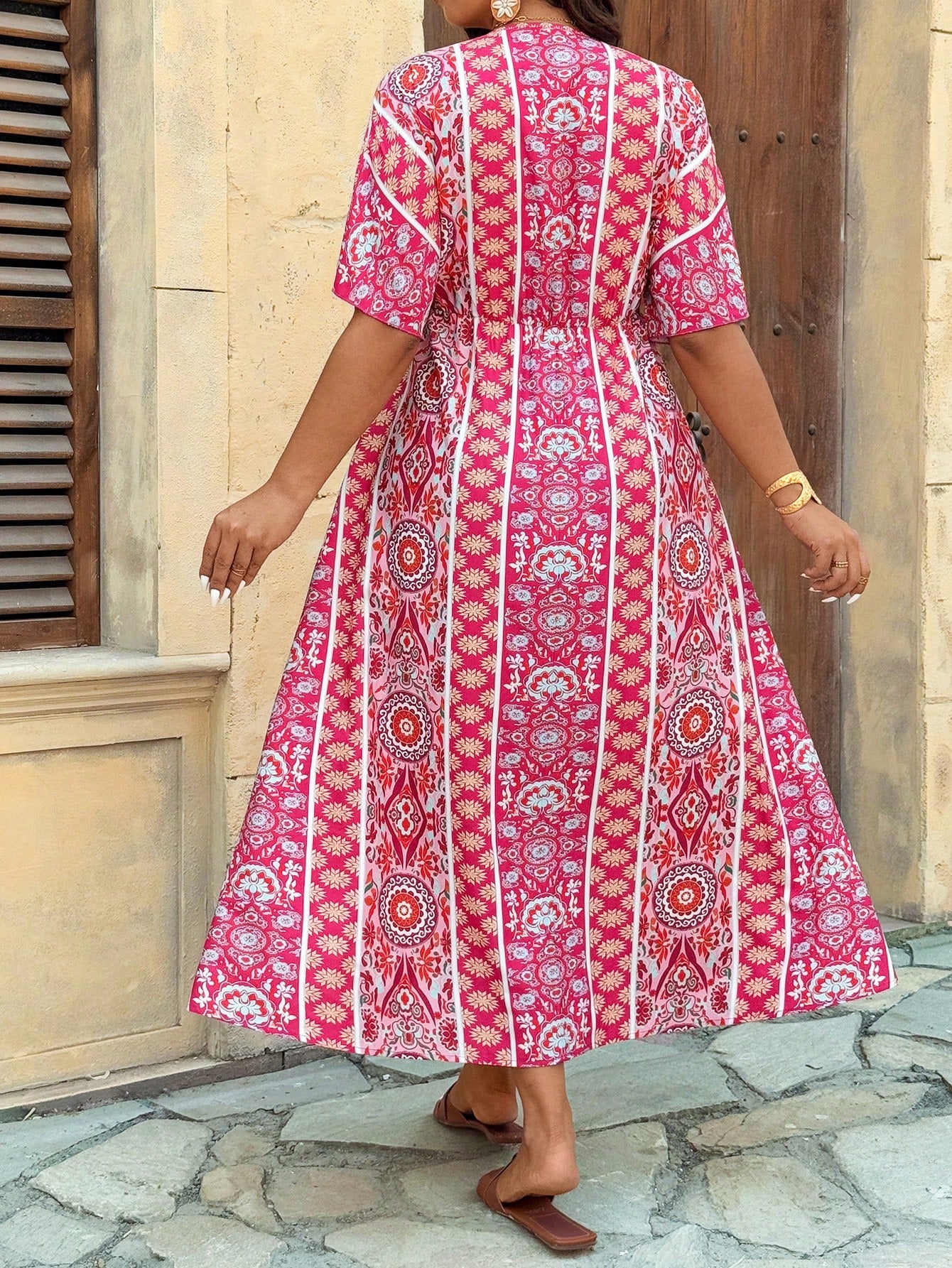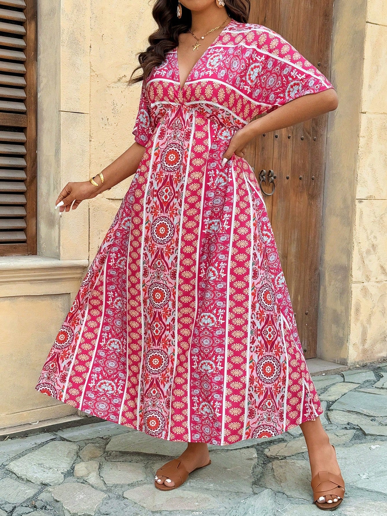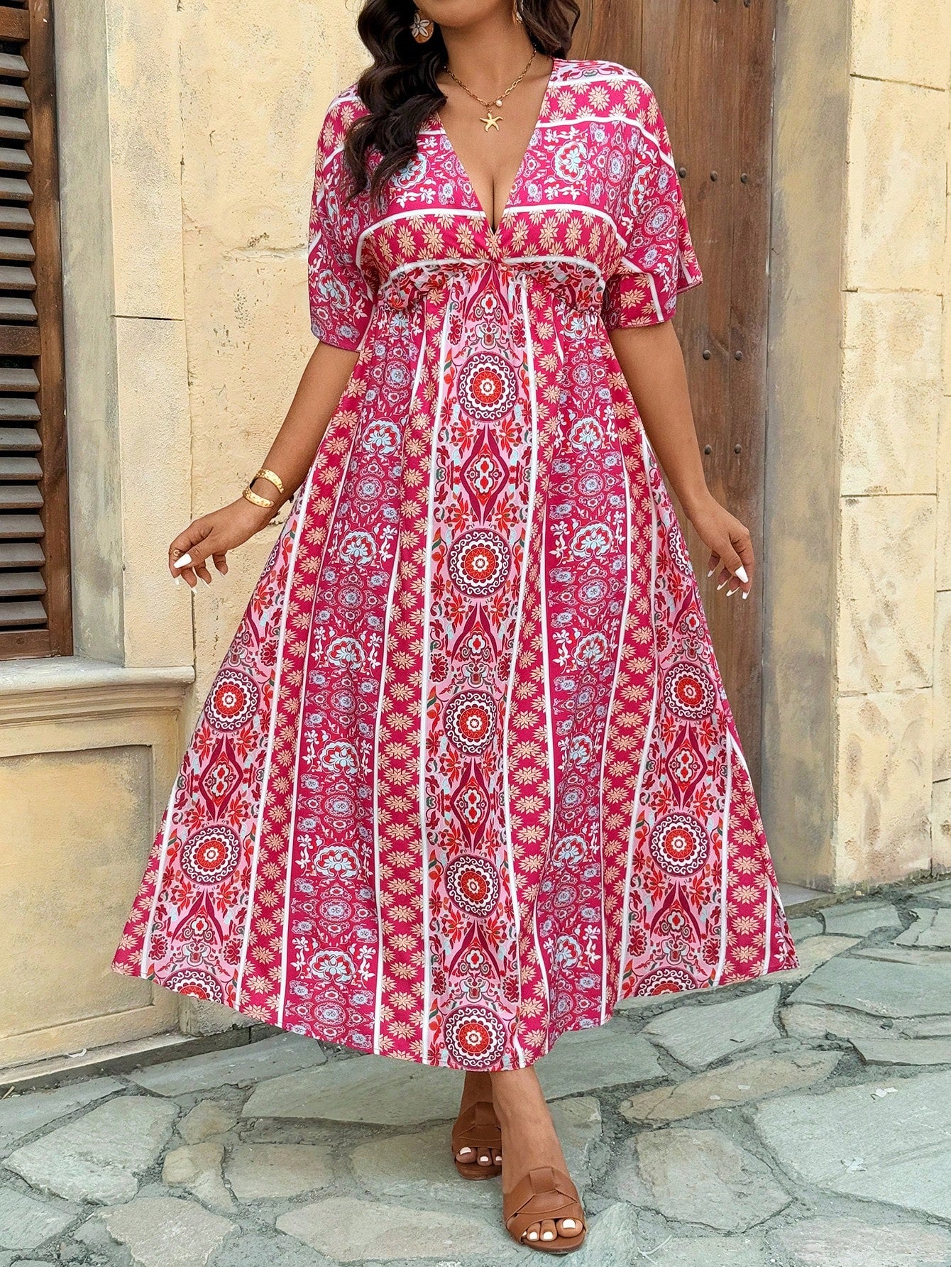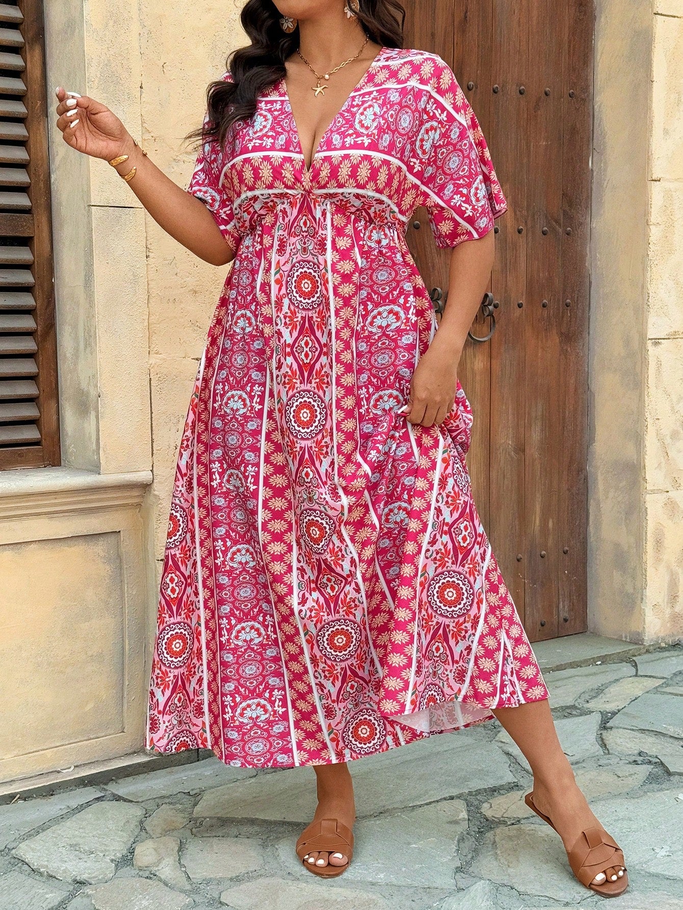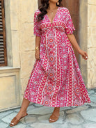 VCAY Plus Size Women Boho Geometric Print Short Sleeve Vacation Dress For Summer Mother's Day