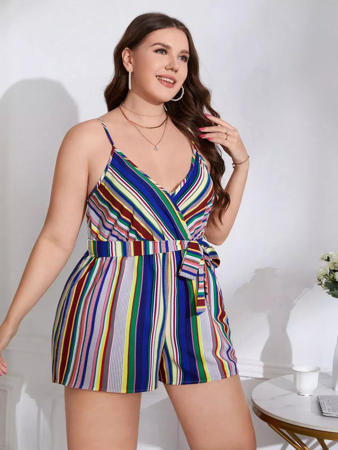 Plus Block Striped Cami Romper Without Belt
