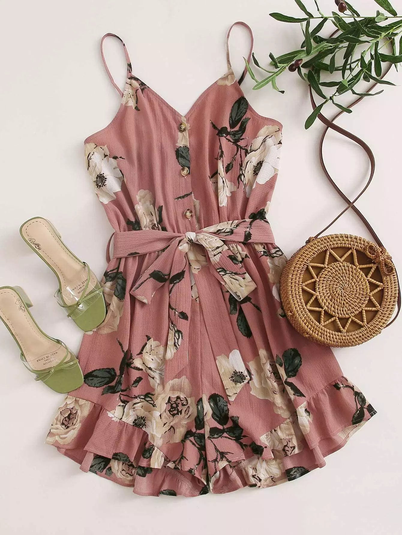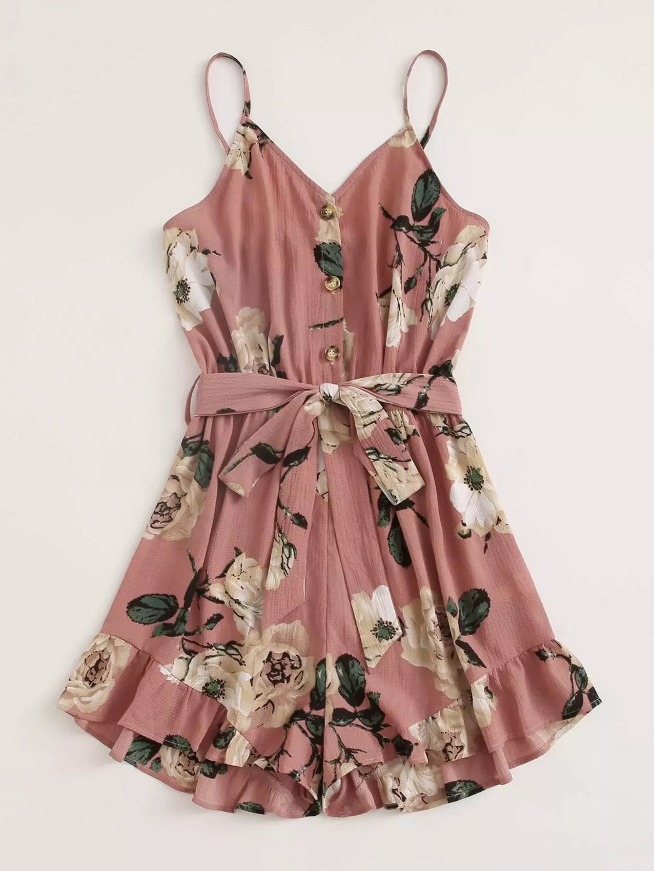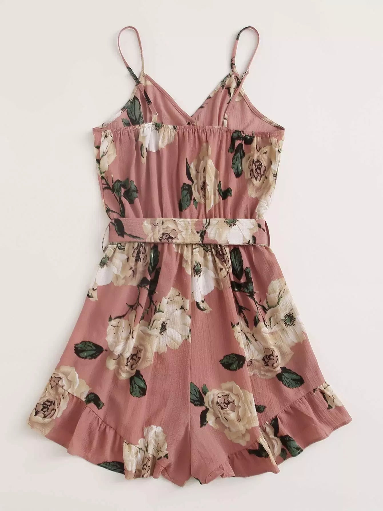 Women - Plus Floral Print Belted Ruffled Cami Romper