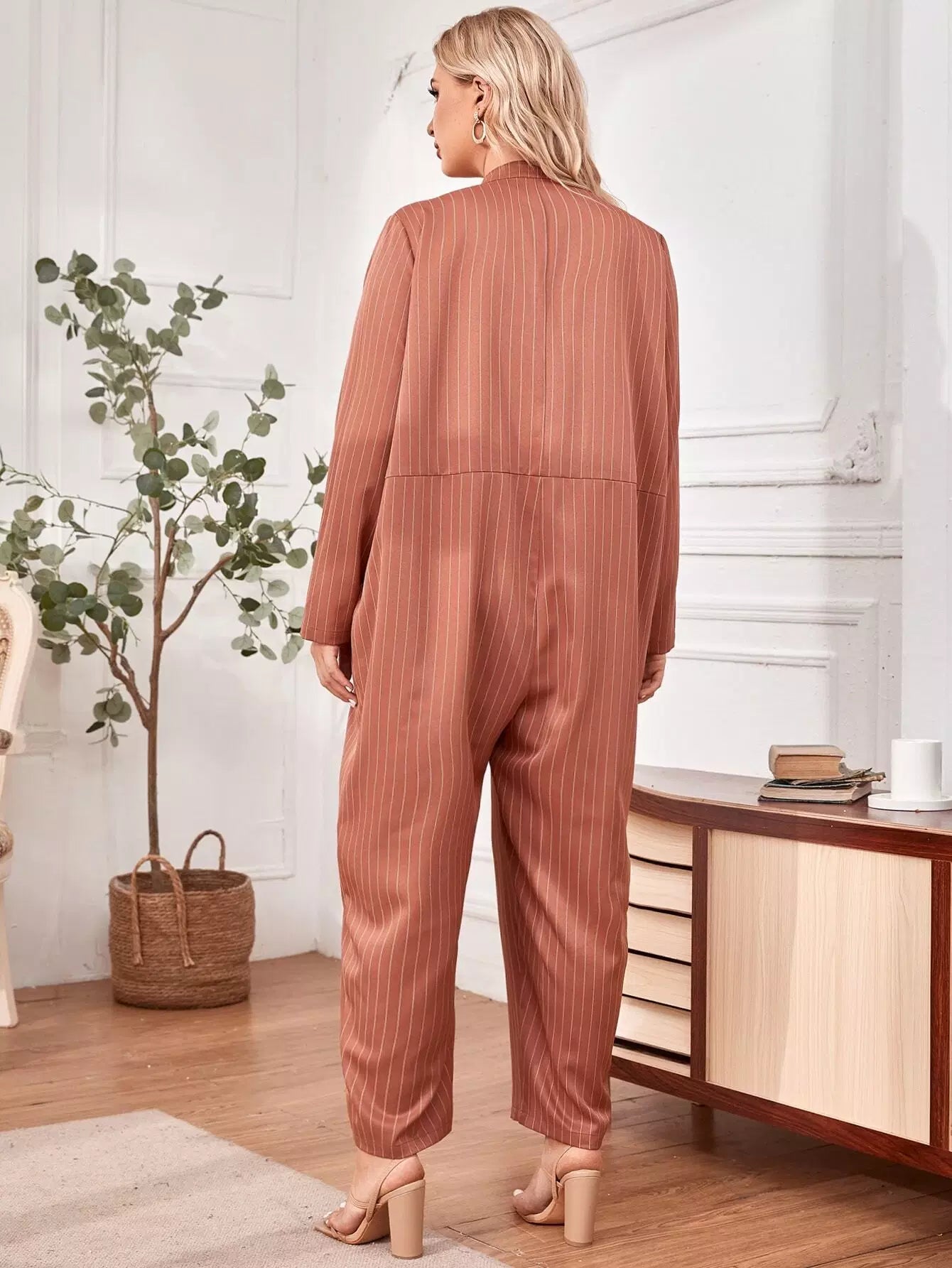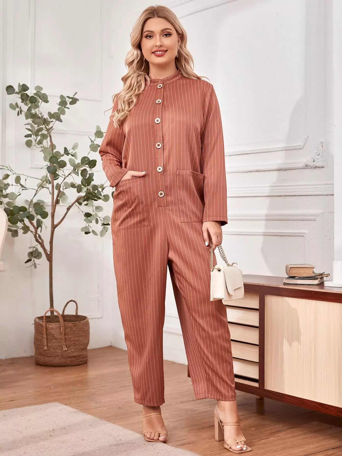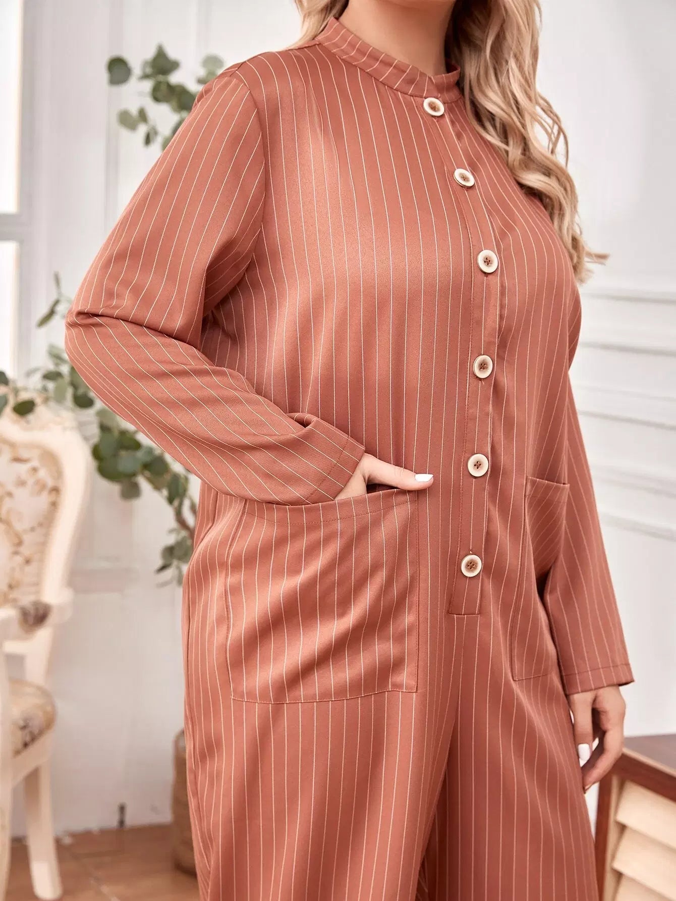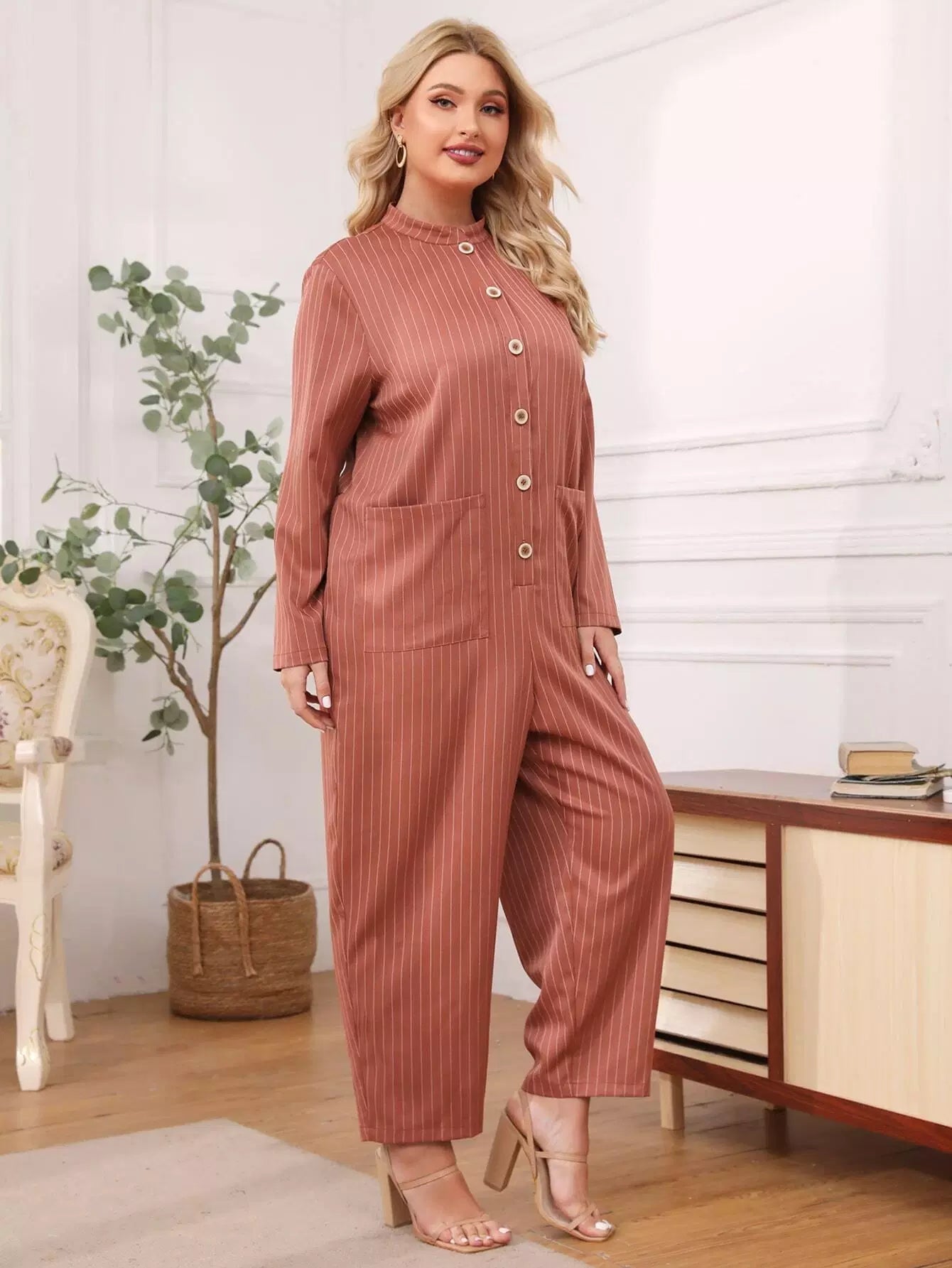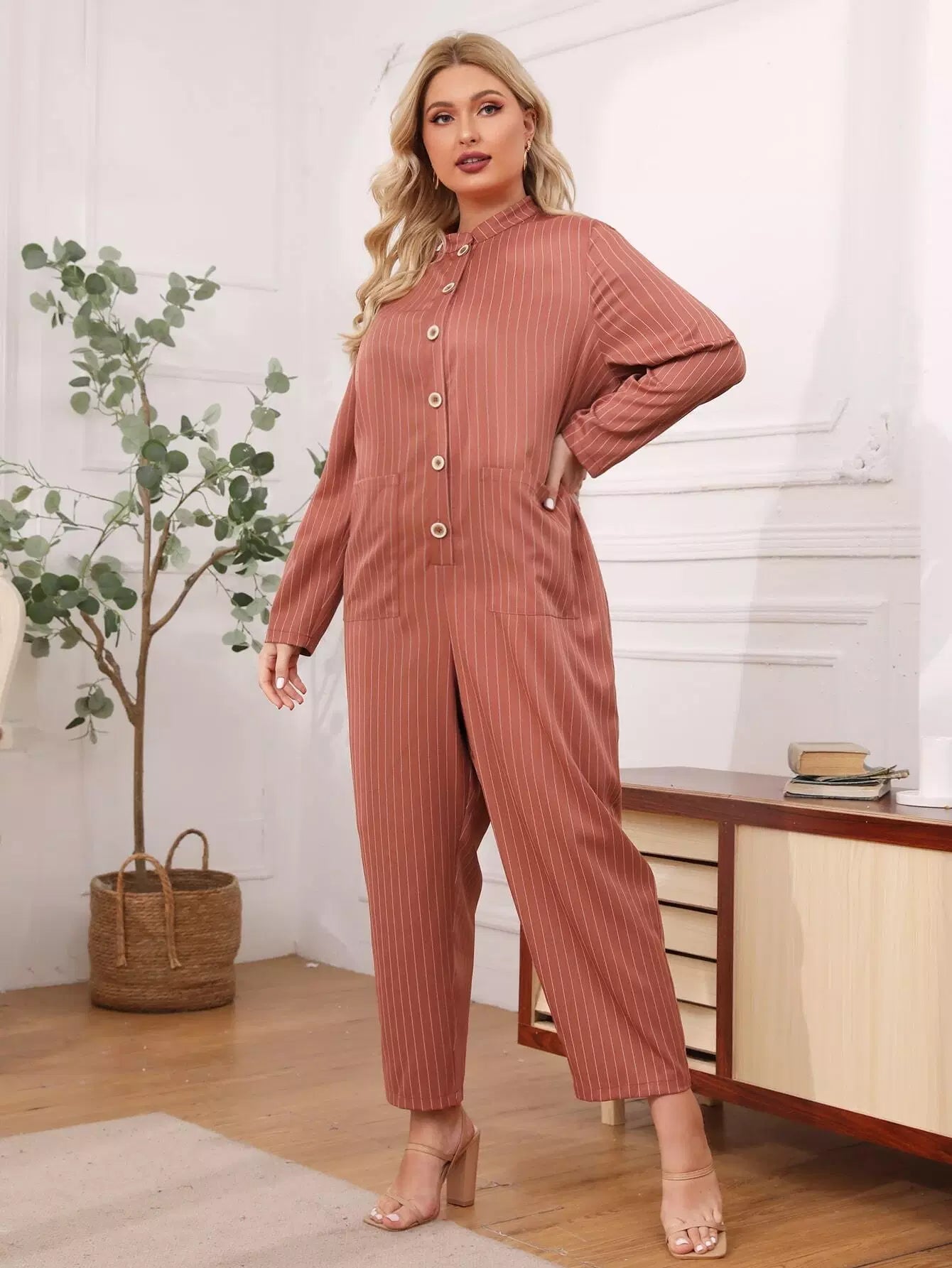 Plus Pinstripe Button Up Dual Pocket Jumpsuit