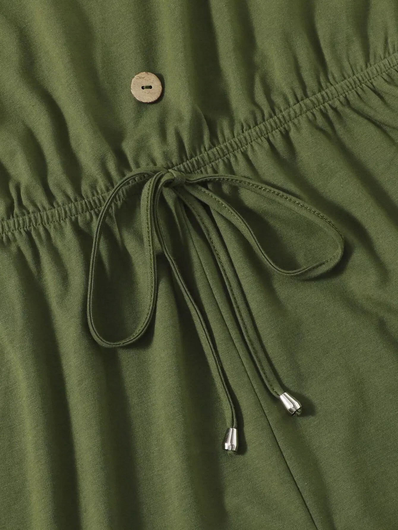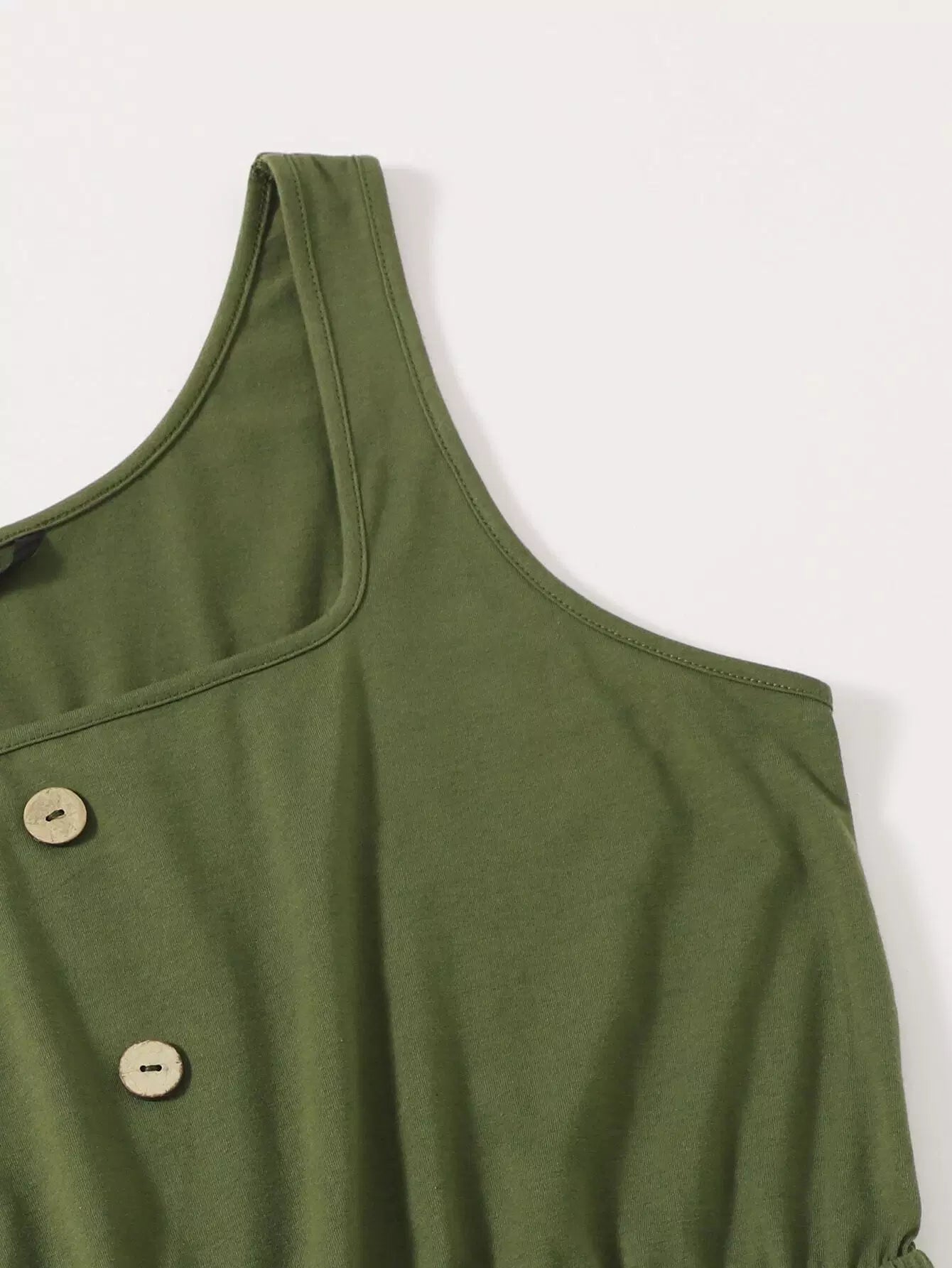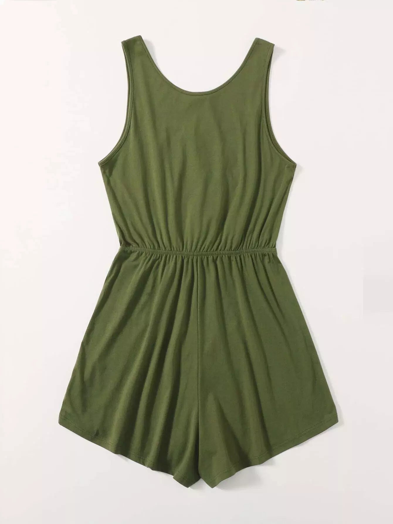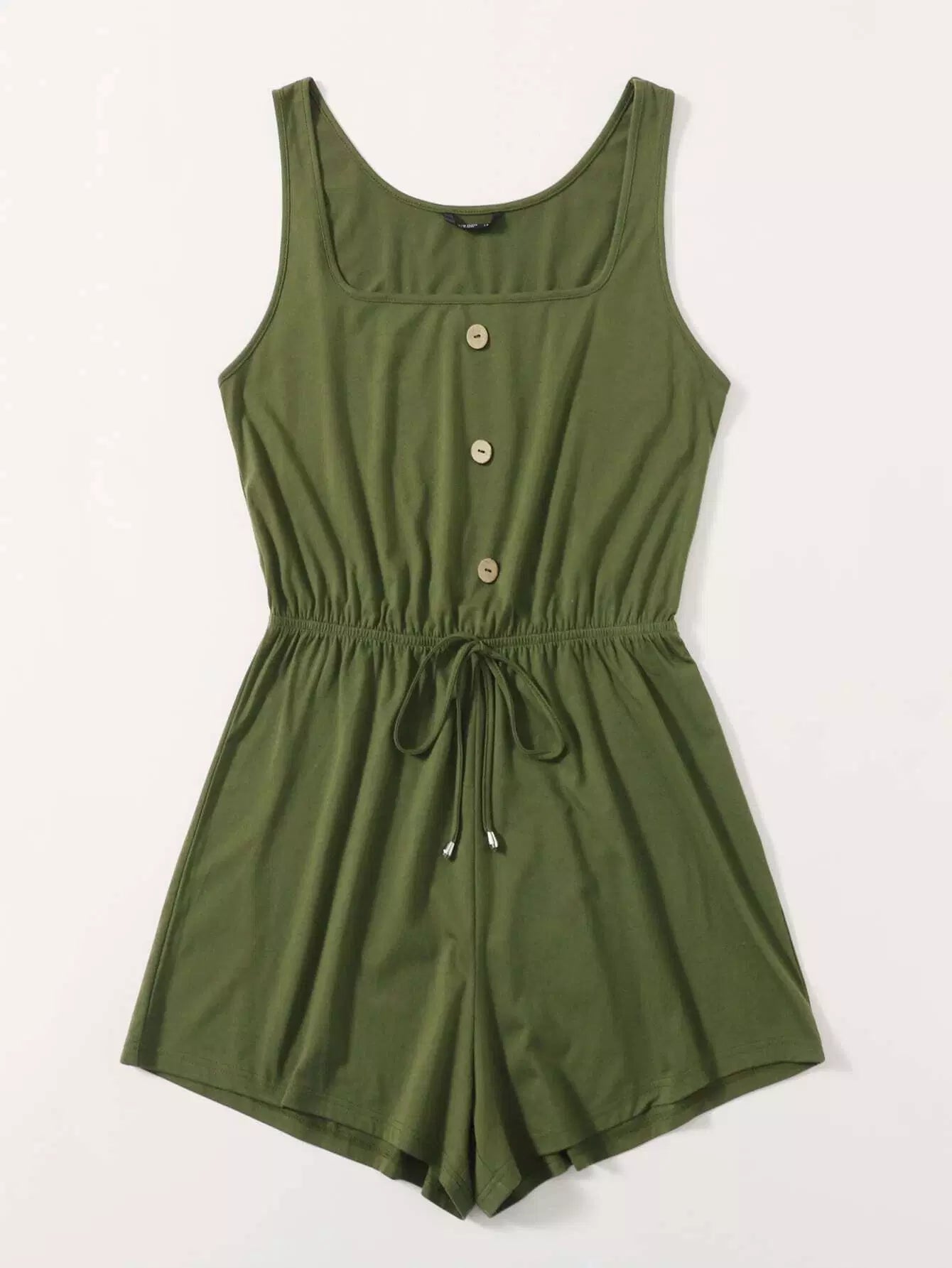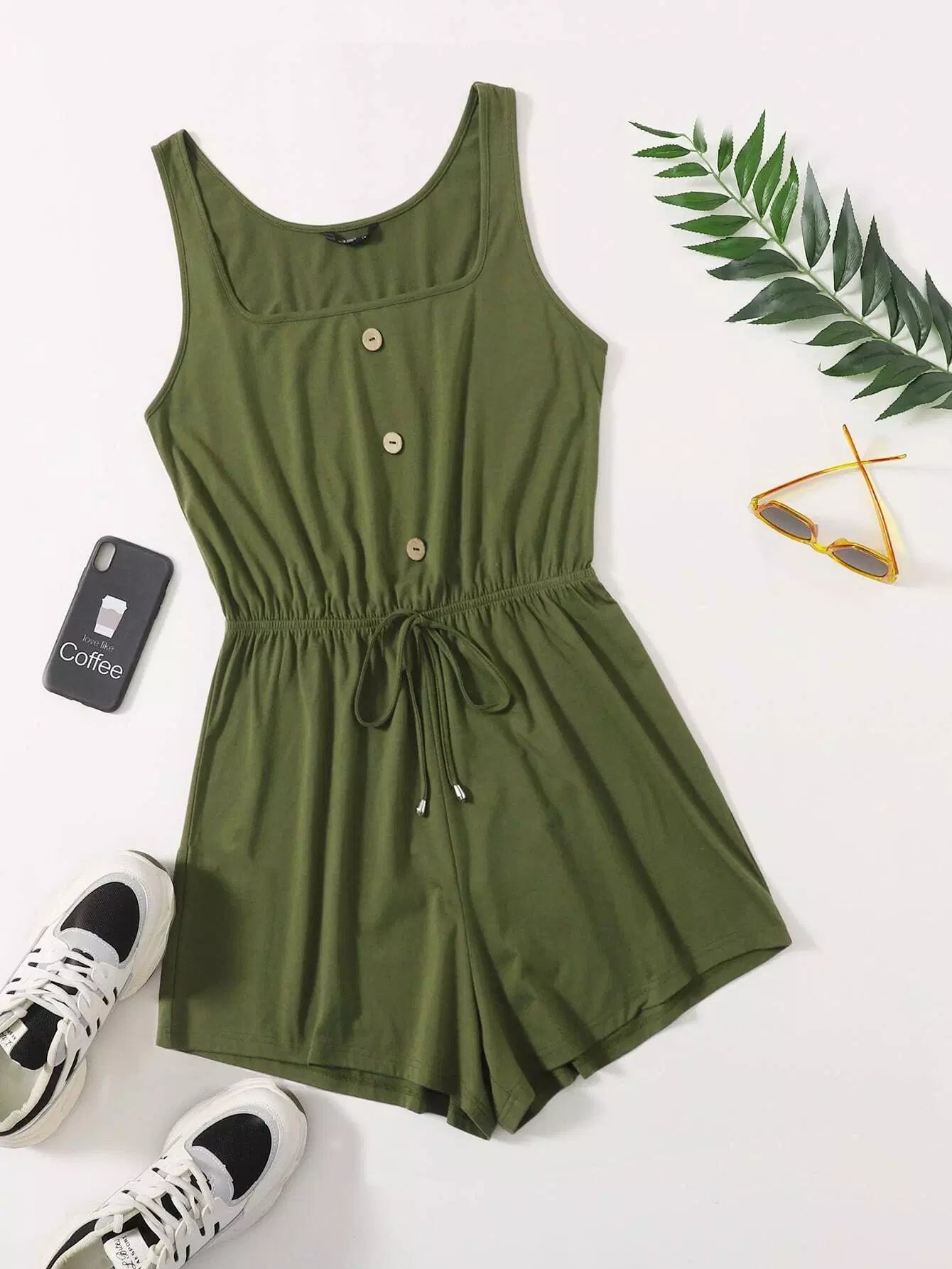 Plus Square Neck Button Detail Knot Waist Tank Romper