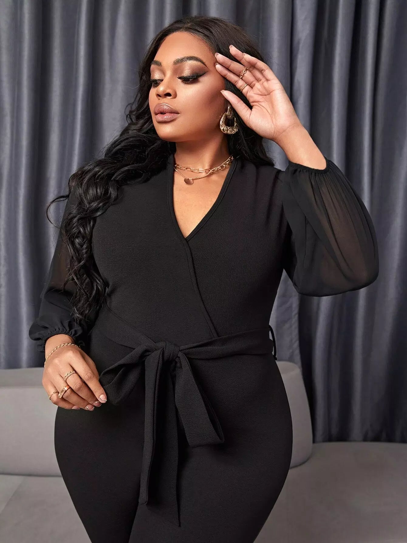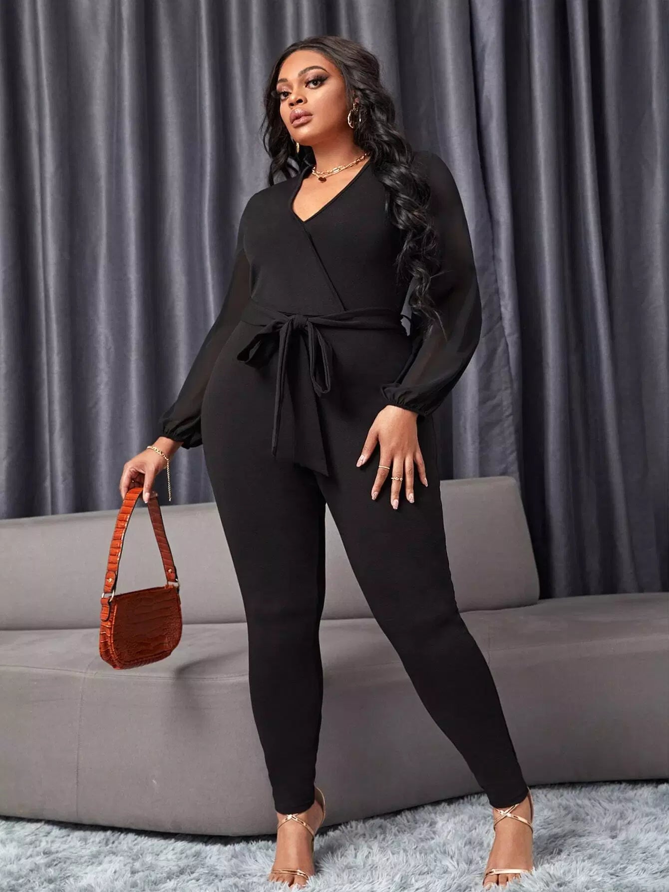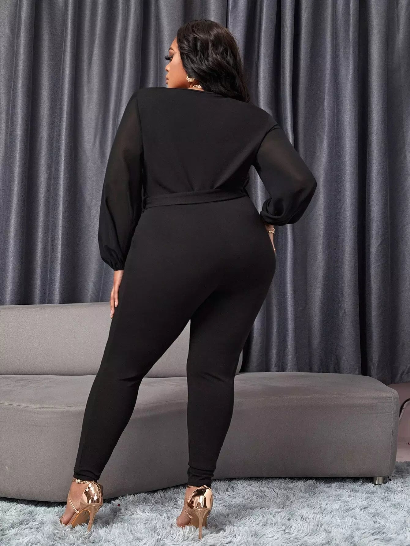 Plus Surplice Neck Contrast Mesh Jumpsuit Without Belt