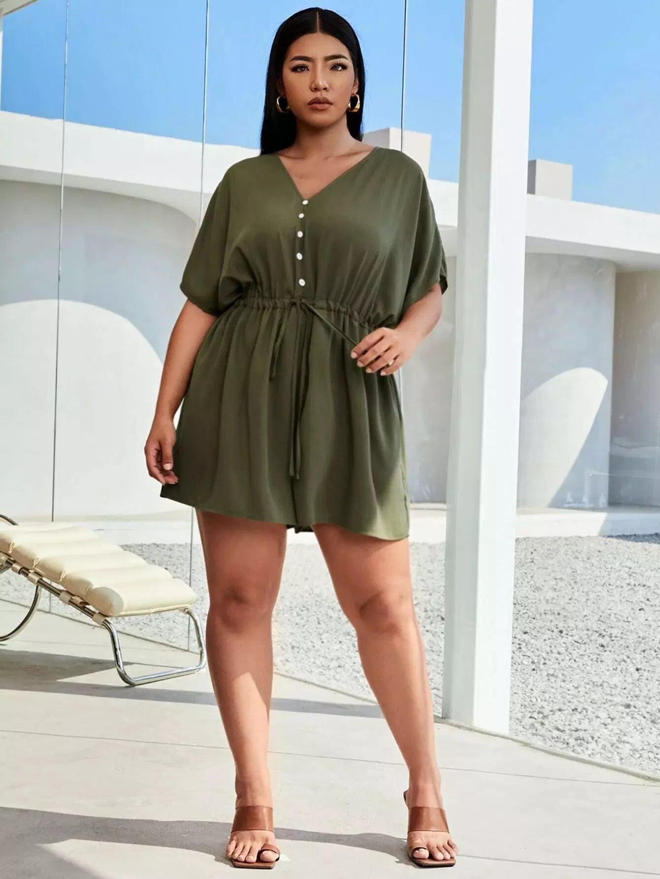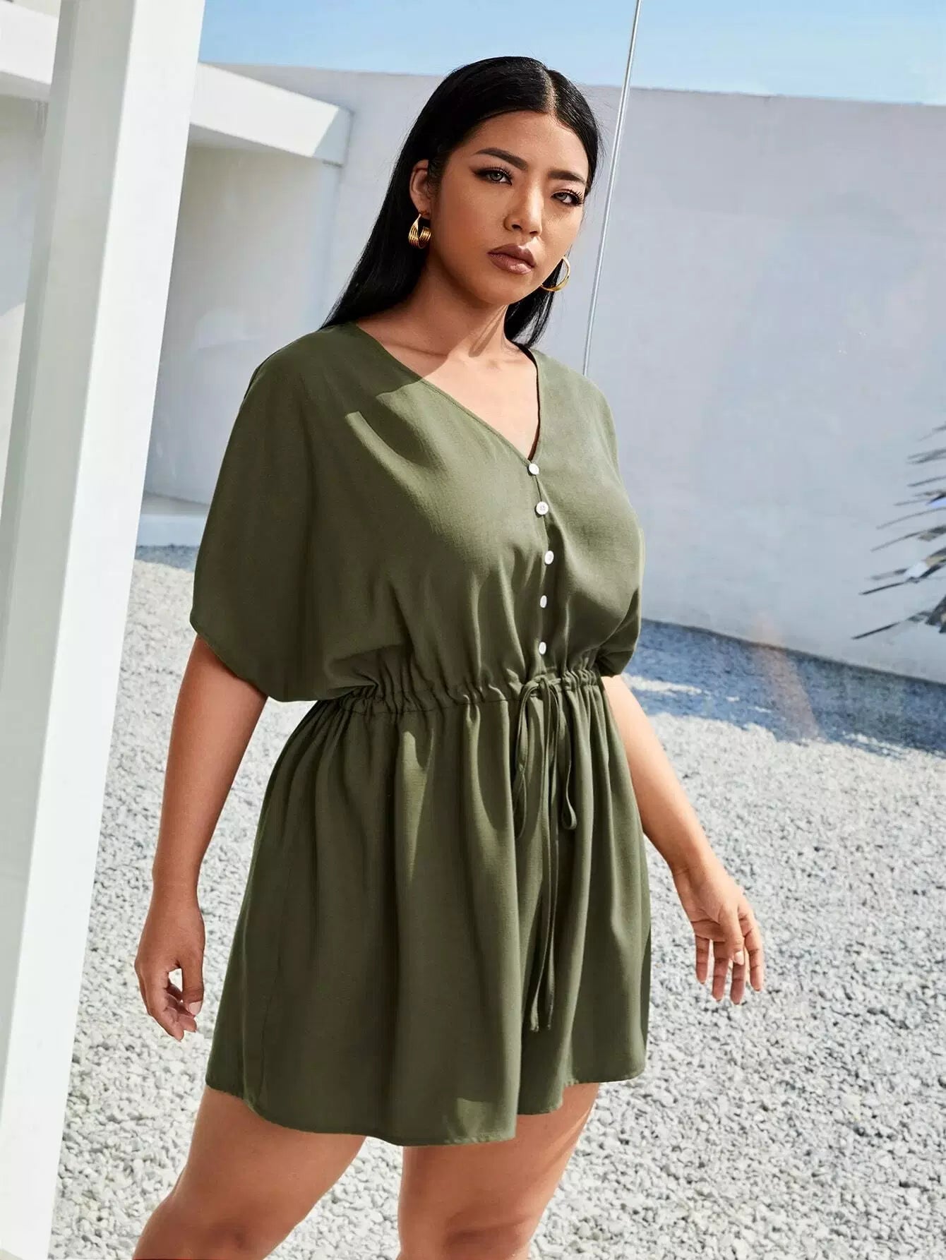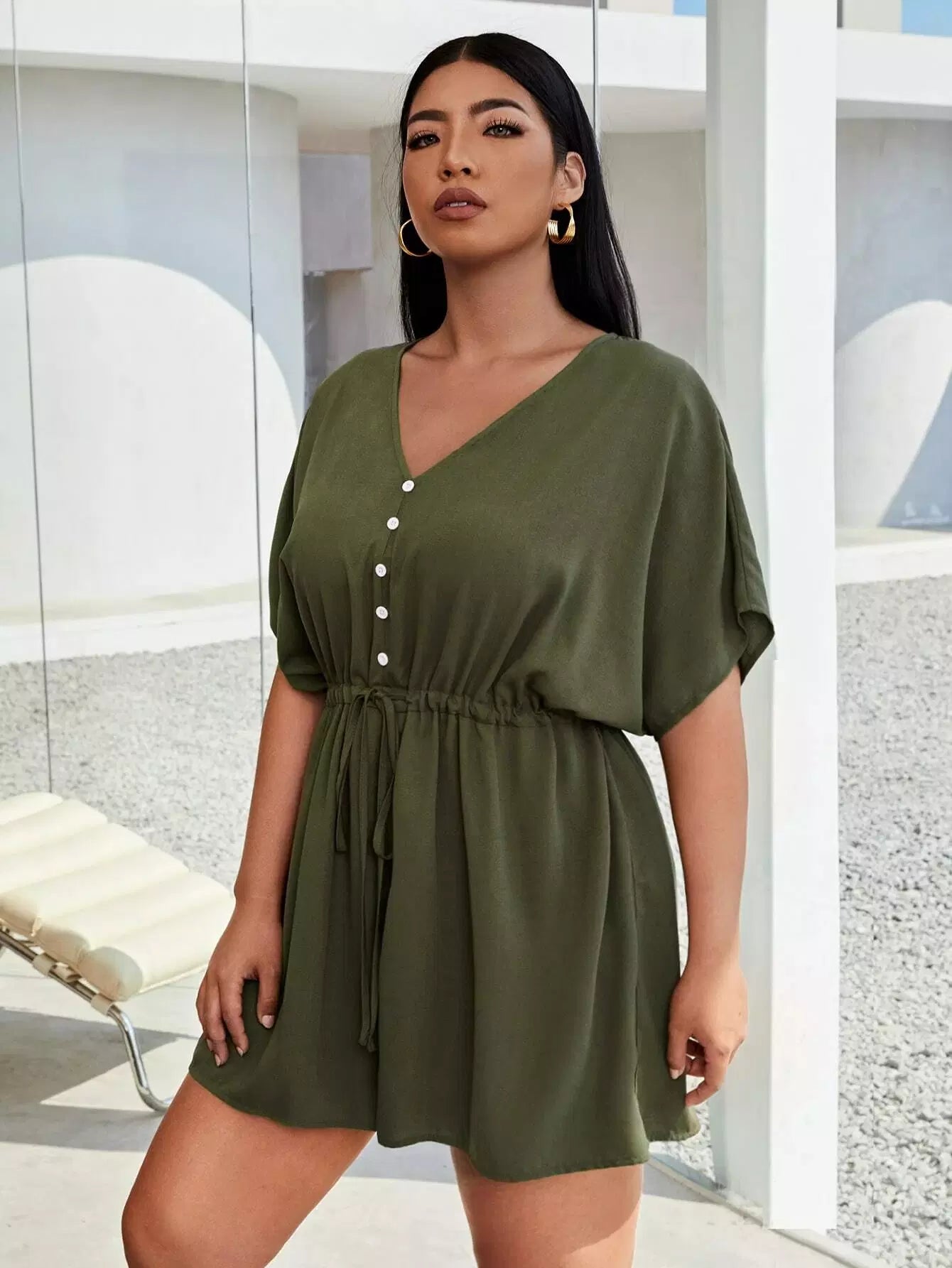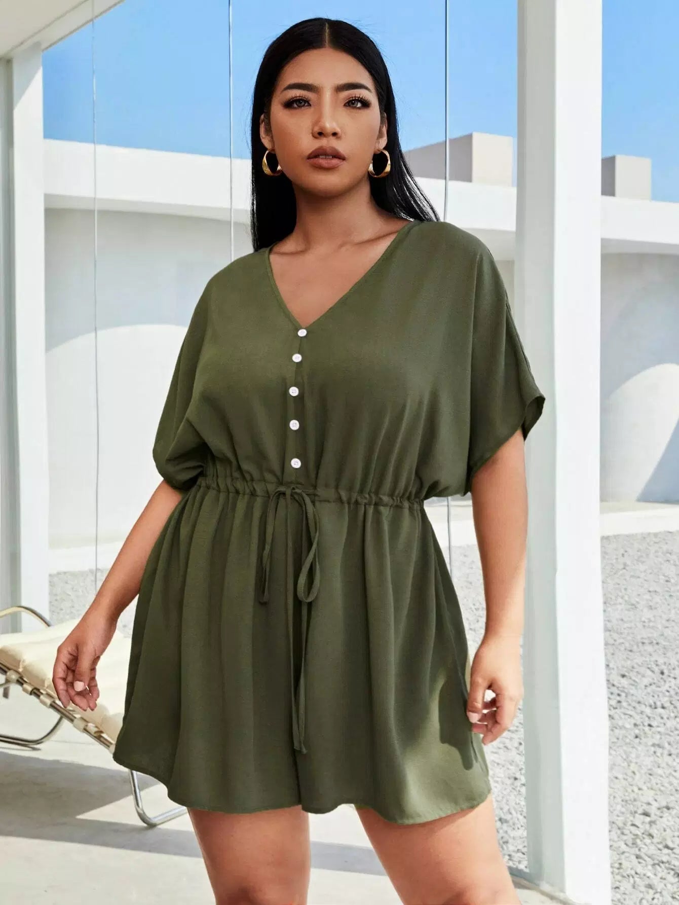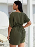 Plus V-neck Batwing Sleeve Drawstring Waist Romper