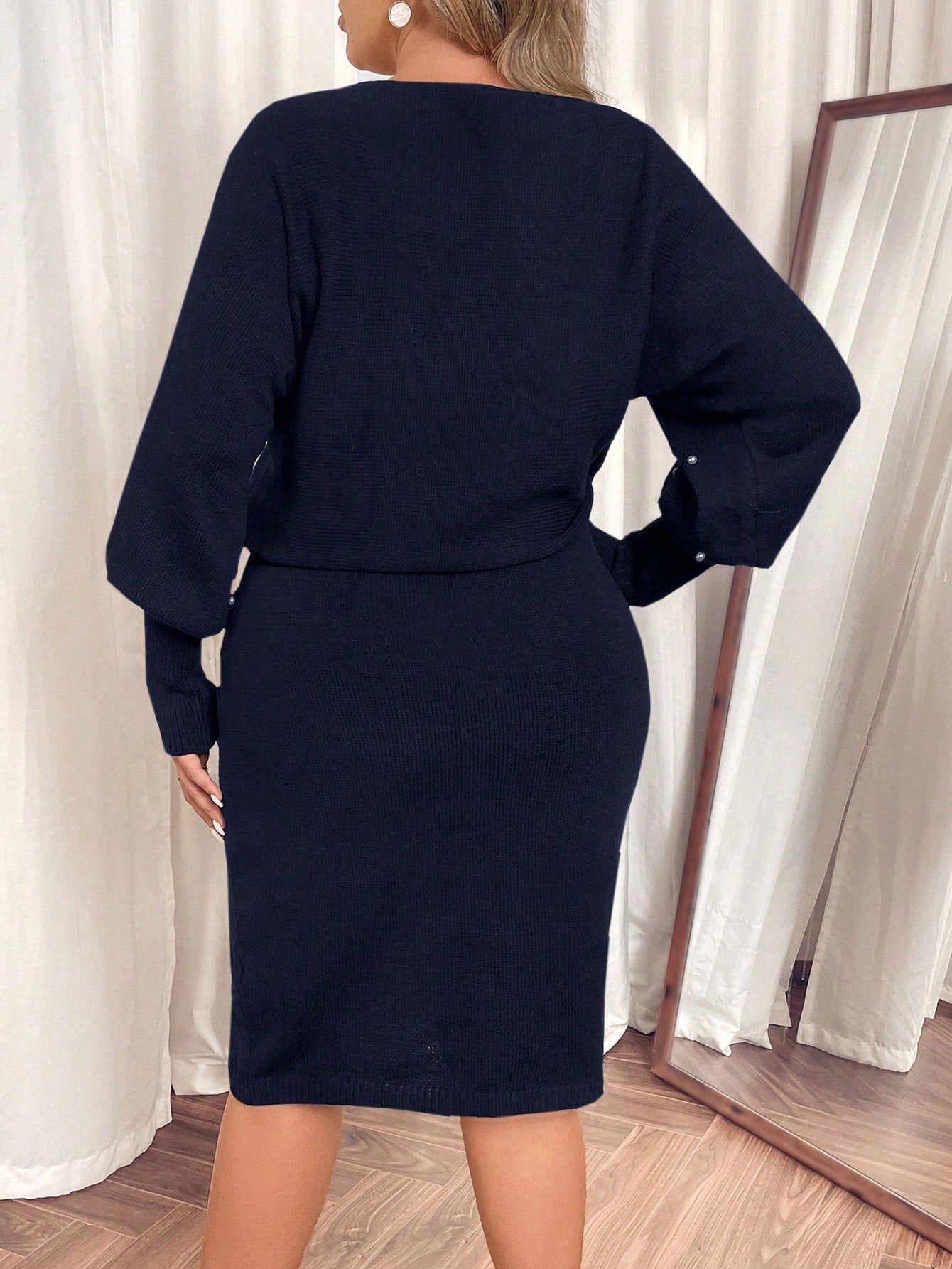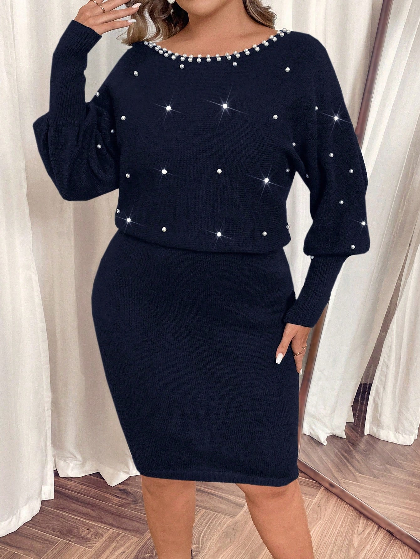 Clasi Plus Size Off-Shoulder Pearl Beaded Batwing Sleeve Cinched Waist Black Sweater Dressbusiness Casual