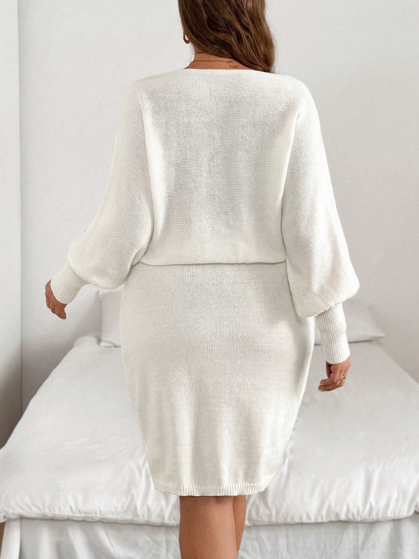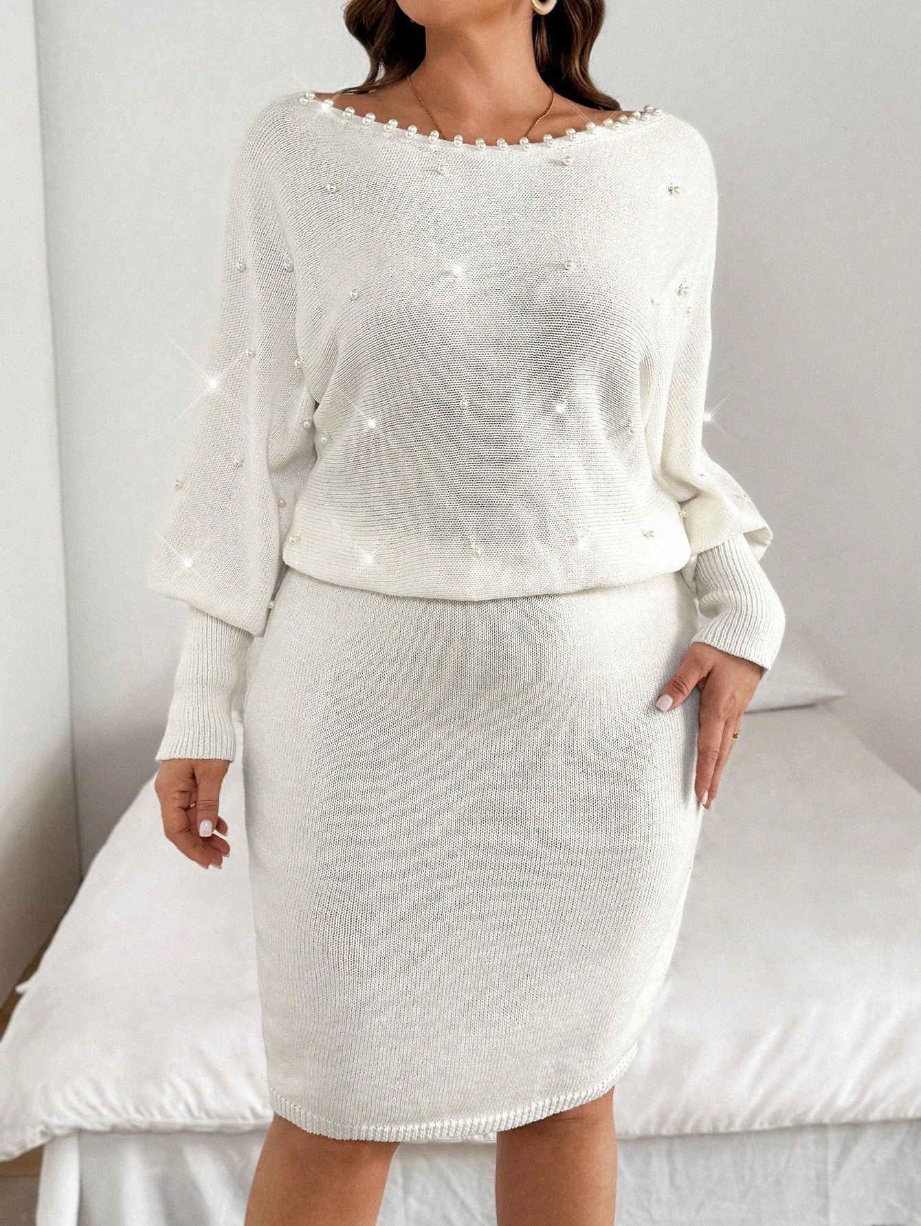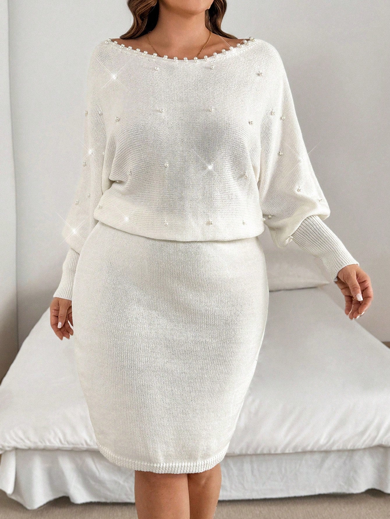 Clasi Plus Size Off-Shoulder Pearl Beaded Batwing Sleeve Cinched Waist Black Sweater Dressbusiness Casual