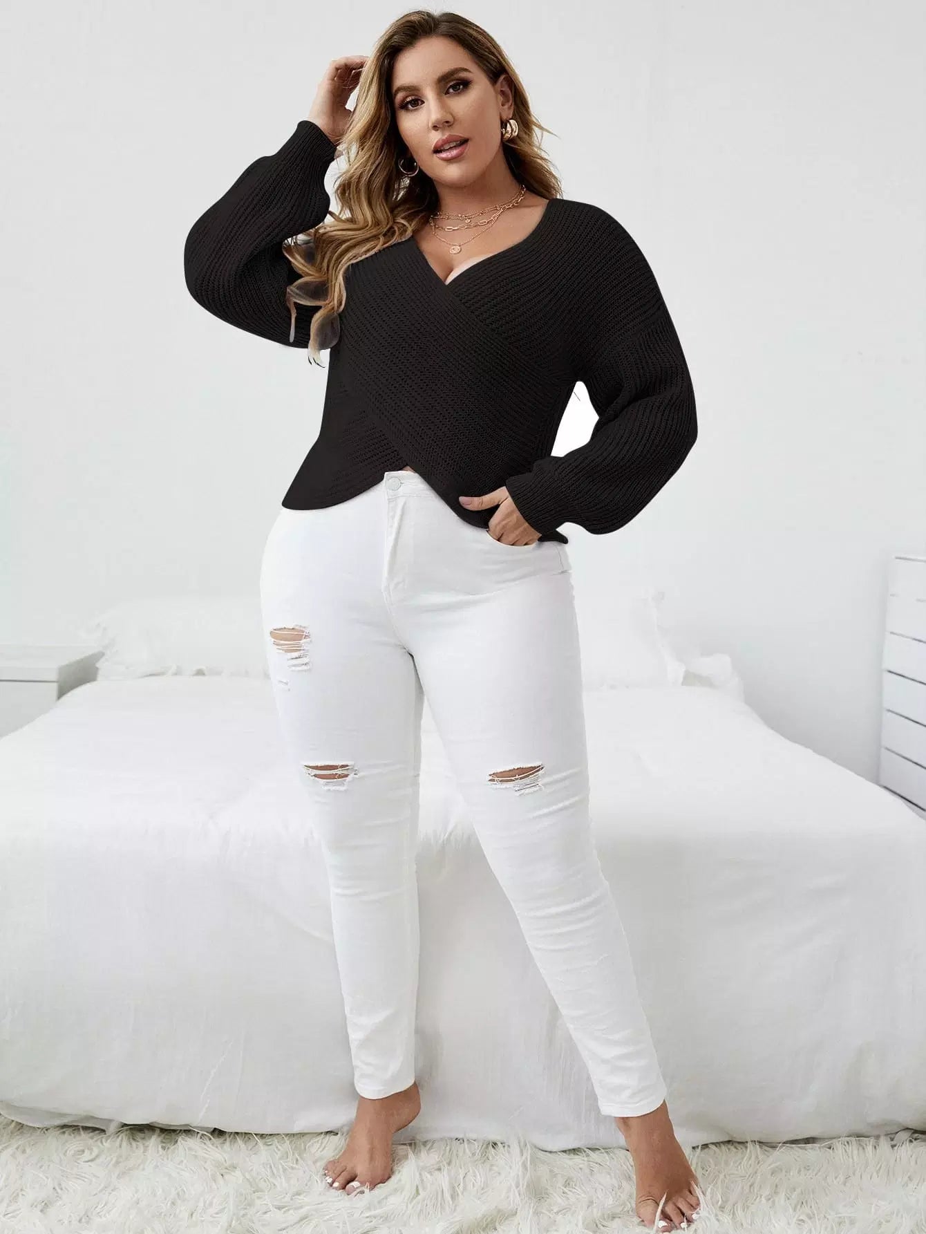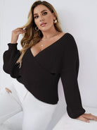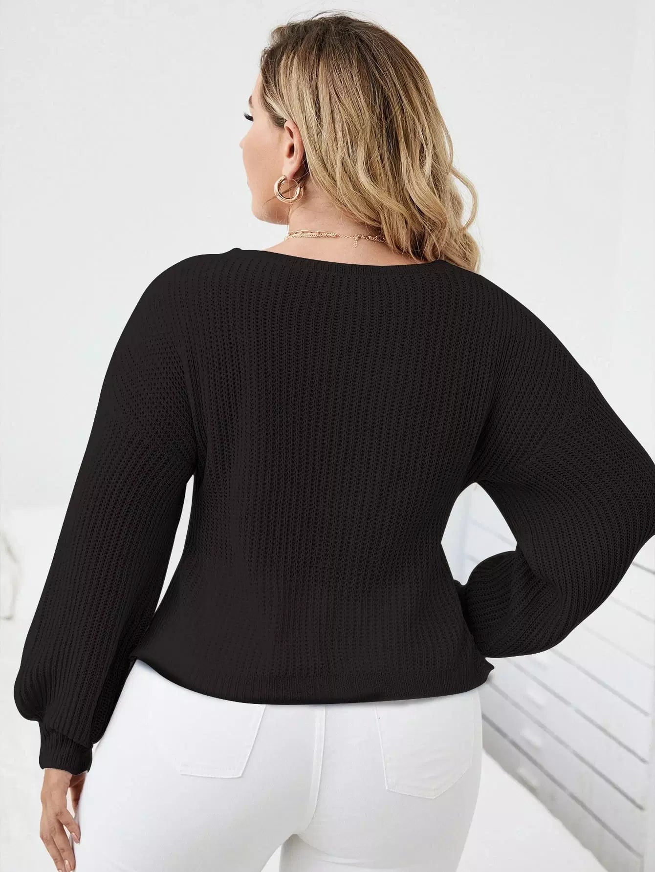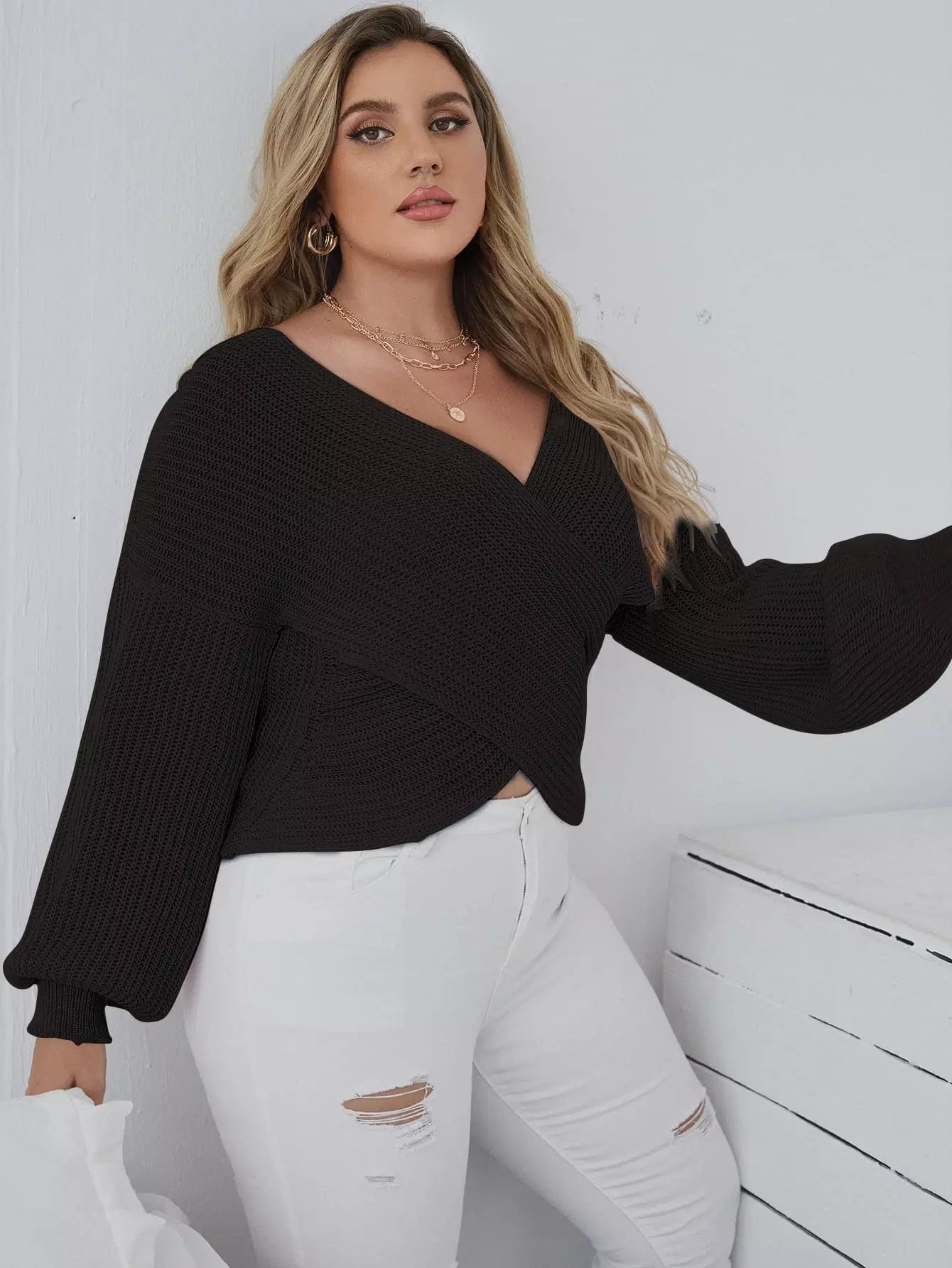 Plus Drop Shoulder Bishop Sleeve Criss Cross Wrap Sweater