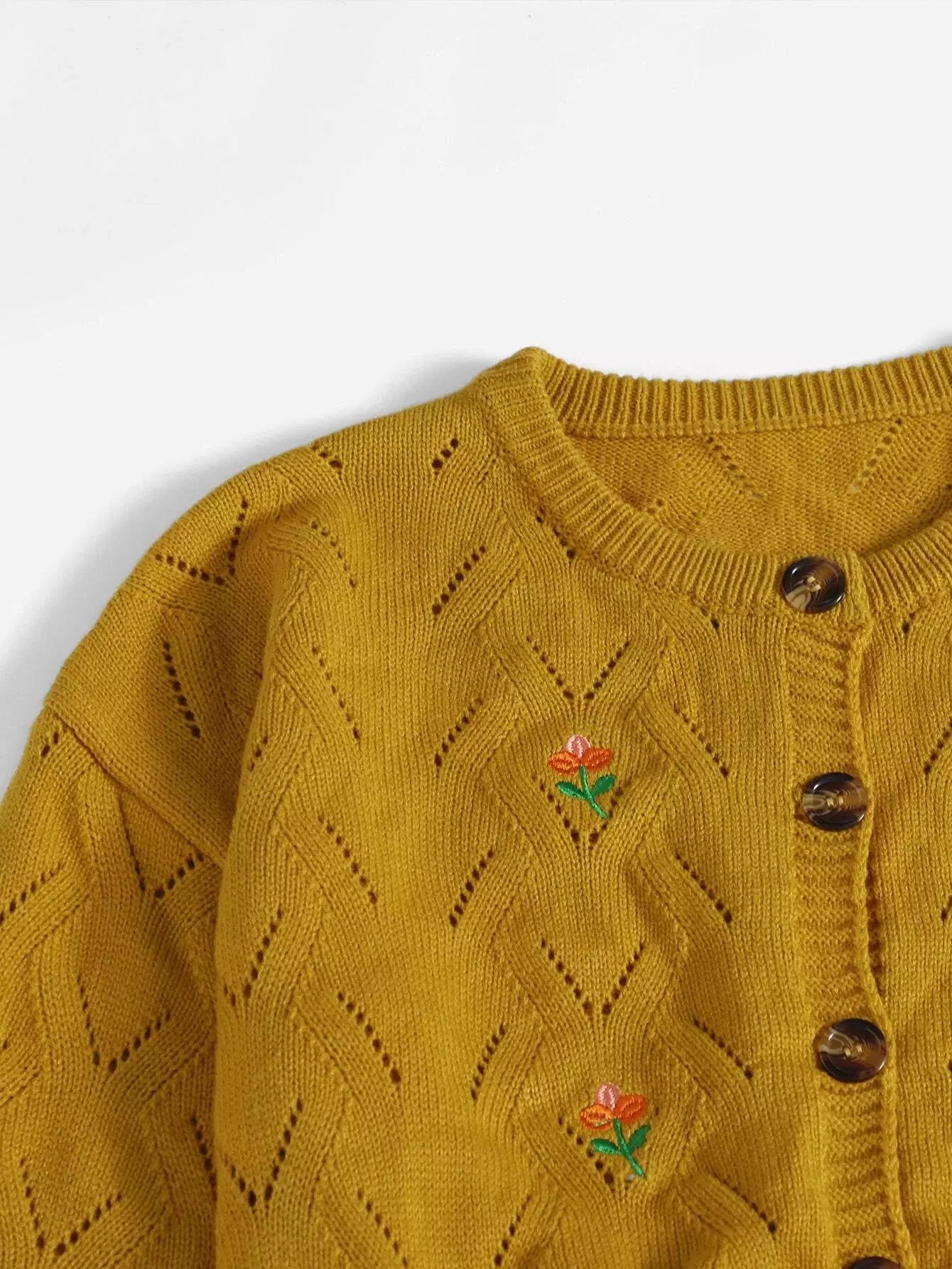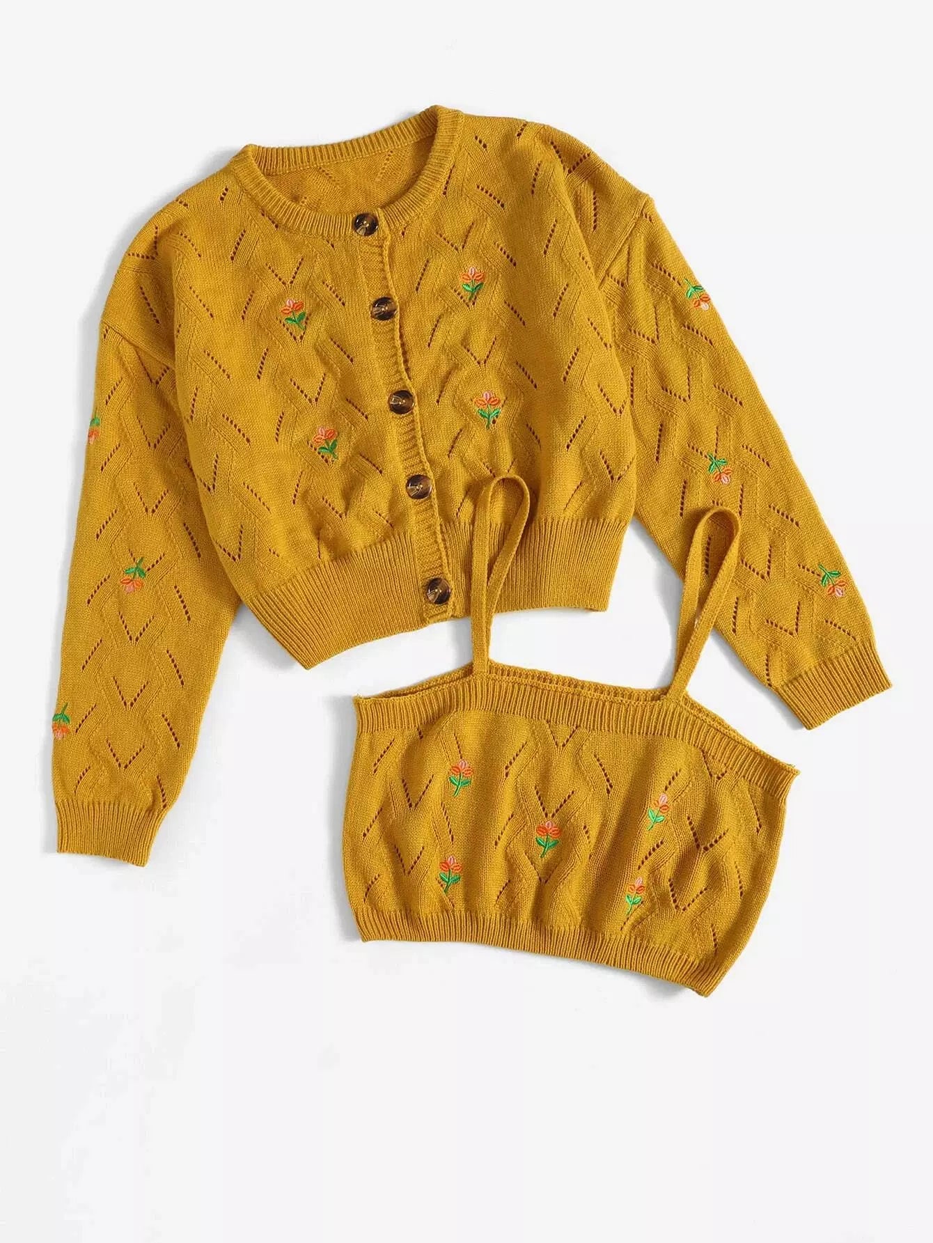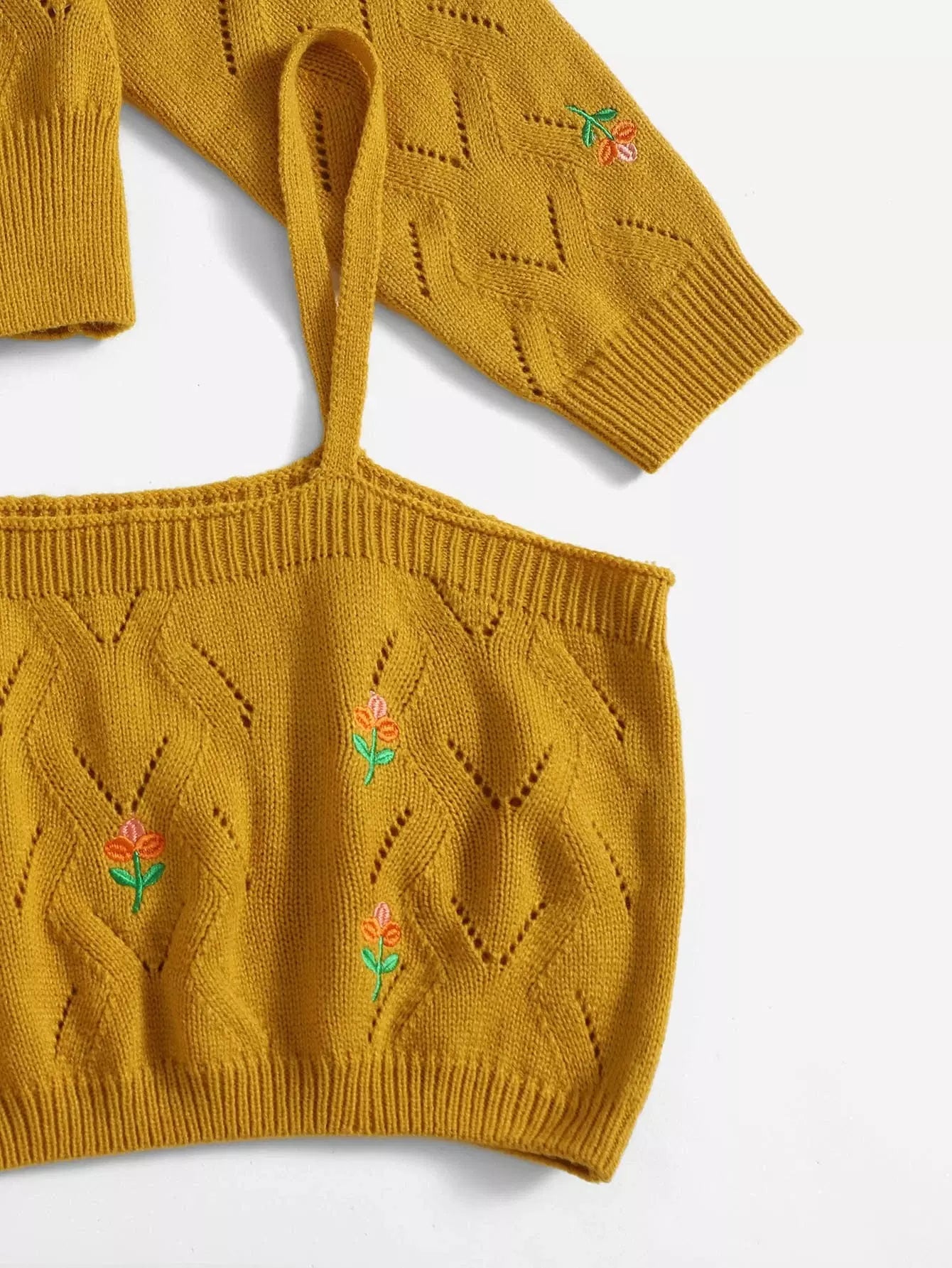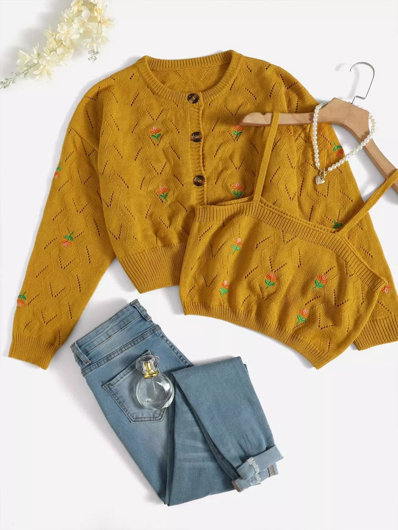 Plus Floral Embroidery Pointelle Knit Cardigan & Crop Knit Cami Top