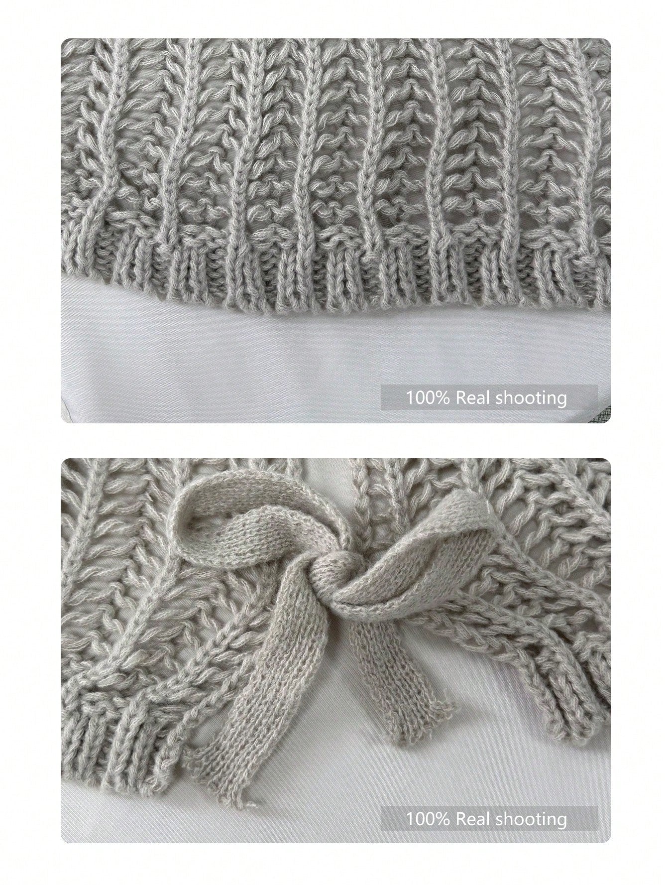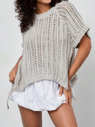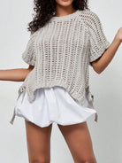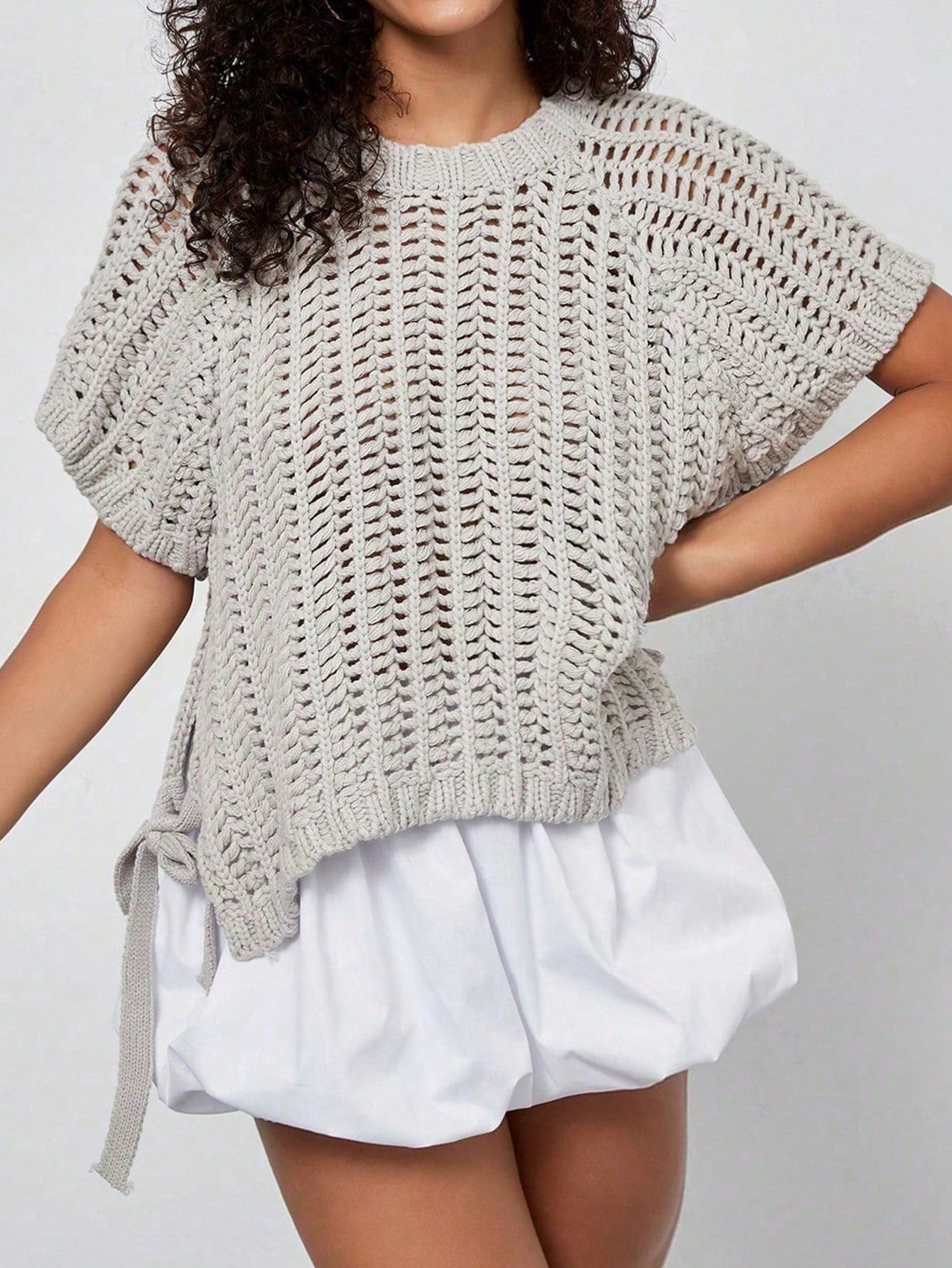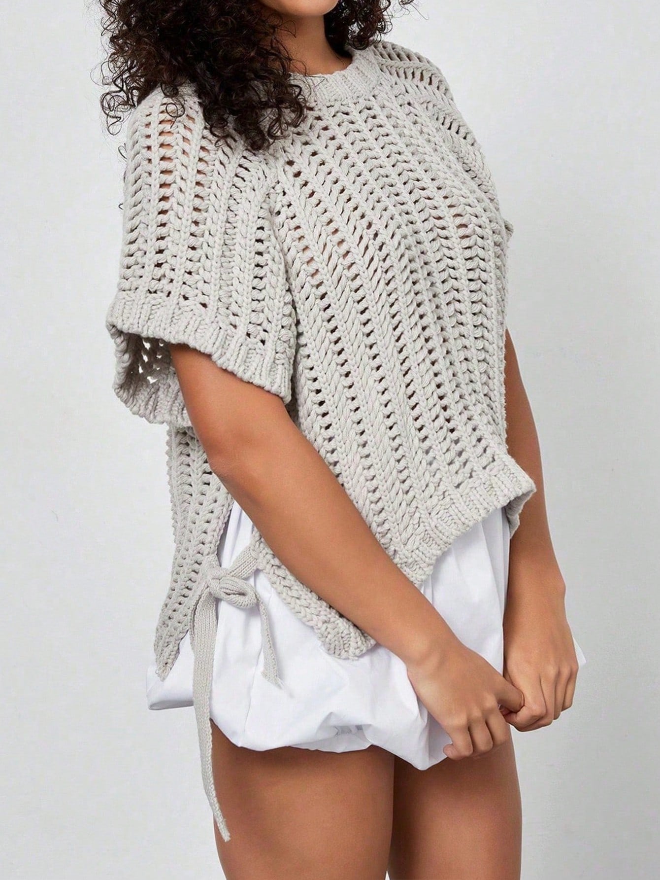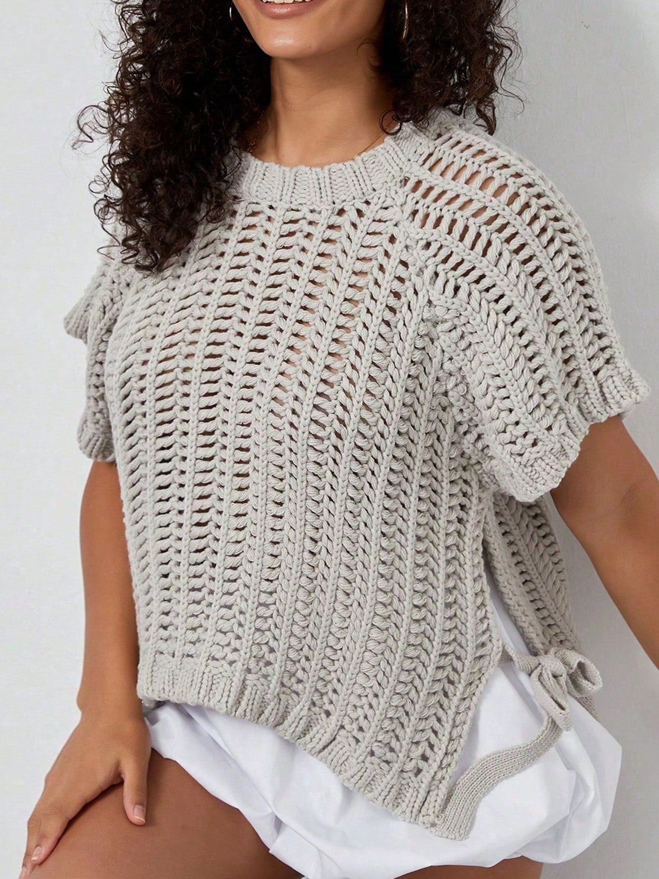 Plus Size Women's Casual Loose Versatile Short Sleeve Knit Top With Fashionable Hem Slit And Tie Design