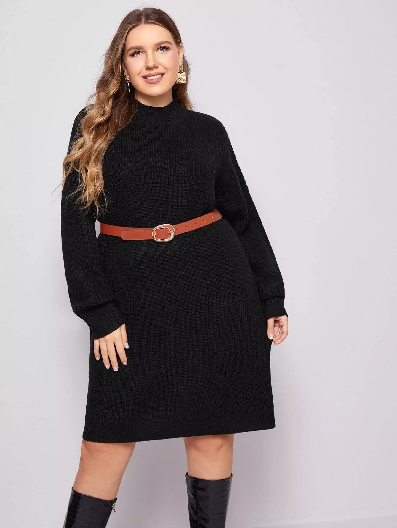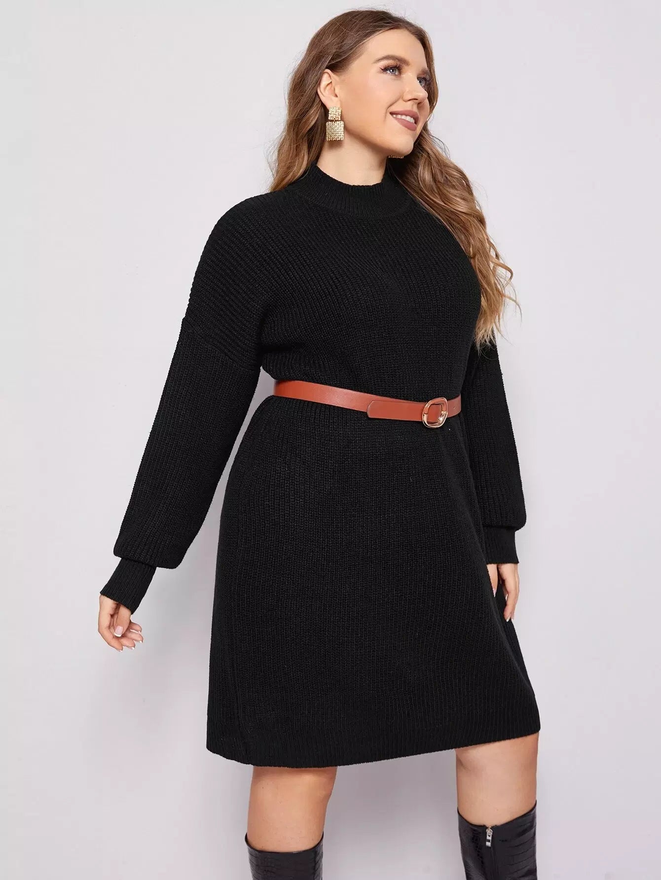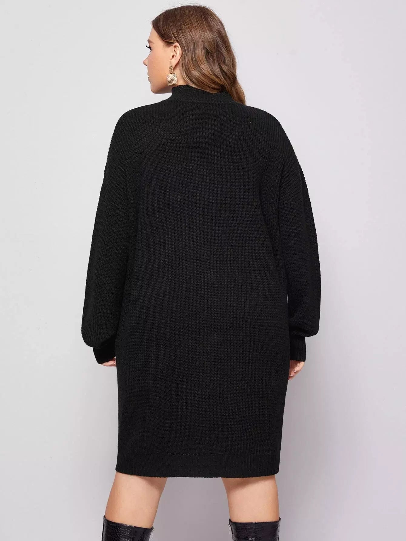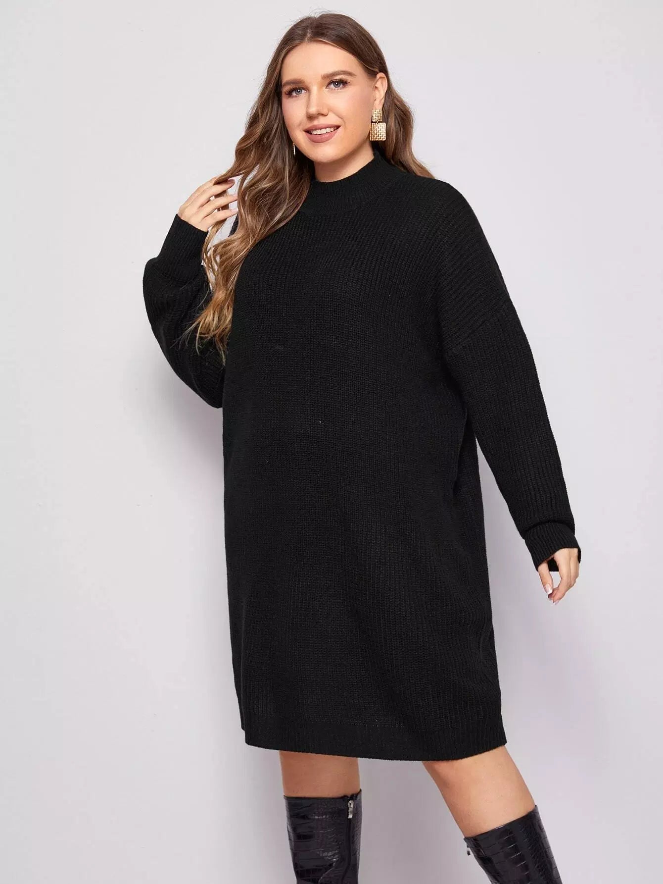 Plus Mock Neck Drop Shoulder Ribbed Knit Sweater Dress Without Belt