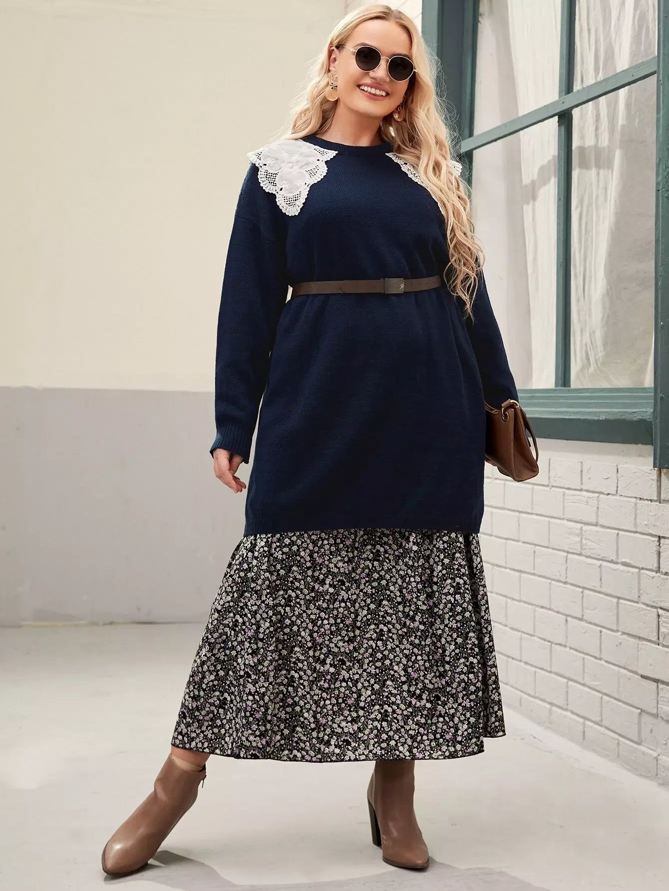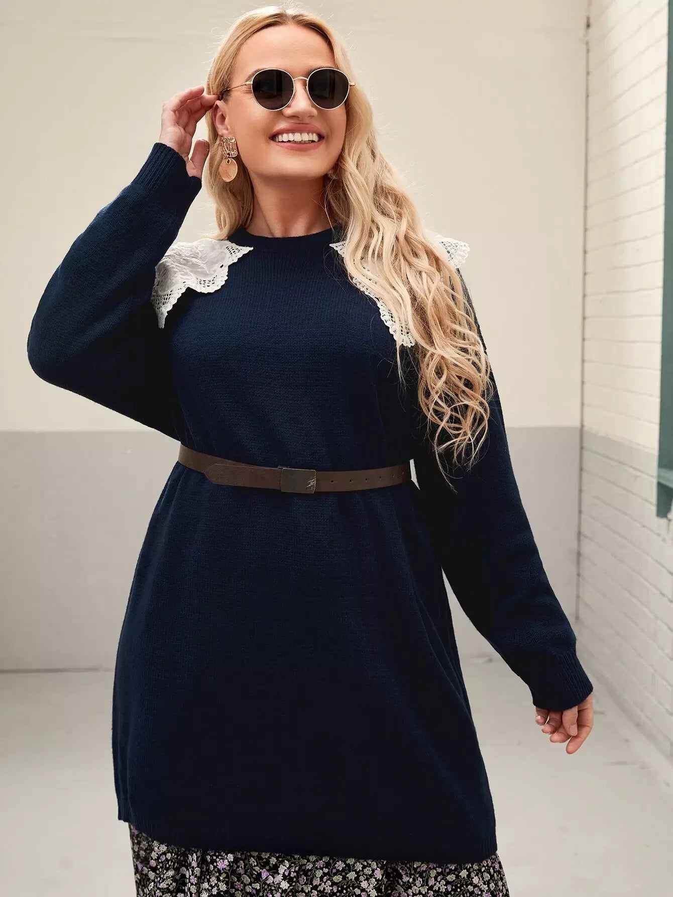 Plus Statement Collar Drop Shoulder Sweater Dress Without Belt