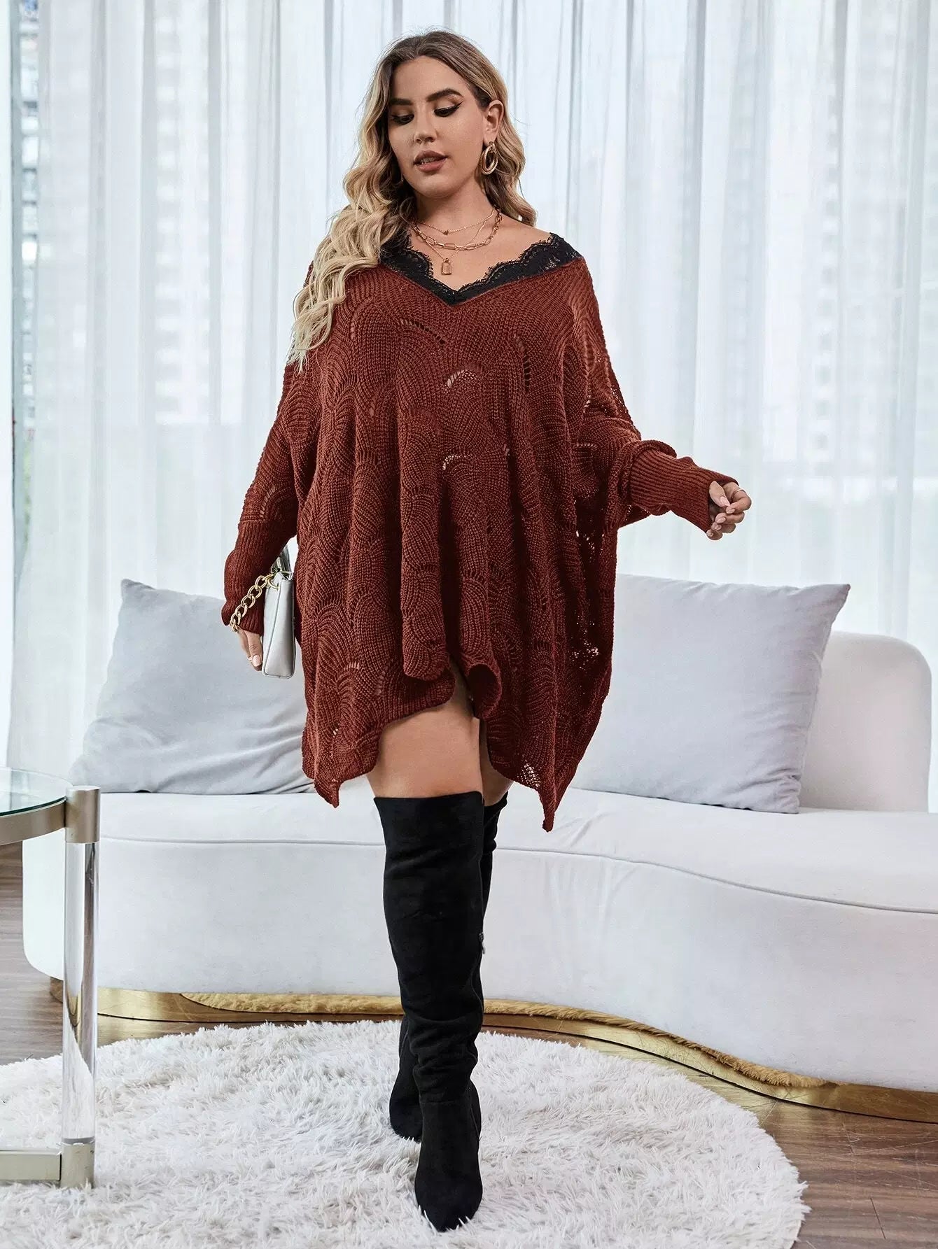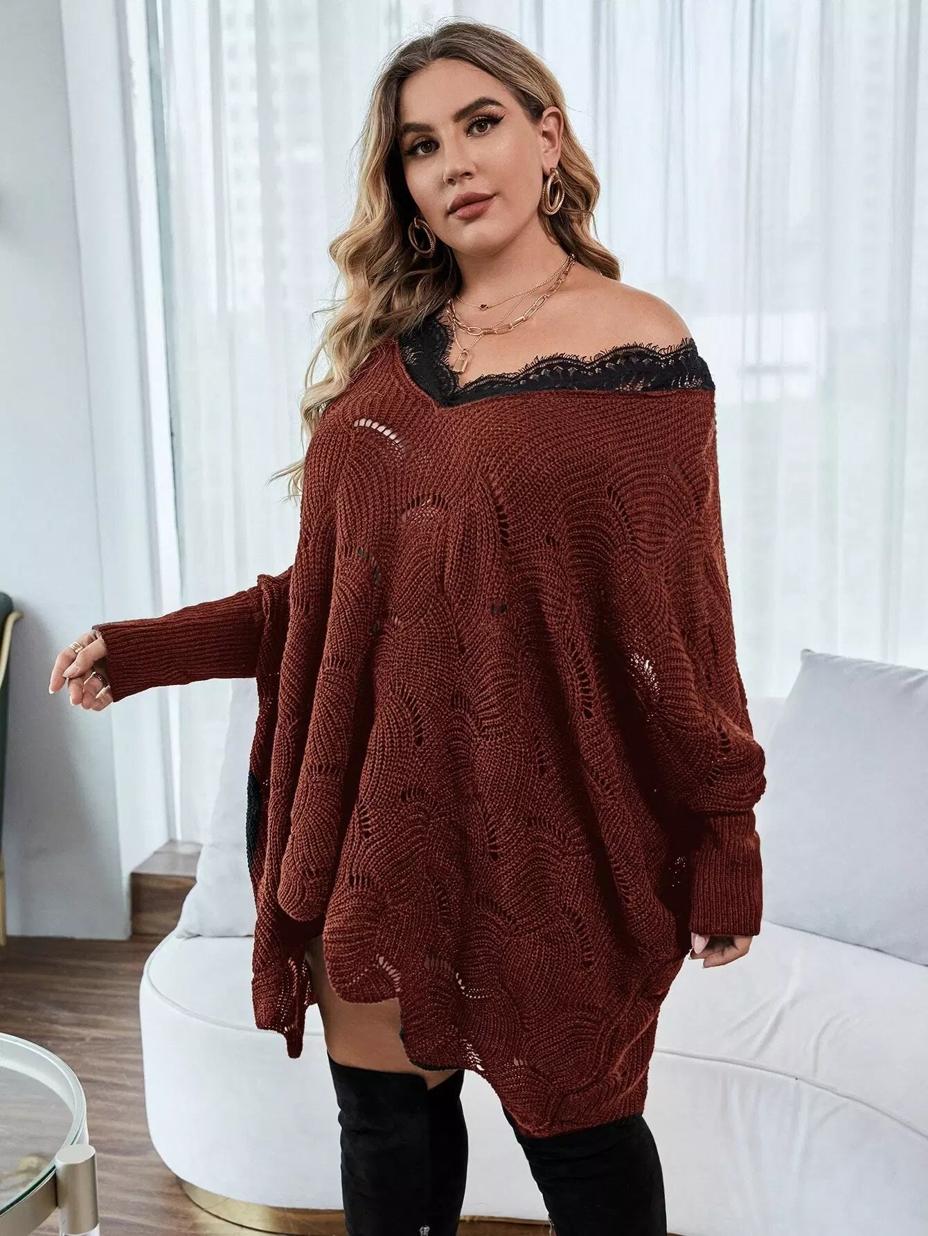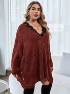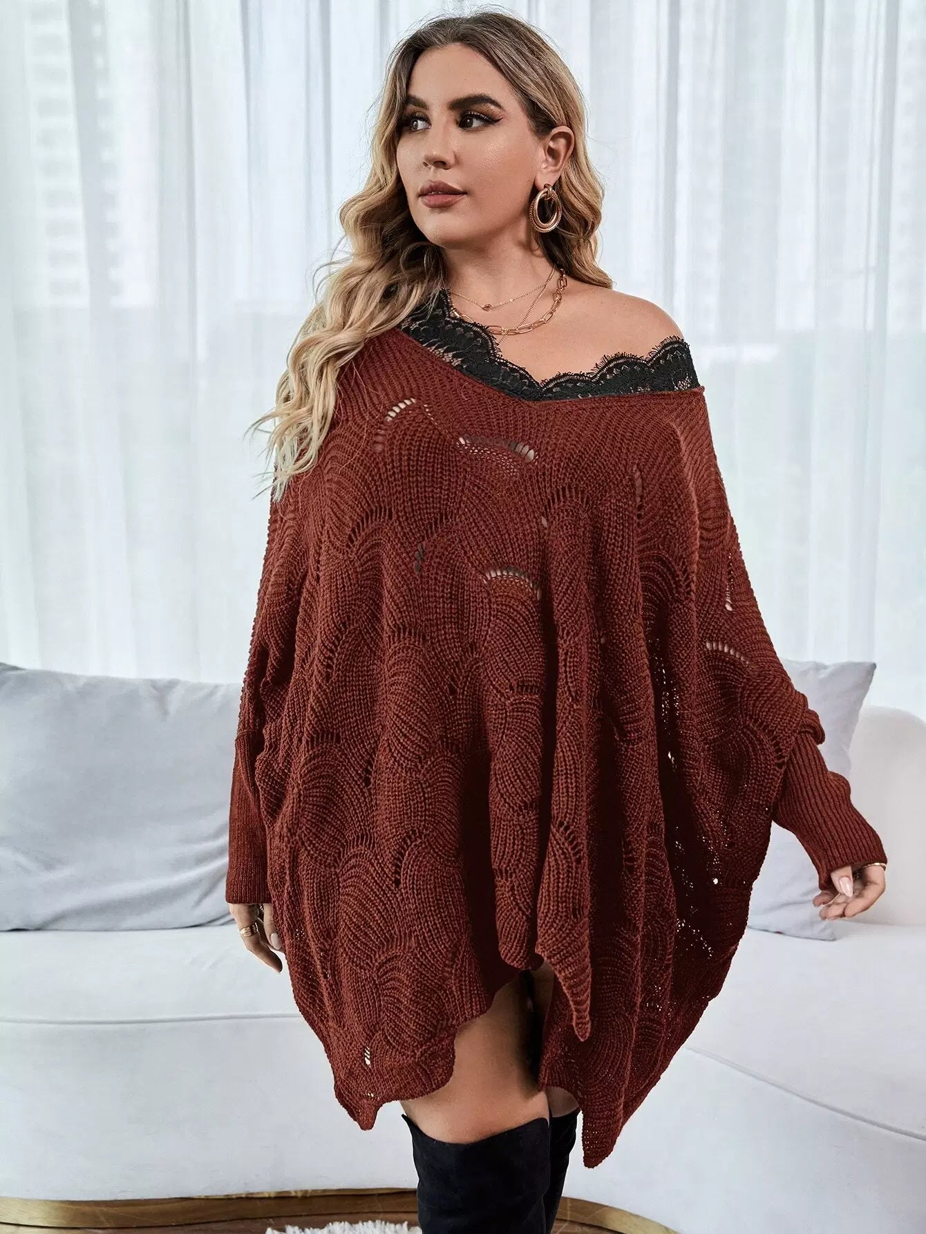 Plus Contrast Eyelash Lace Pointelle Knit Batwing Sleeve Sweater