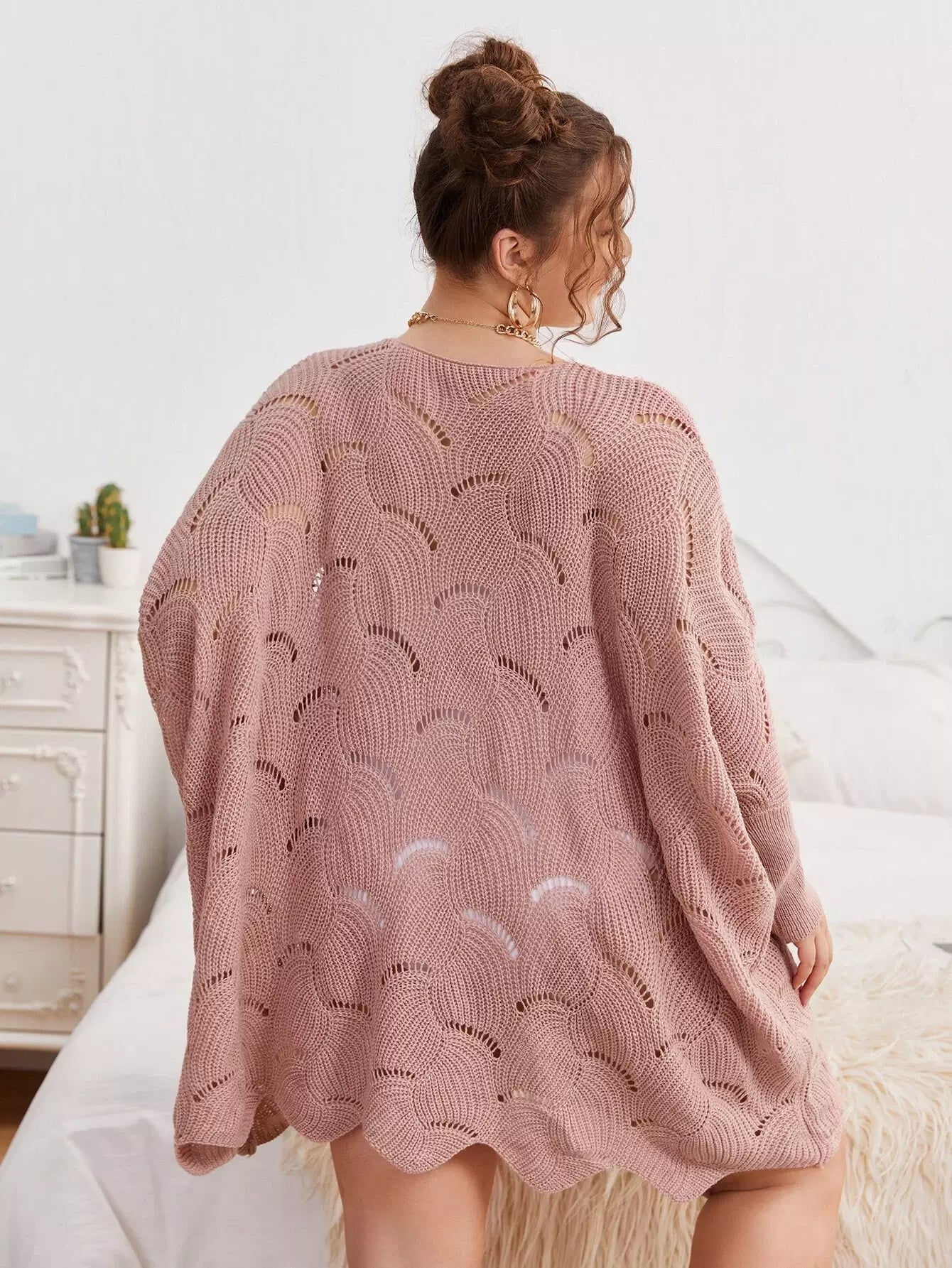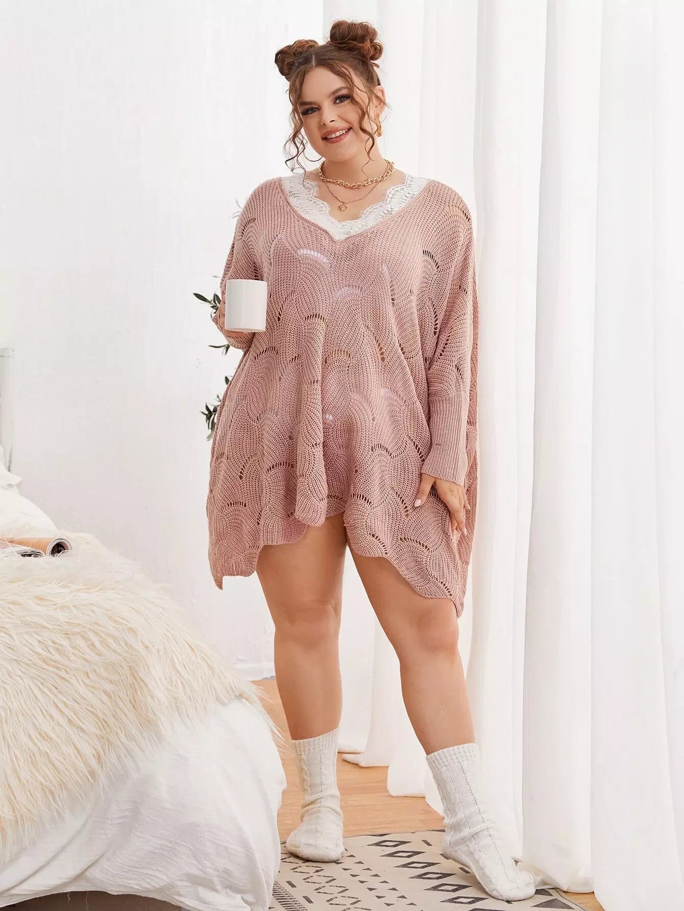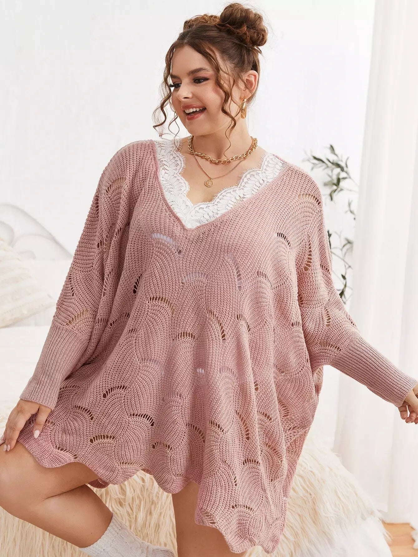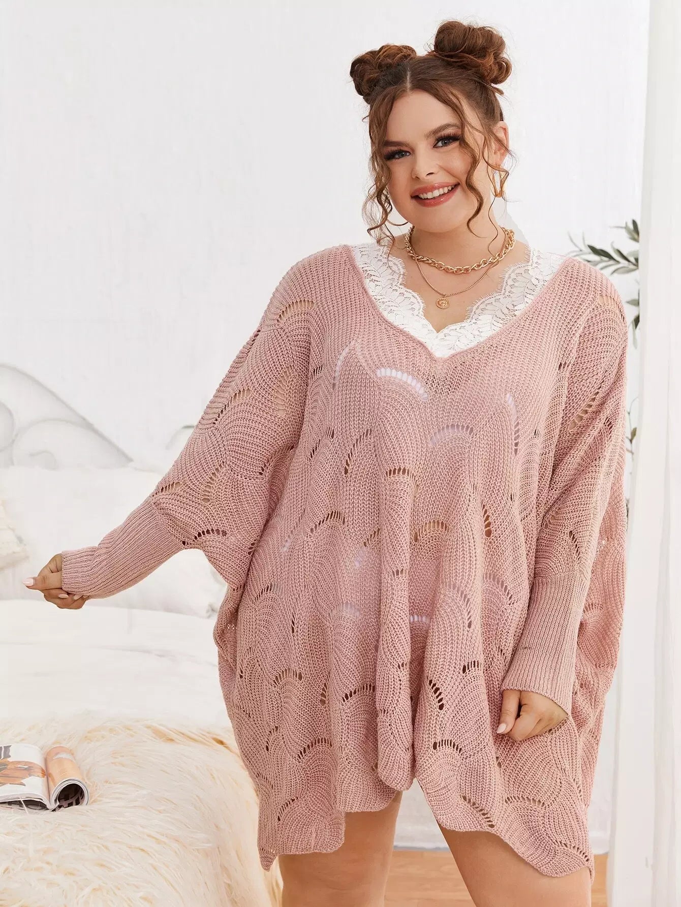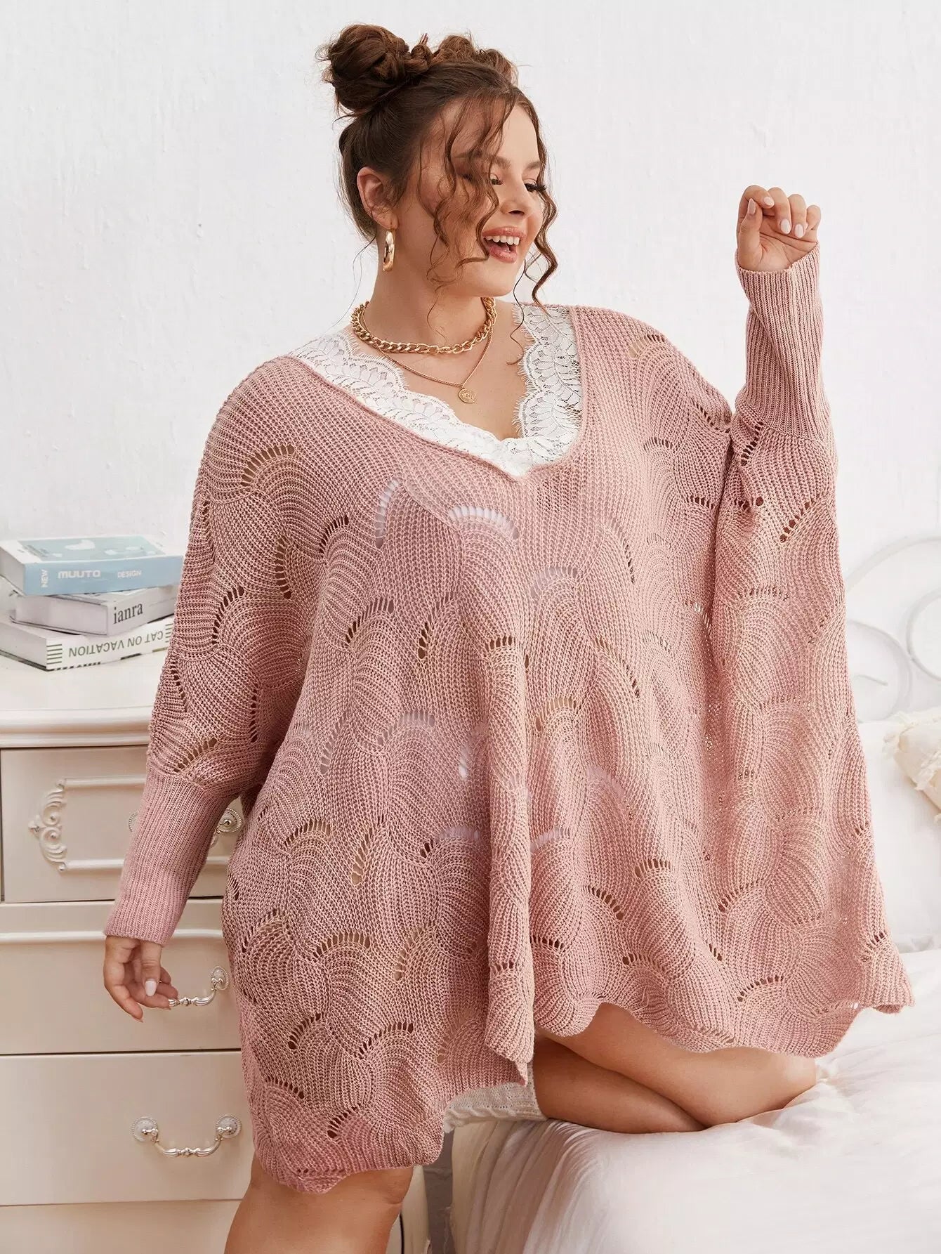 Plus Contrast Eyelash Lace Pointelle Knit Batwing Sleeve Sweater
