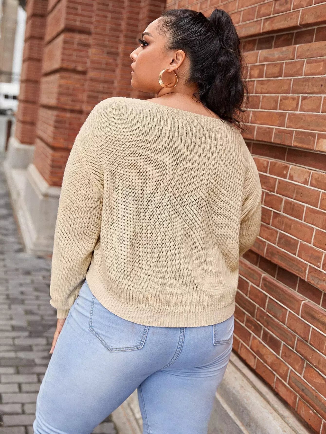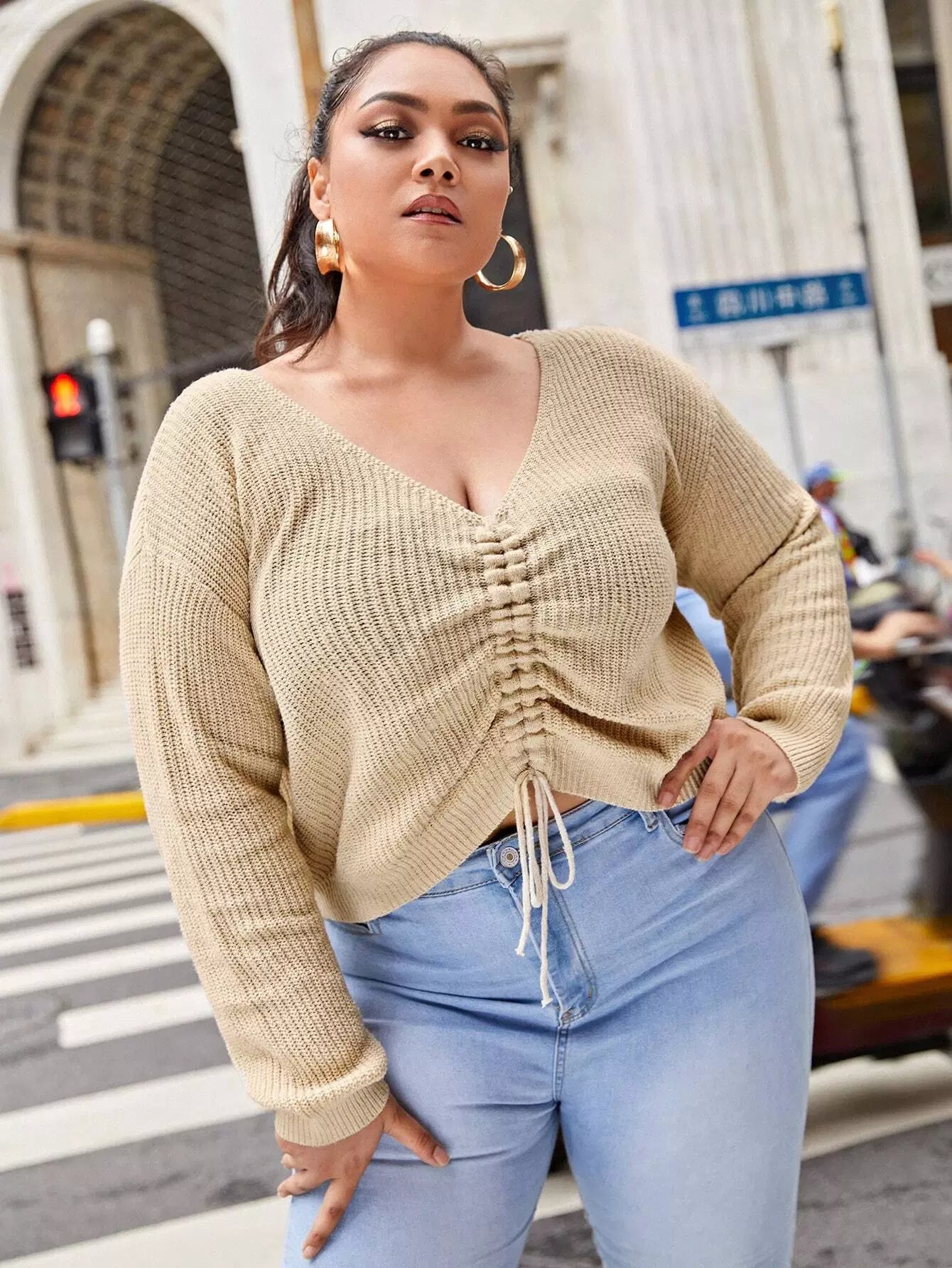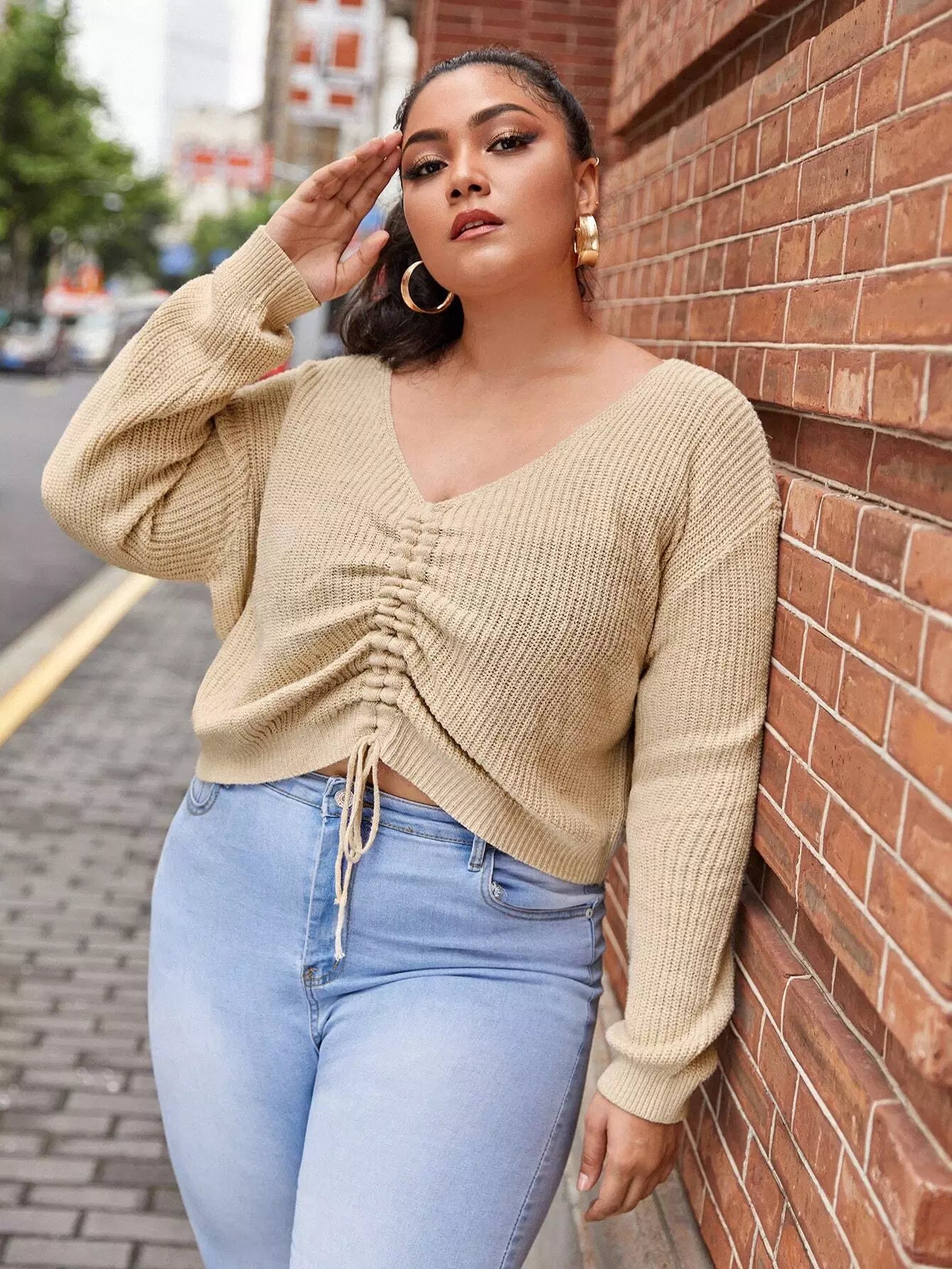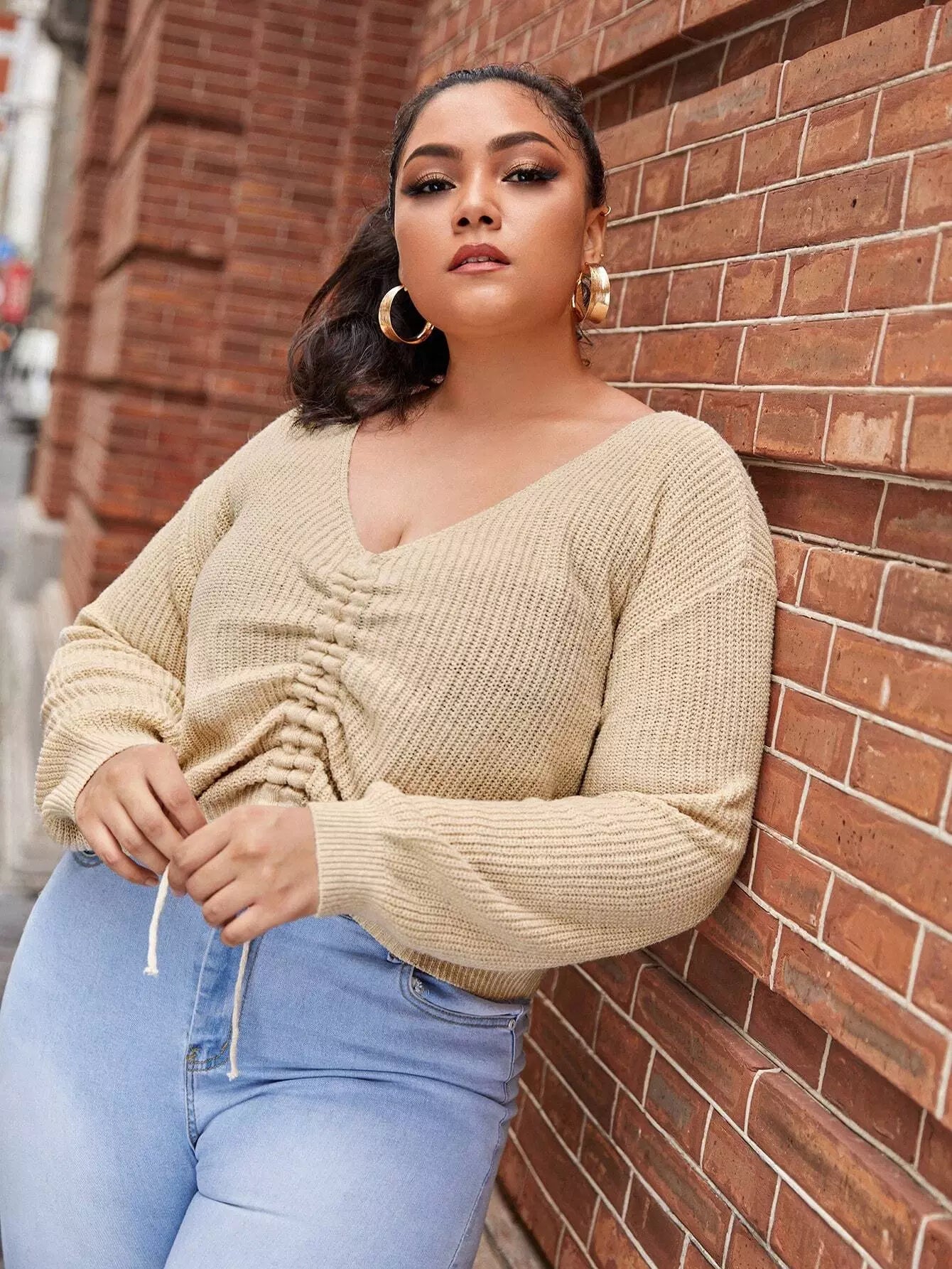 Women - Plus Drawstring Front Drop Shoulder Sweater