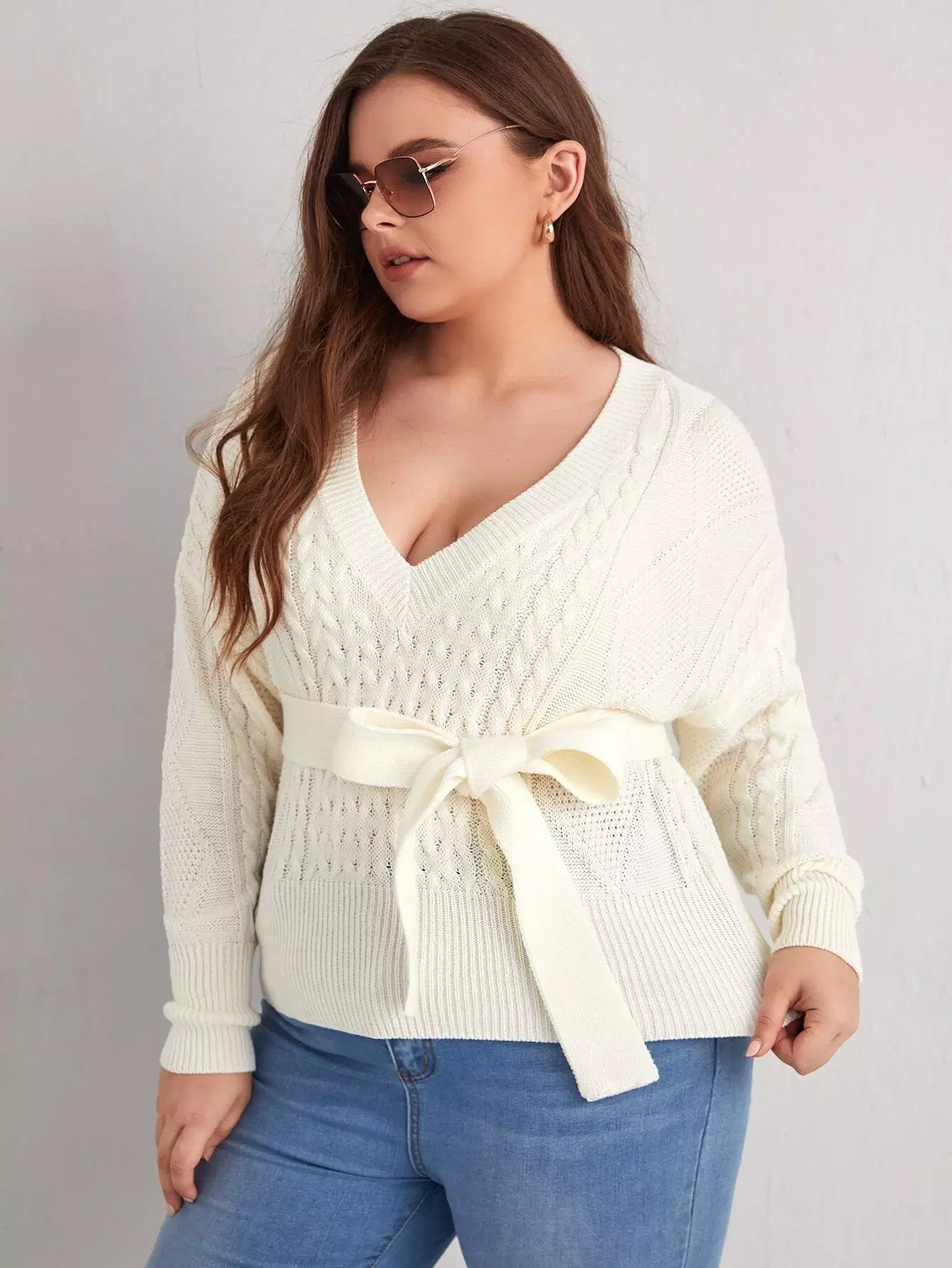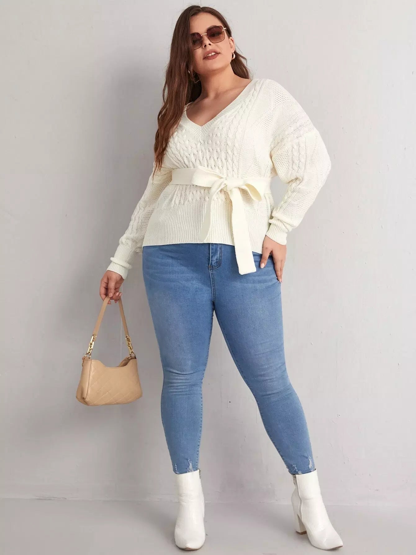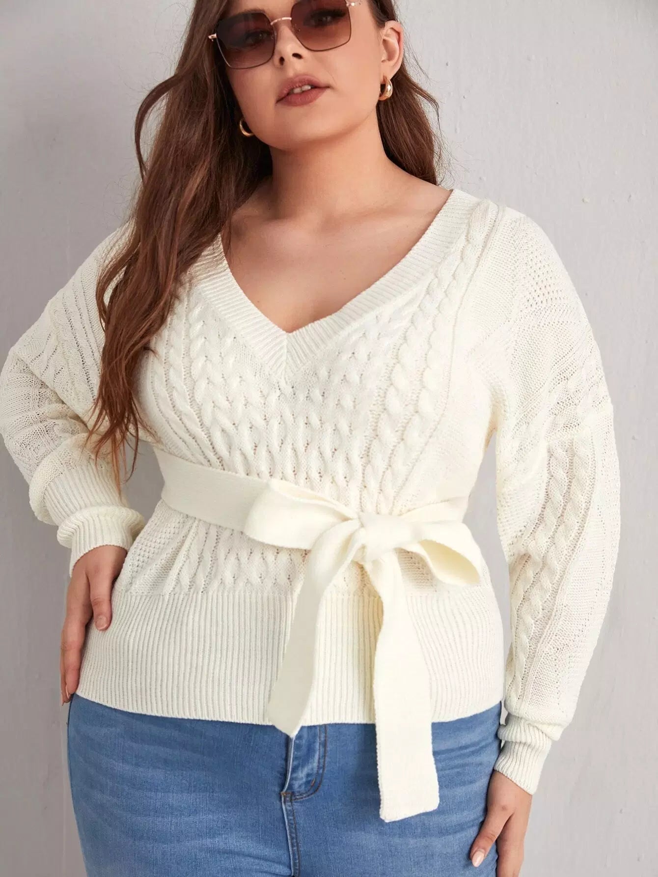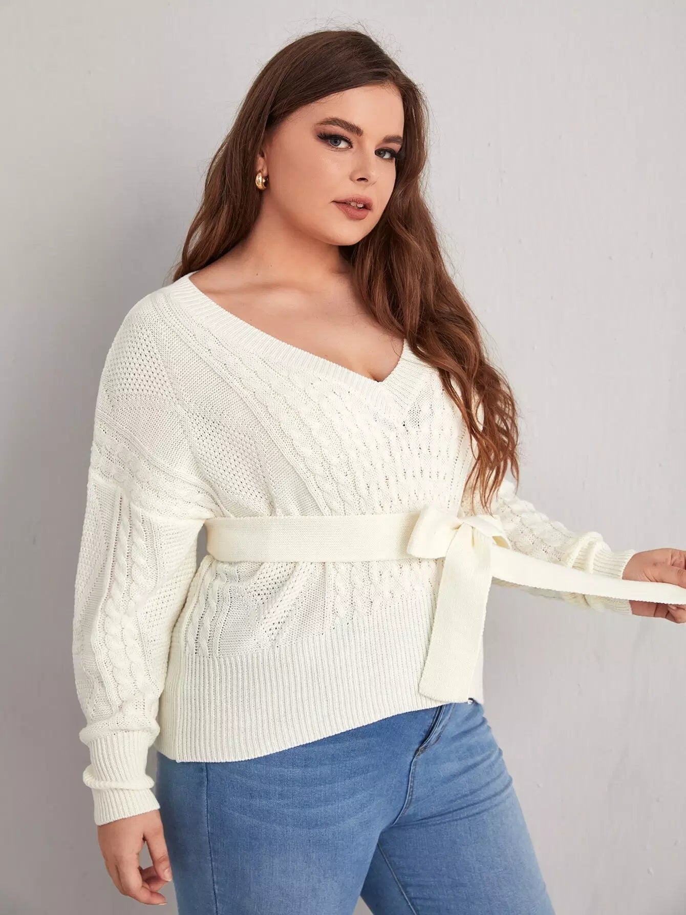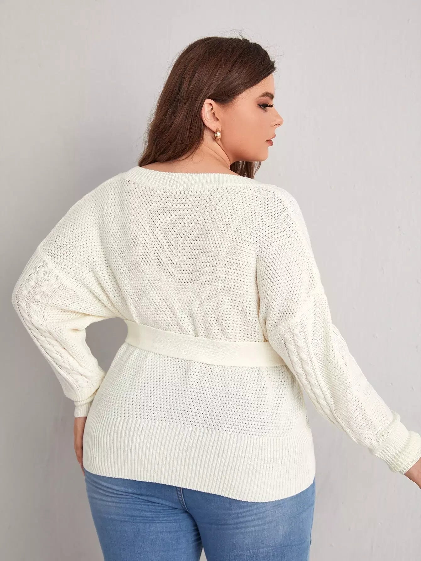 Plus Drop Shoulder Cable Knit Sweater Without Belt