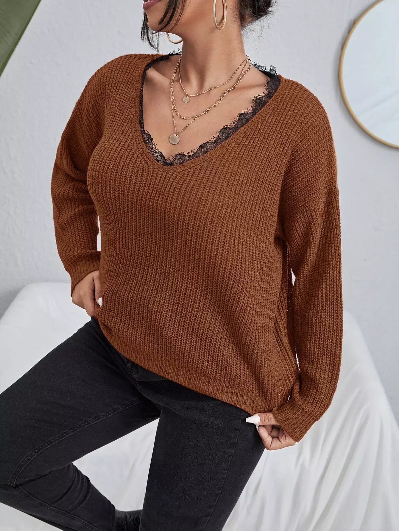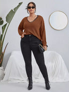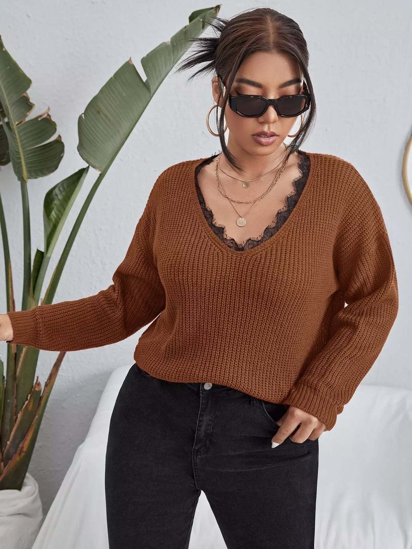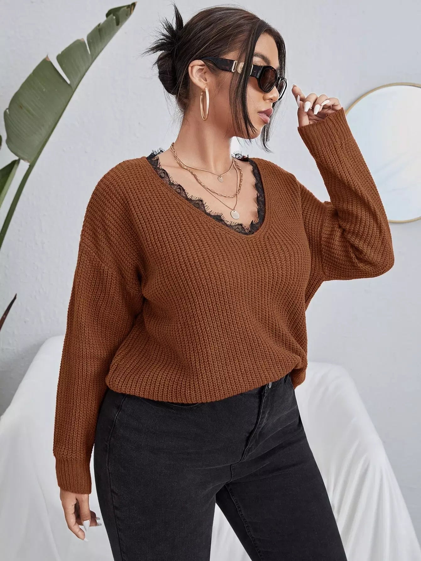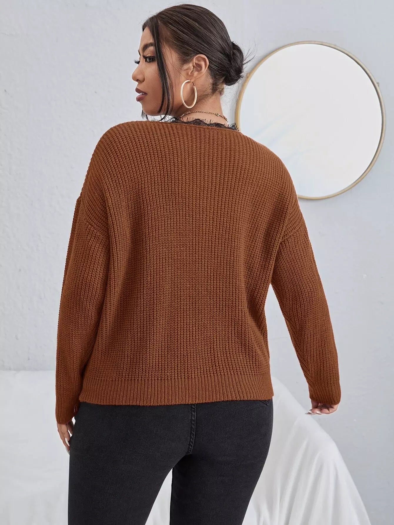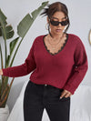 Plus Eyelash Lace Trim Drop Shoulder Ribbed Knit Sweater