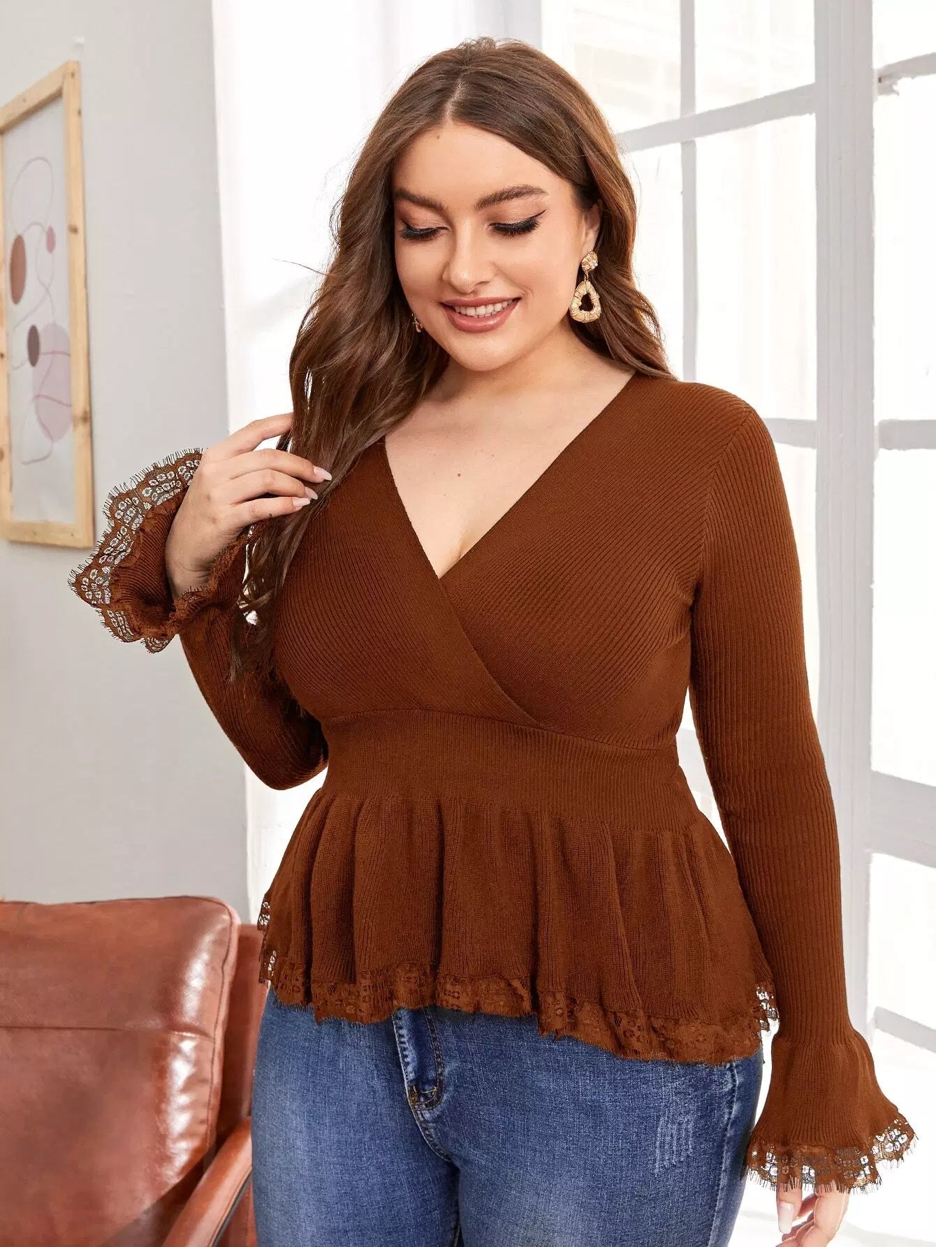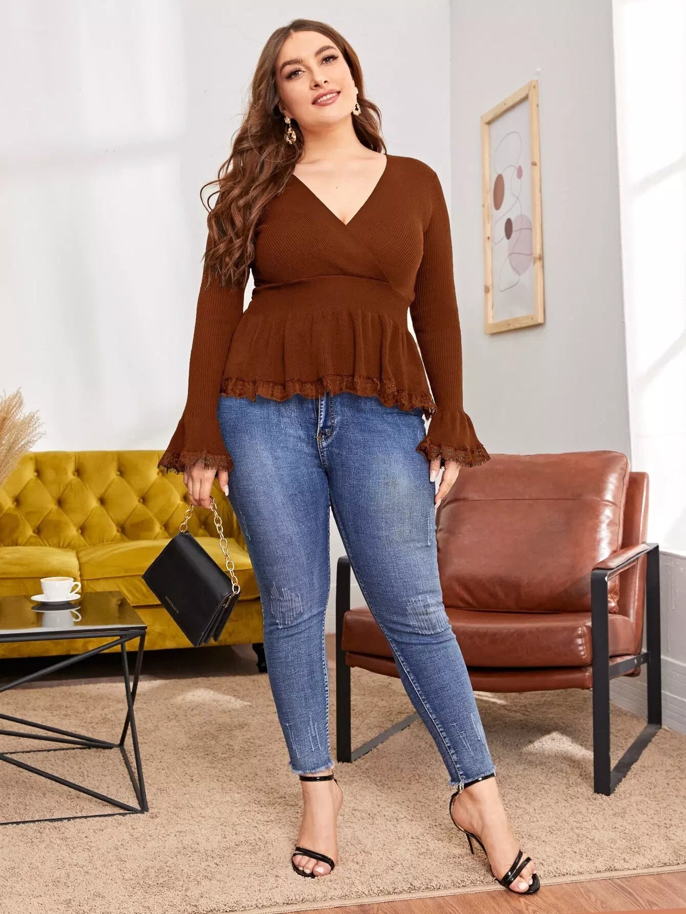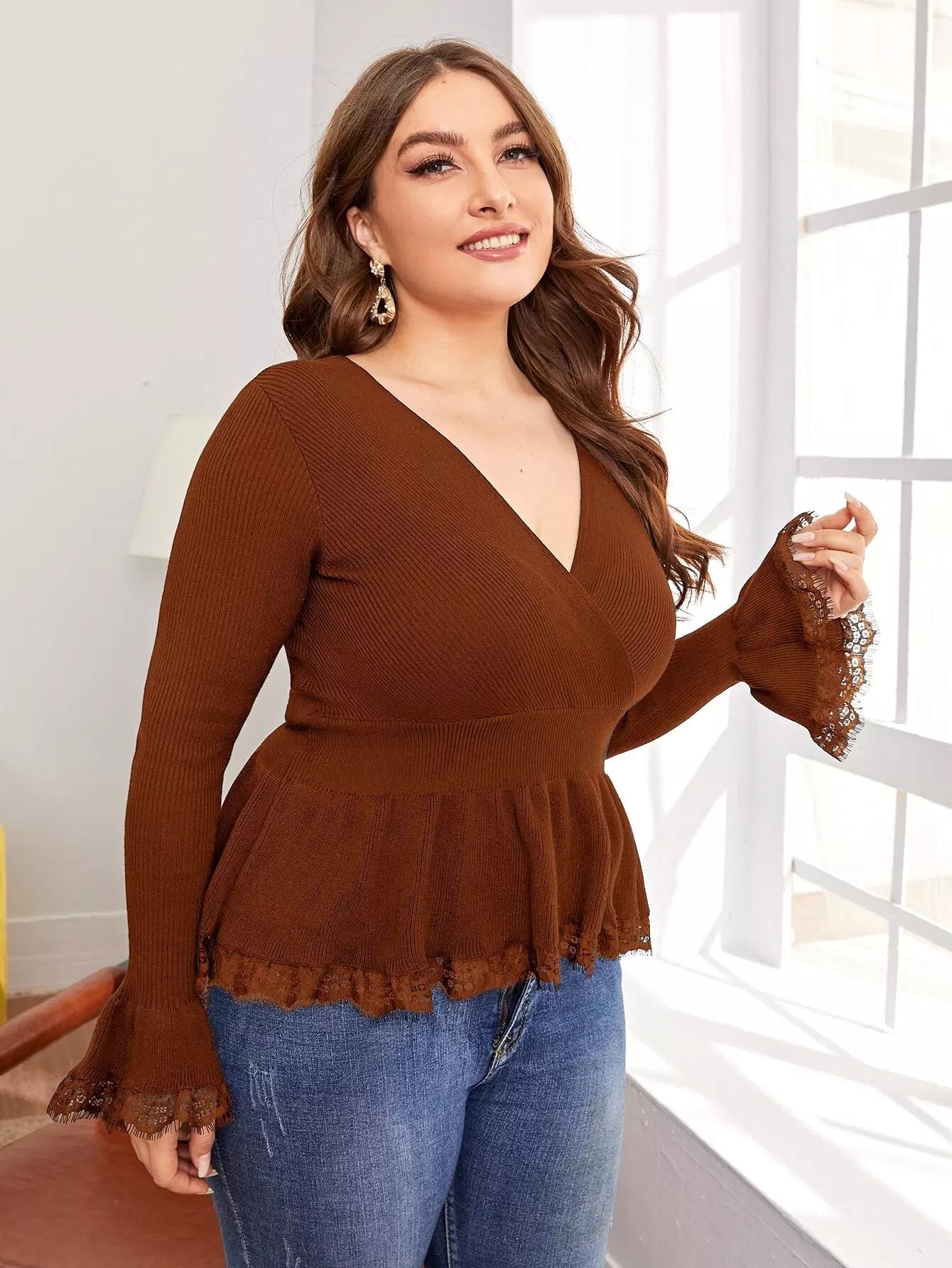Plus Eyelash Lace Trim Ruffle Hem Sweater
