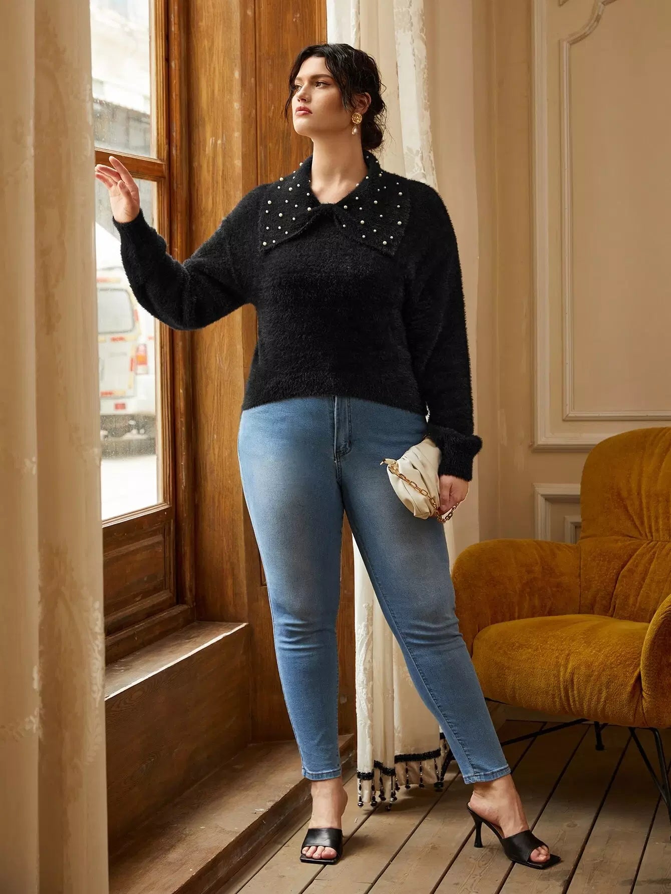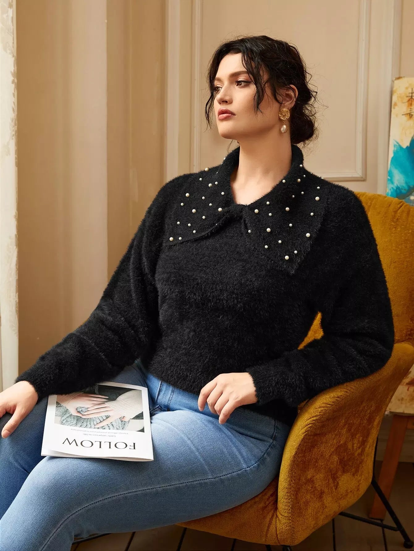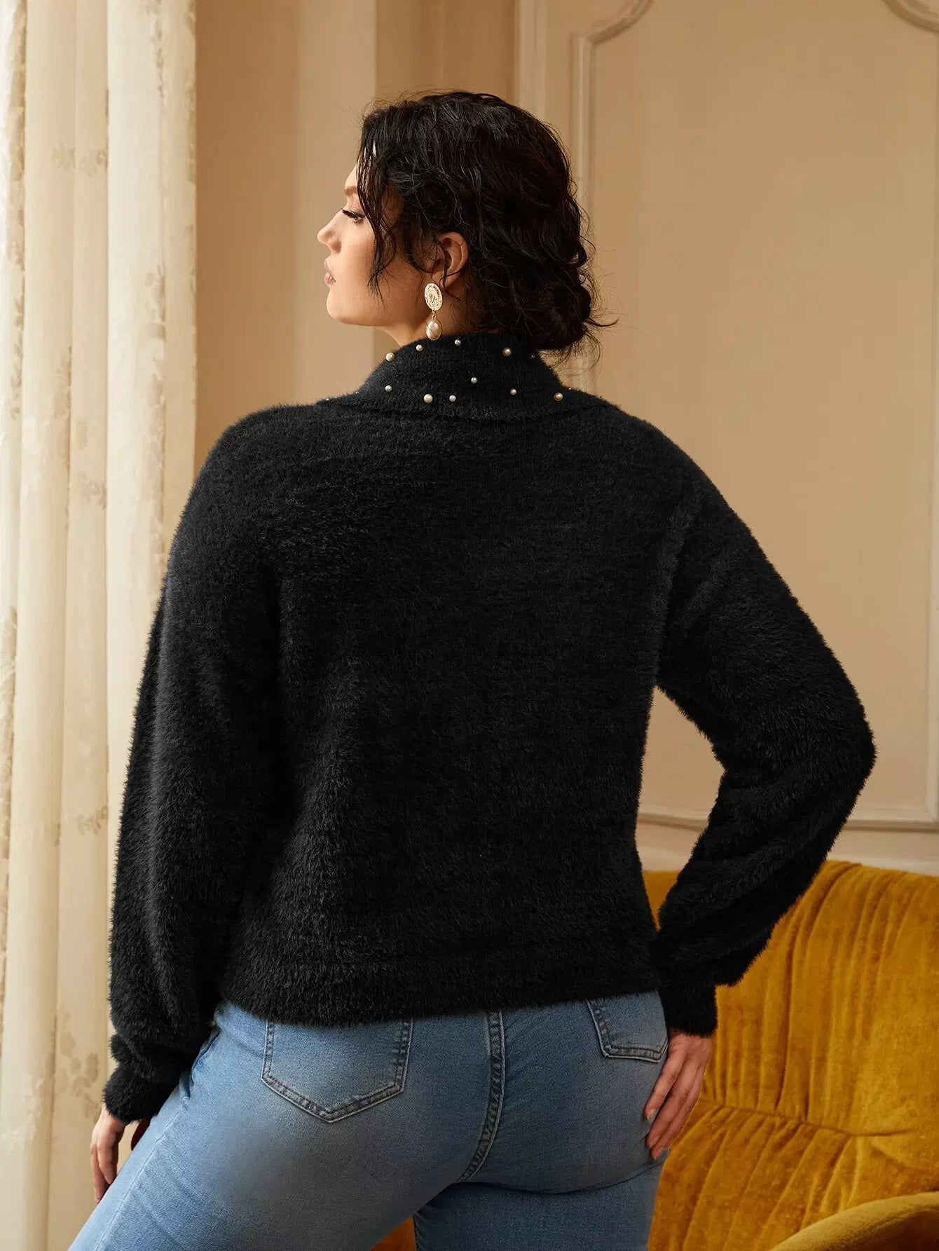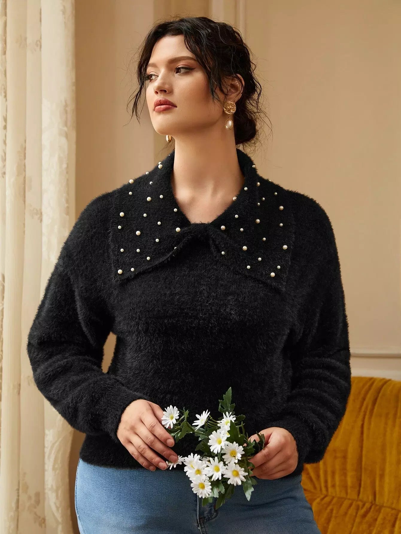 Plus Pearls Beaded Drop Shoulder Fluffy Knit Sweater