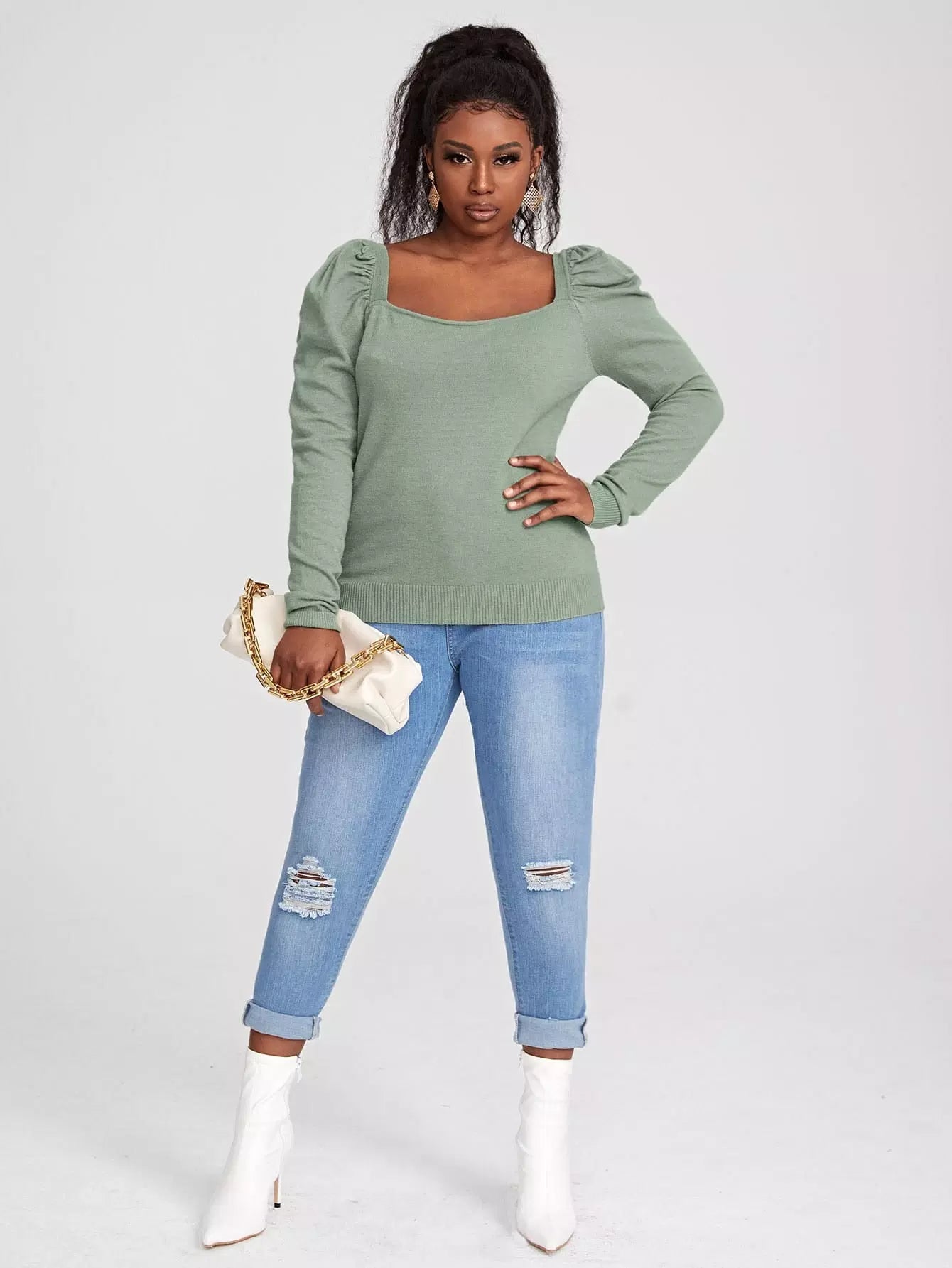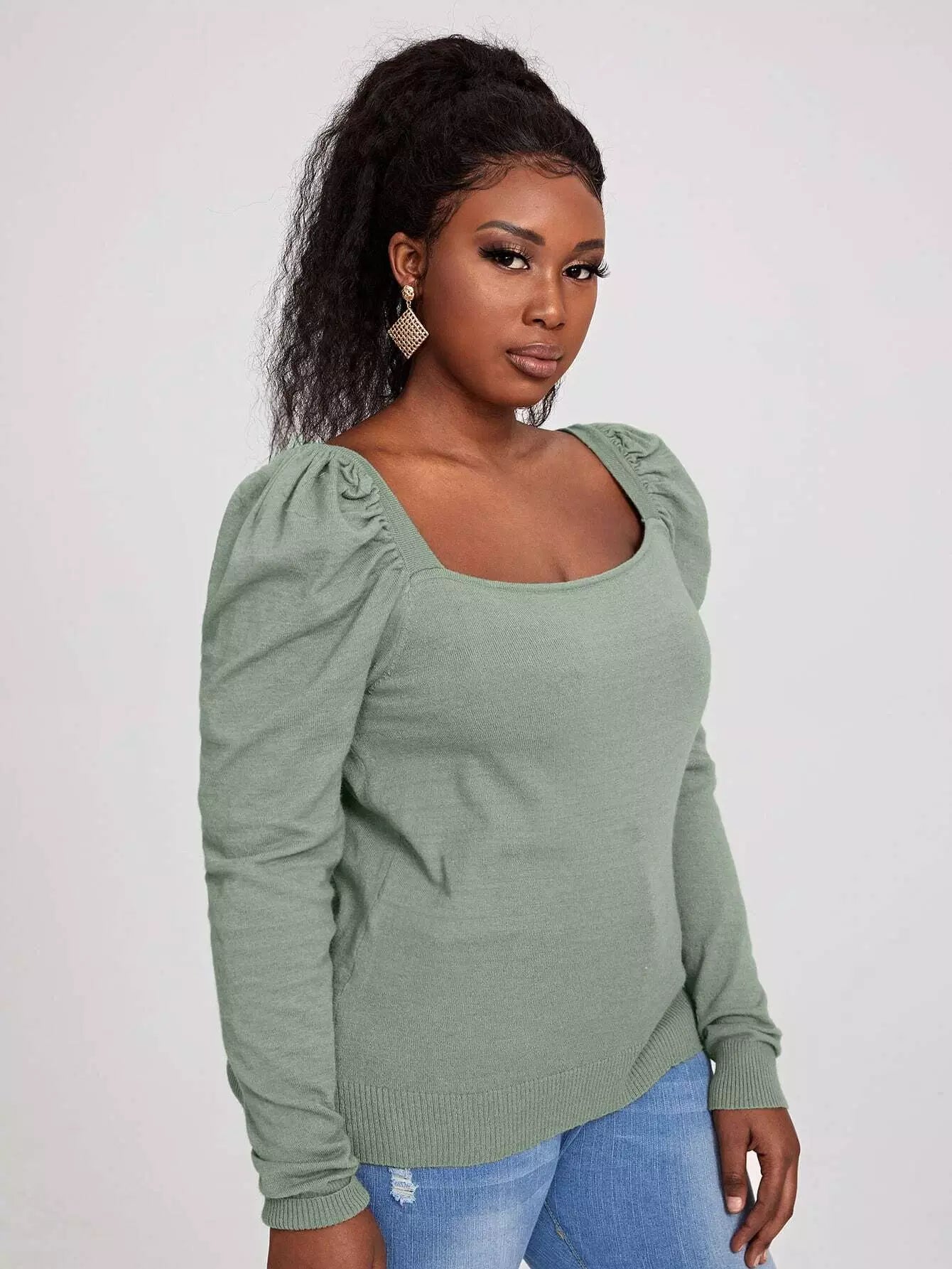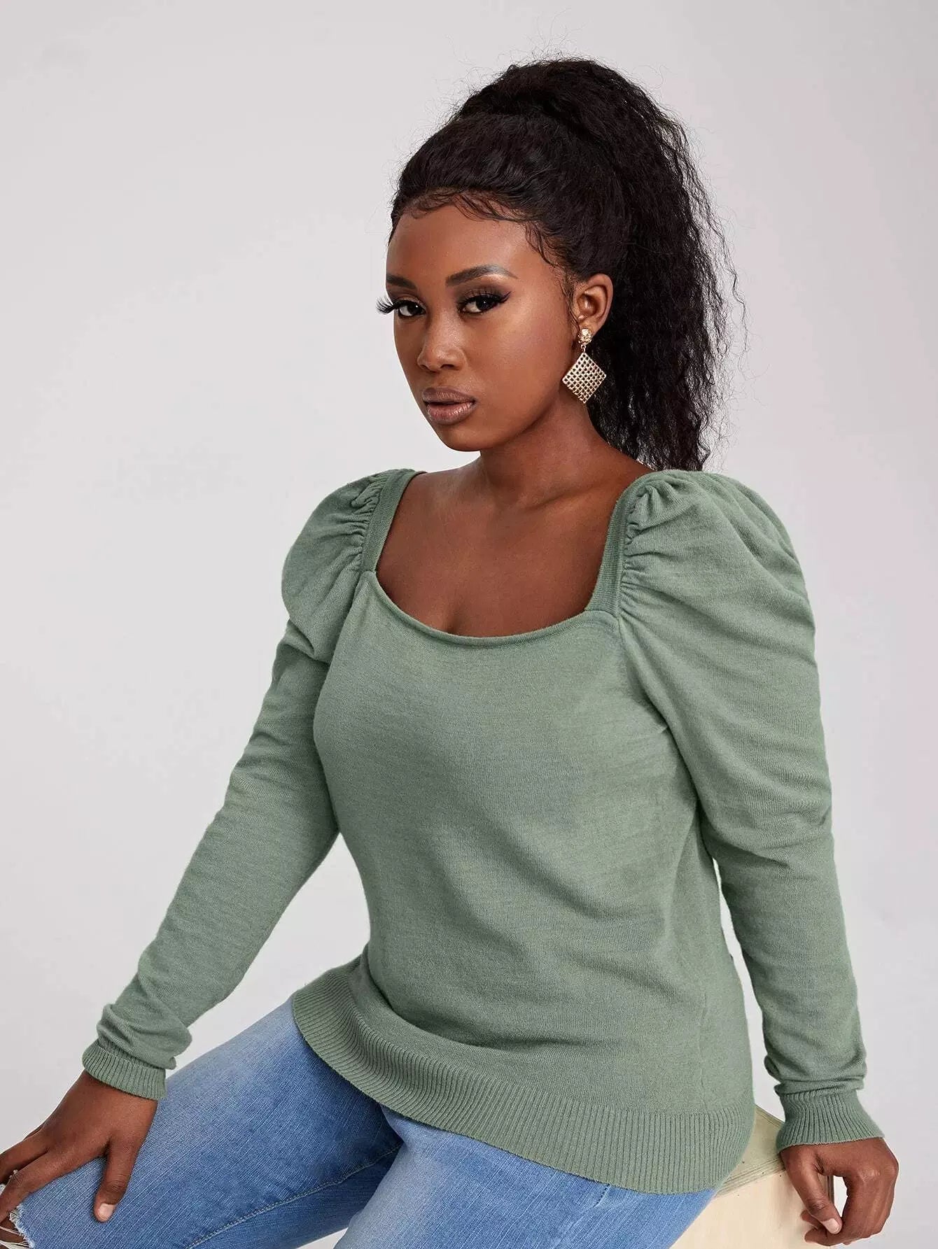 Plus Square Neck Leg-of-mutton Sleeve Sweater