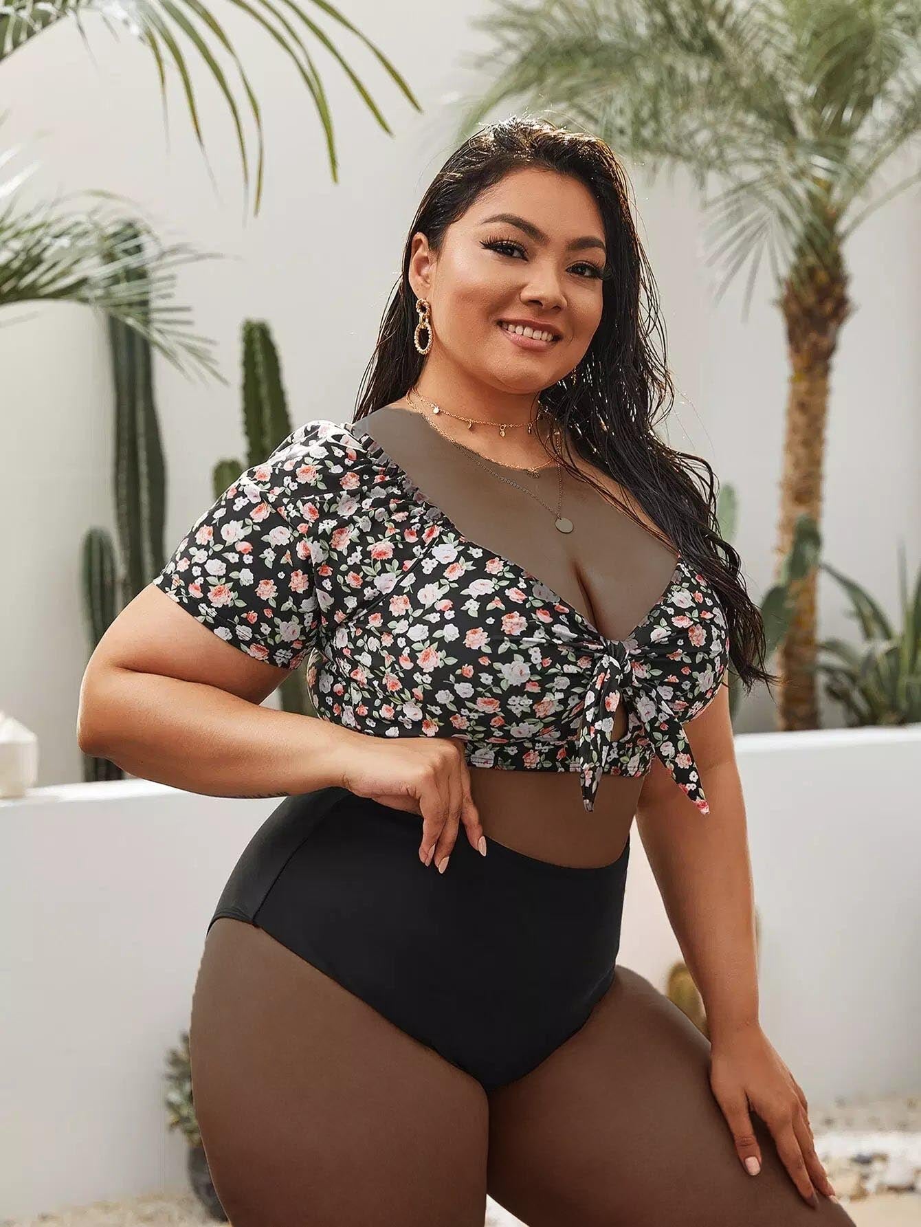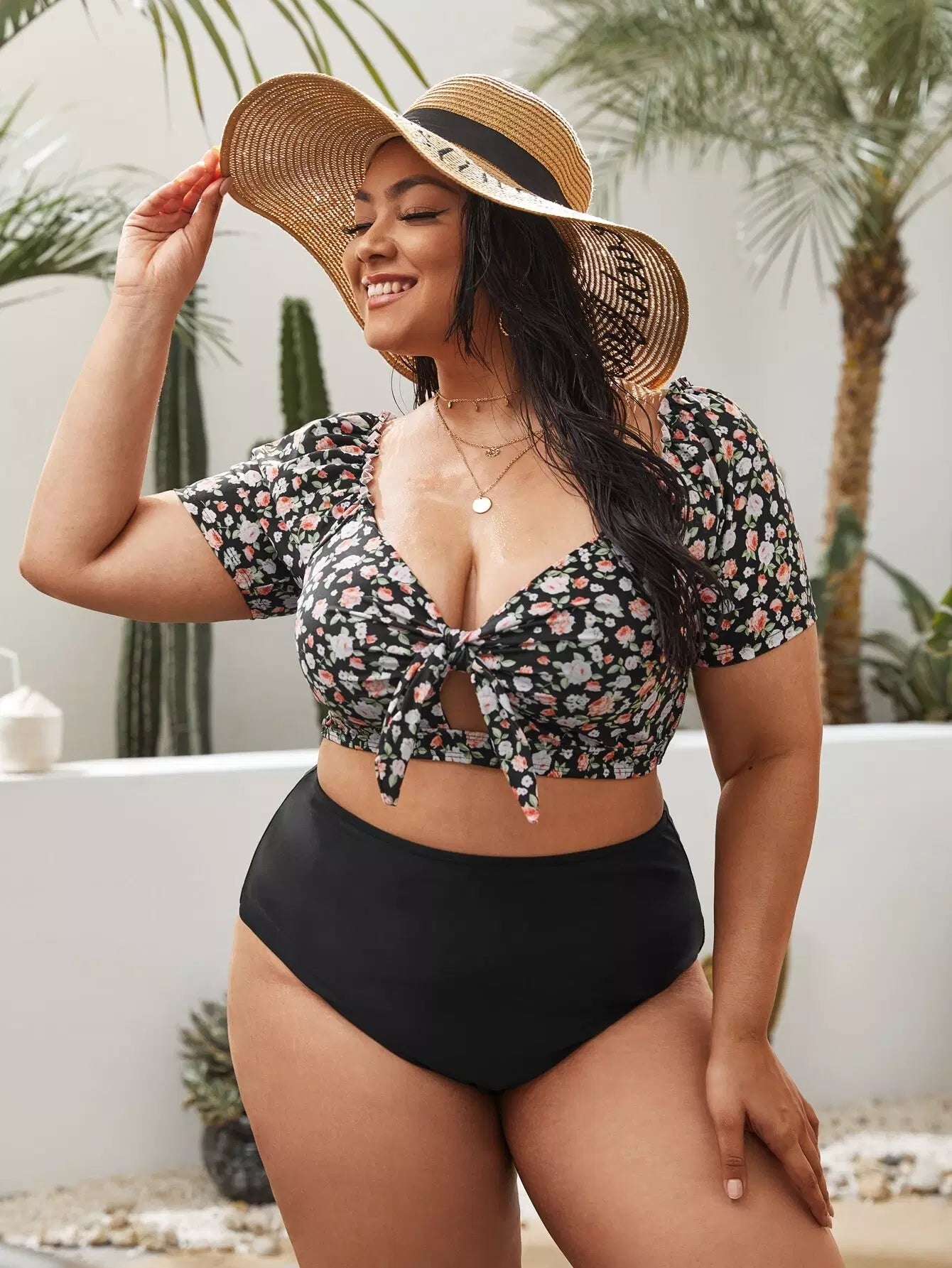 Plus Floral Graphic Knot Front Bikini Swimsuit