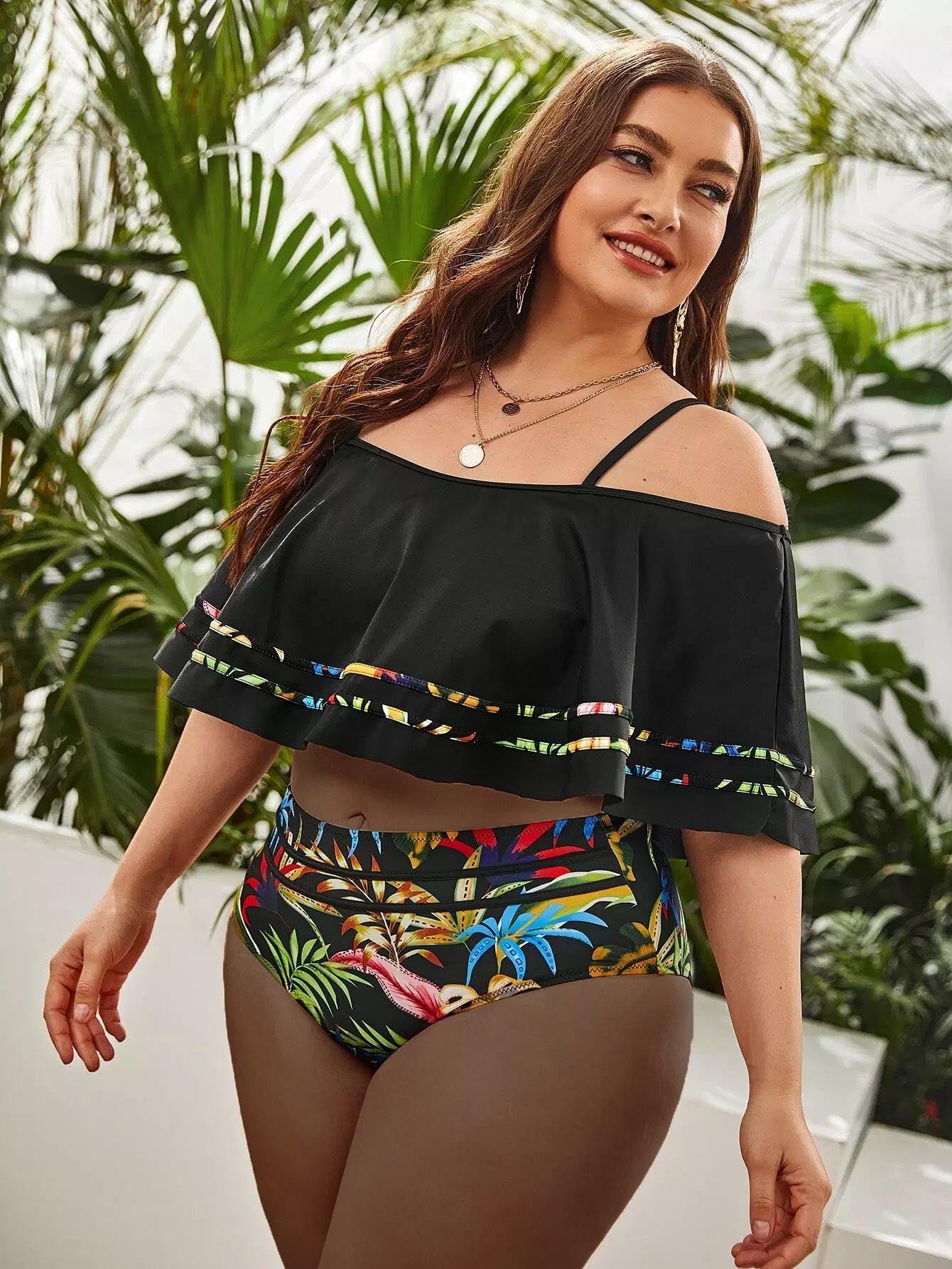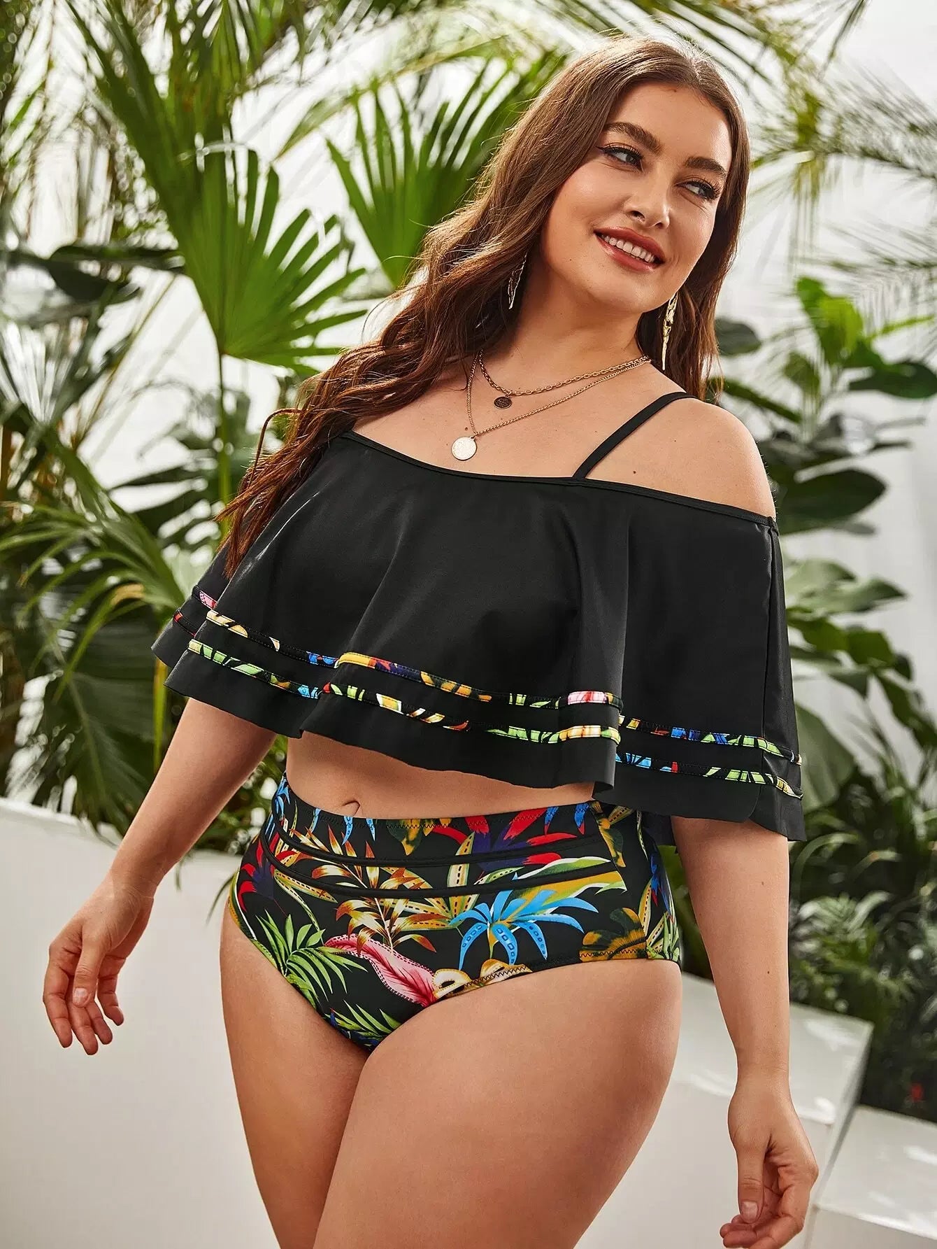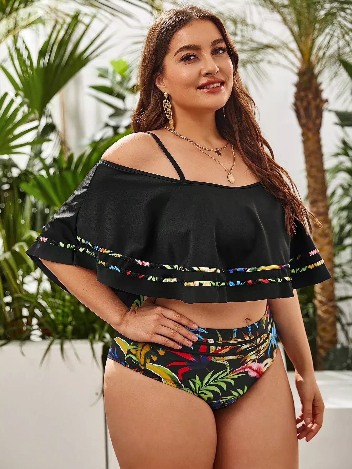 Plus Leaf Print Ruffle Bikini Swimsuit