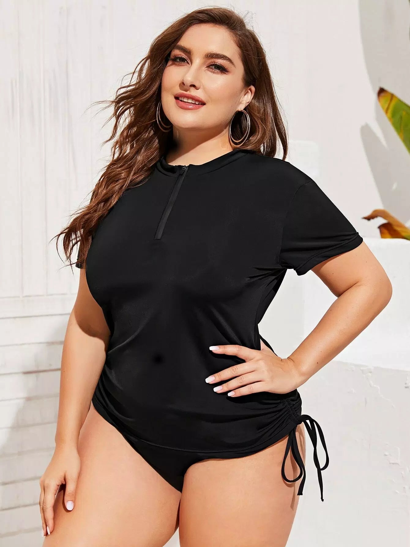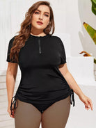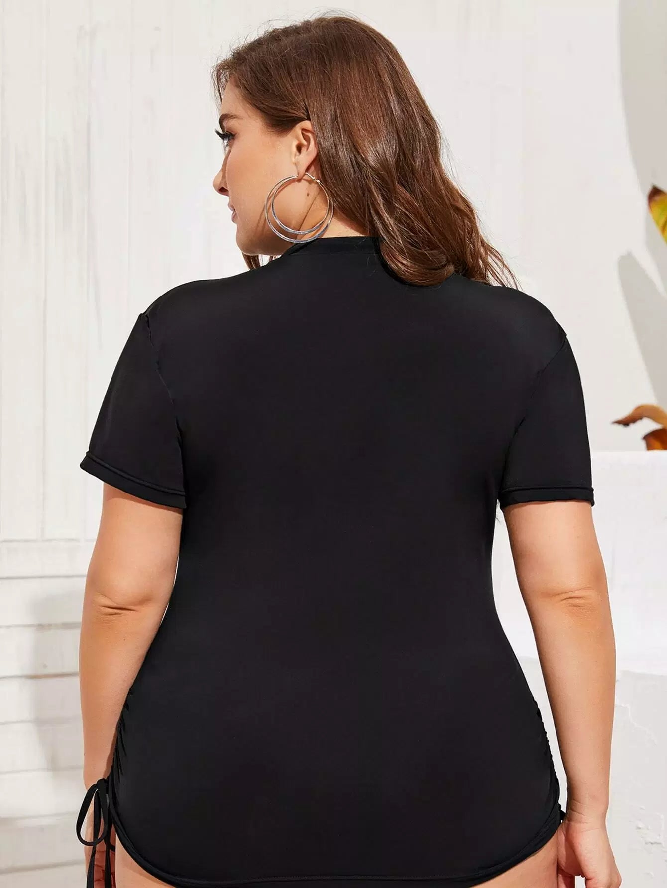 Plus Zip-up Tie Side Bikini Swimsuit With Short Sleeve