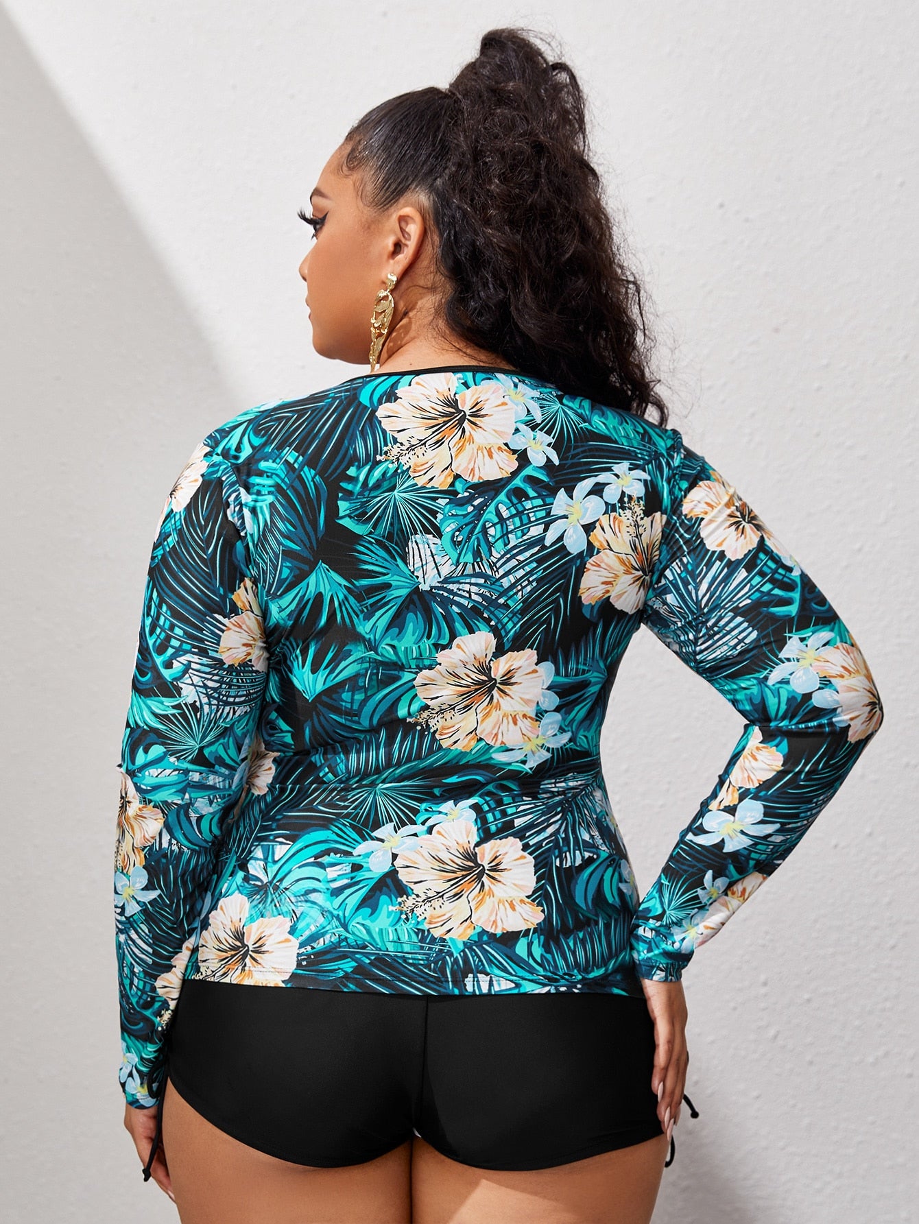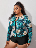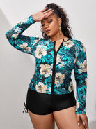 Plus Floral & Tropical Zip-up Bikini Swimsuit With Long Sleeve