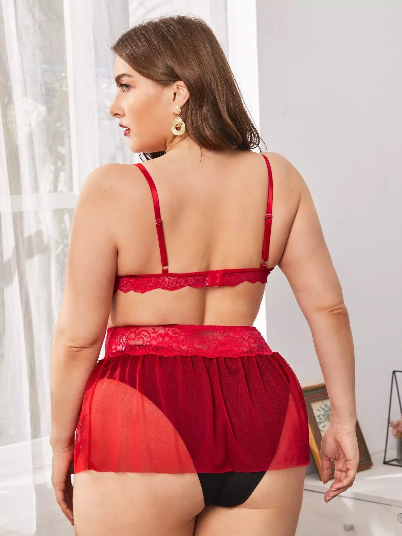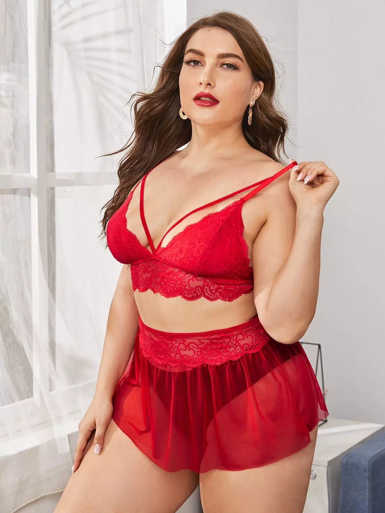 3pack Plus Contrast Lace Mesh Harness Lingerie Set