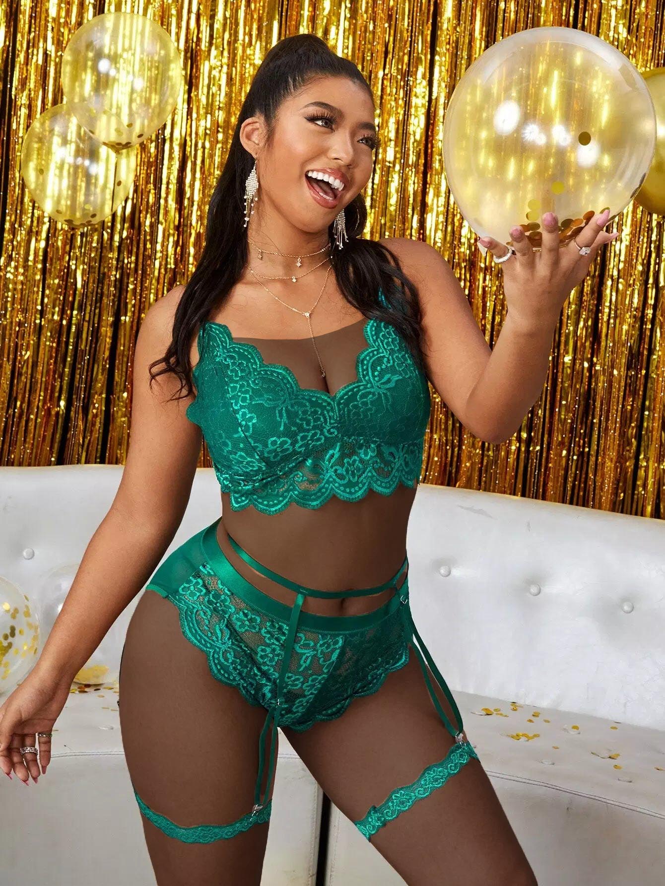Plus 3pack Floral Lace Scallop Trim Garter Lingerie Set