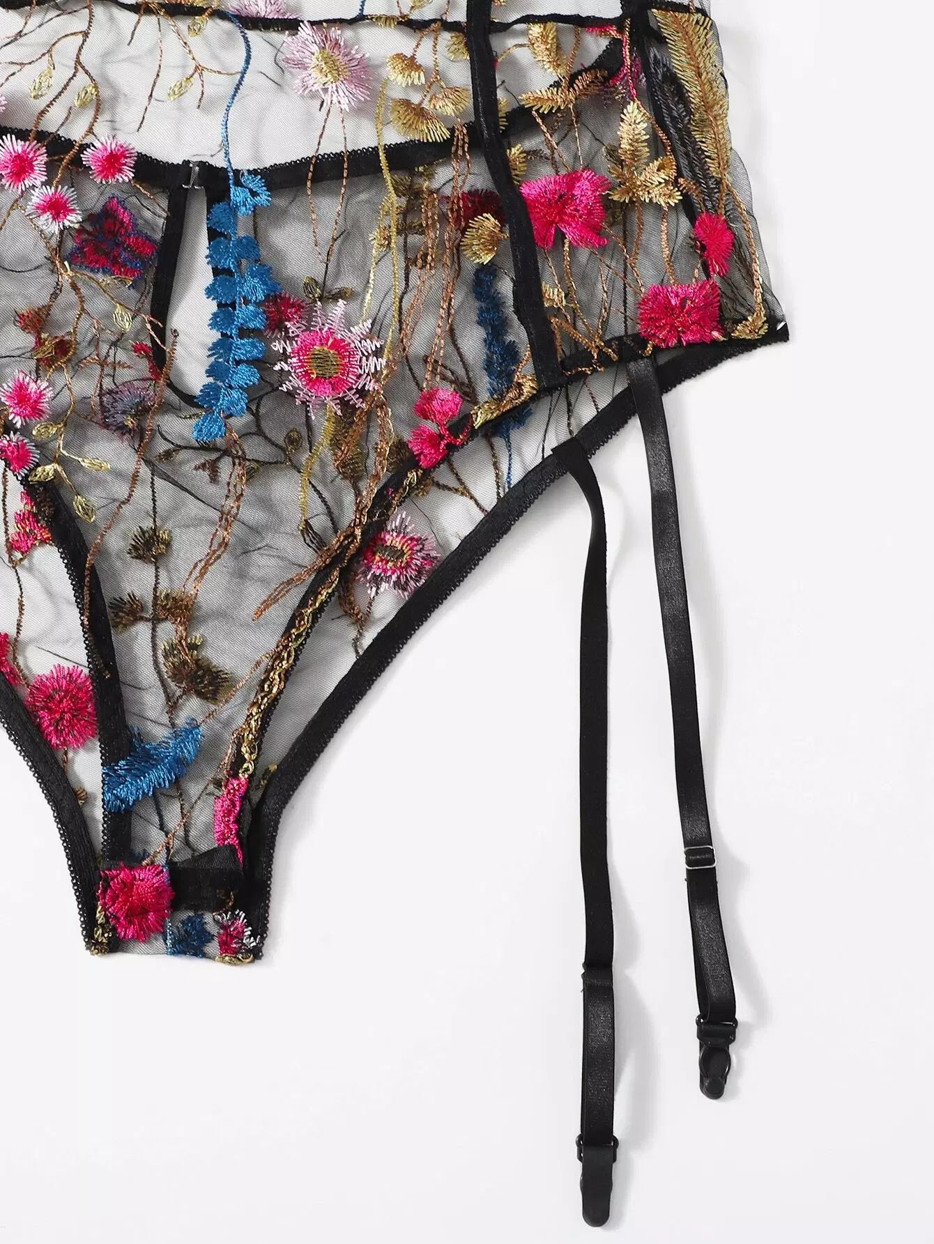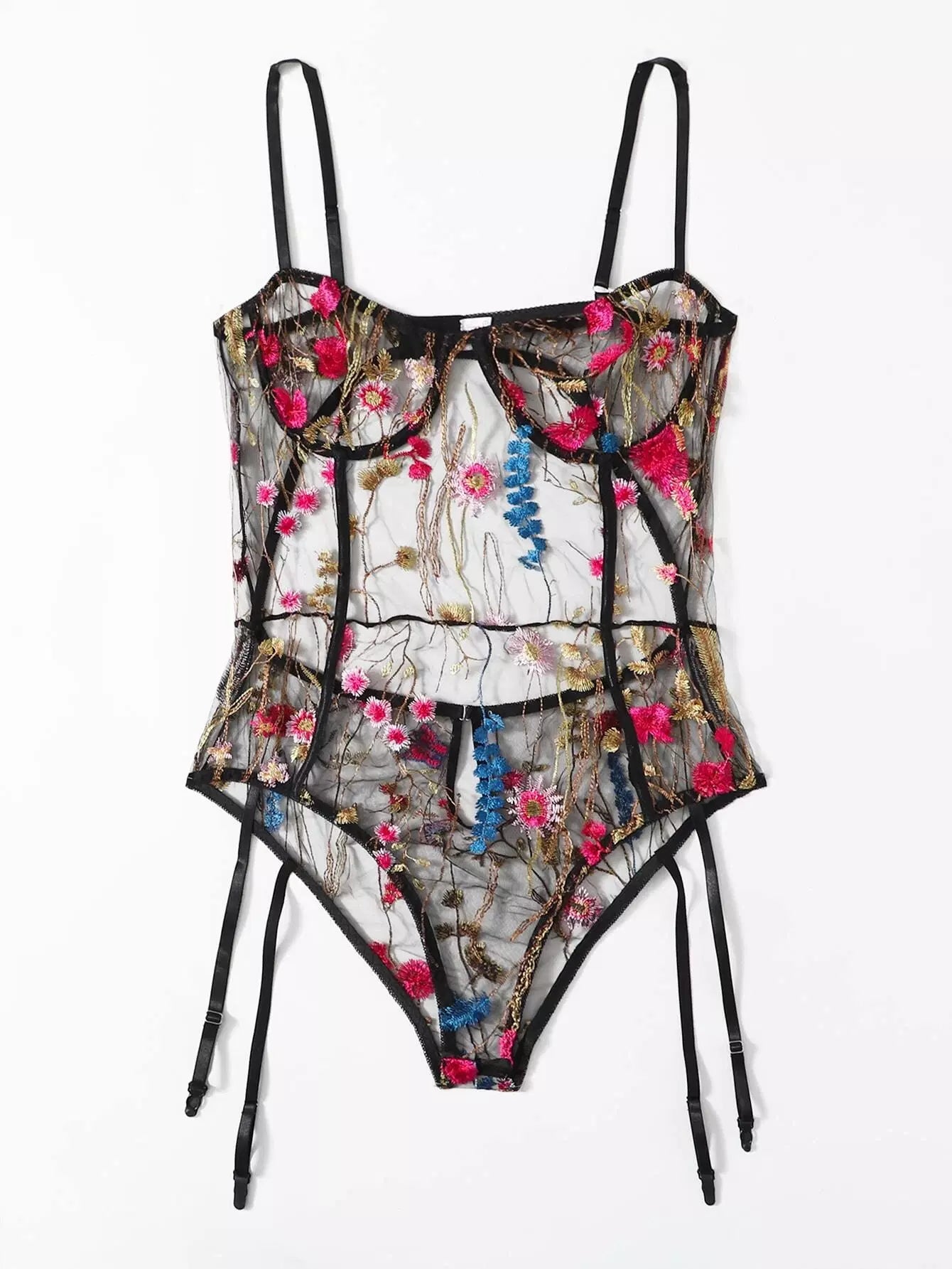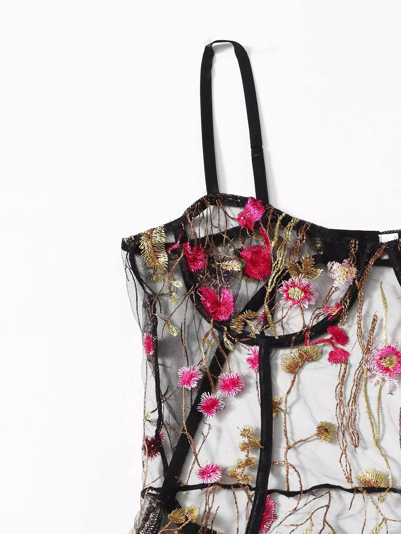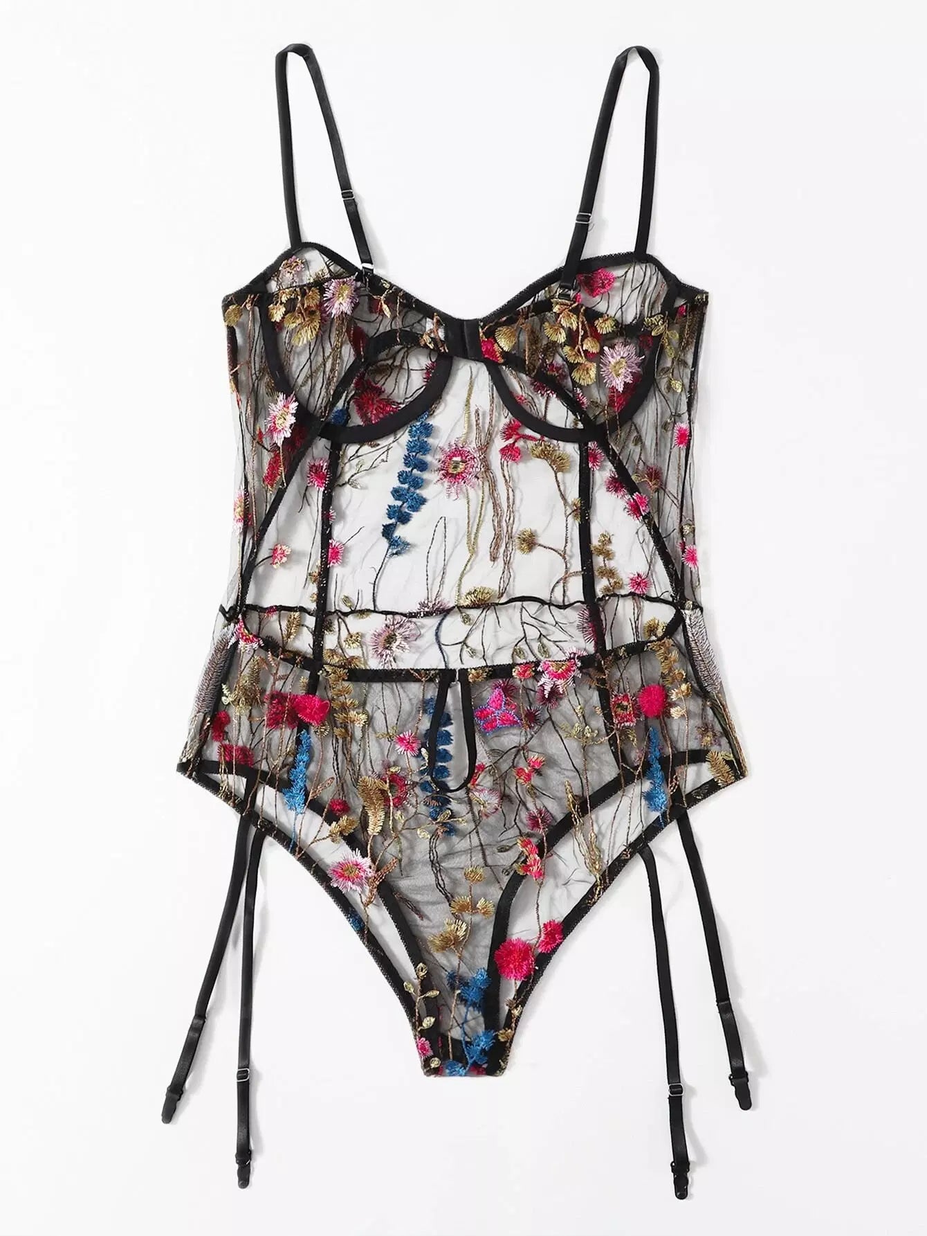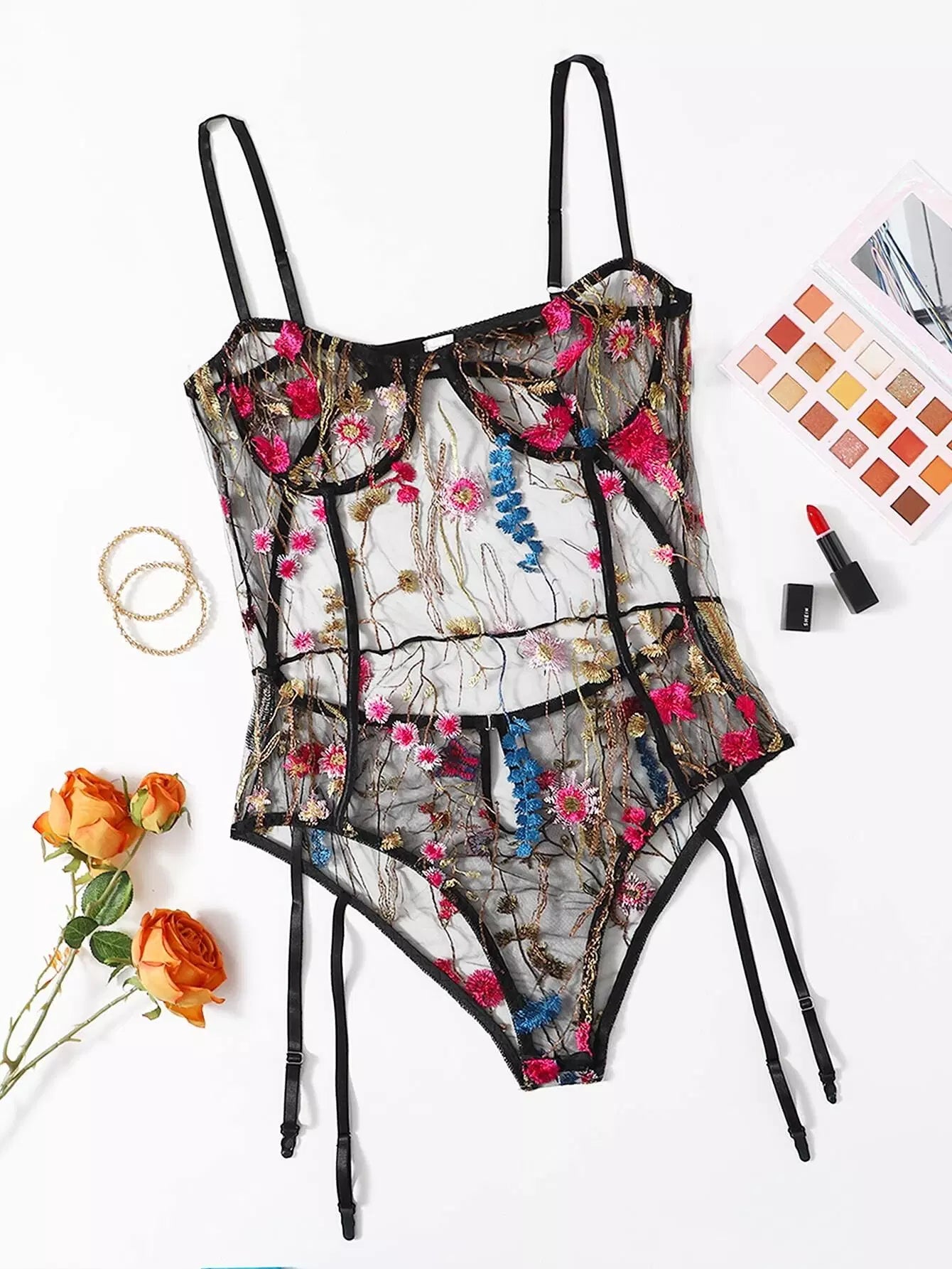 Plus Embroidery Mesh Garter Teddy Bodysuit