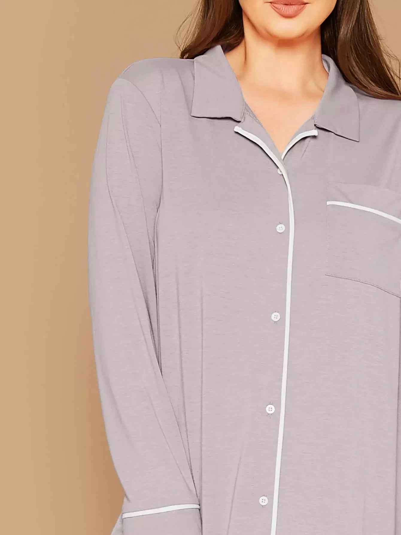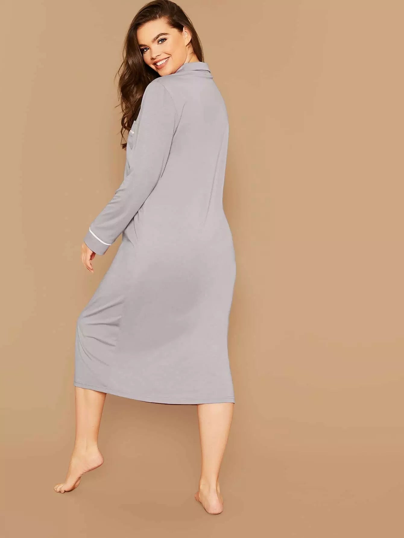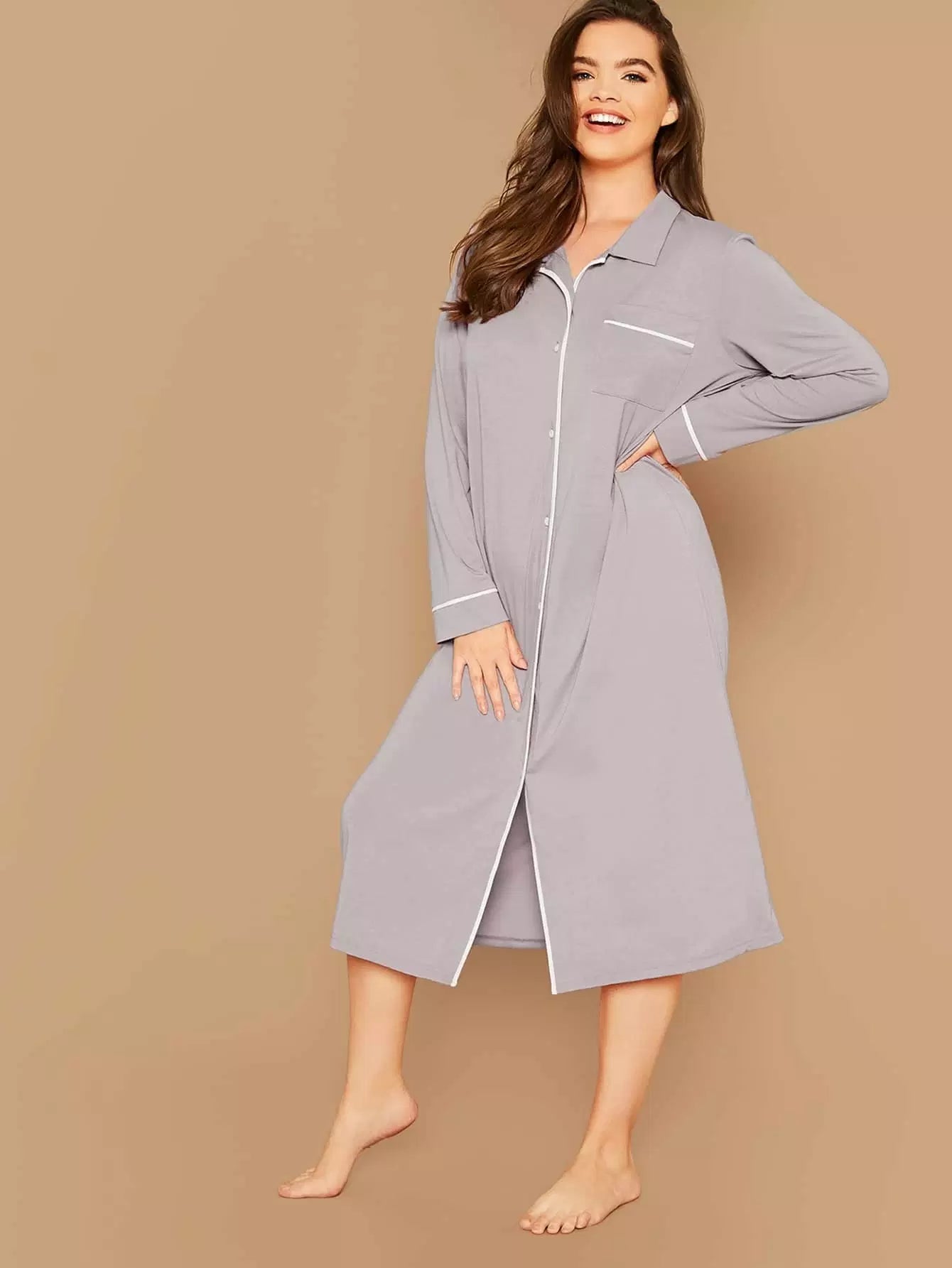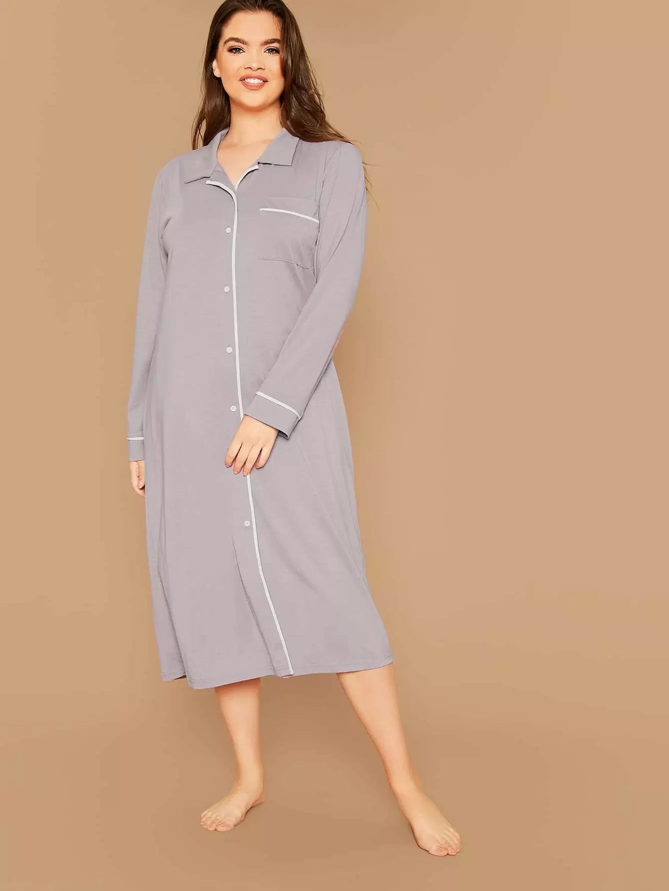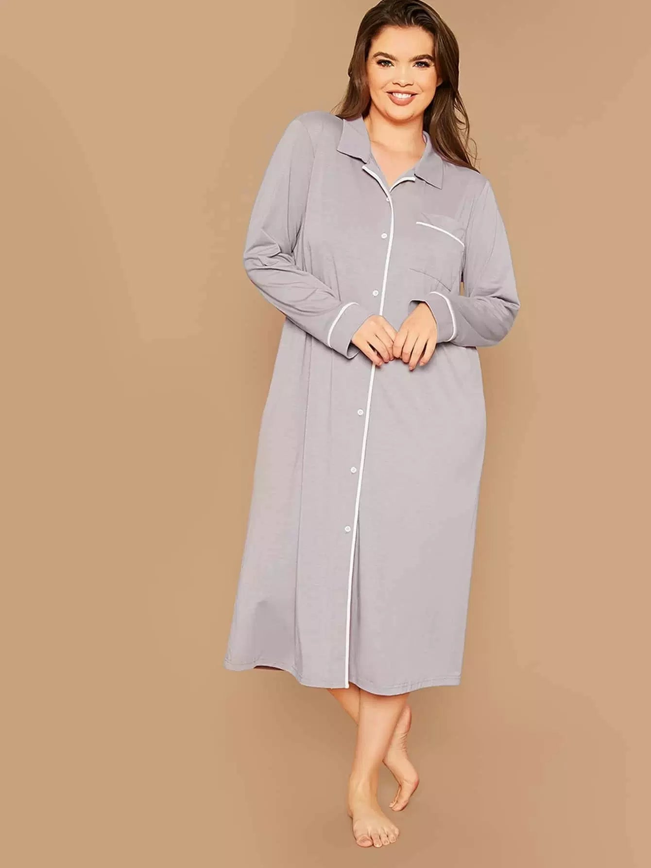 Plus Contrast Binding Button Front Night Shirt