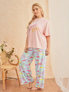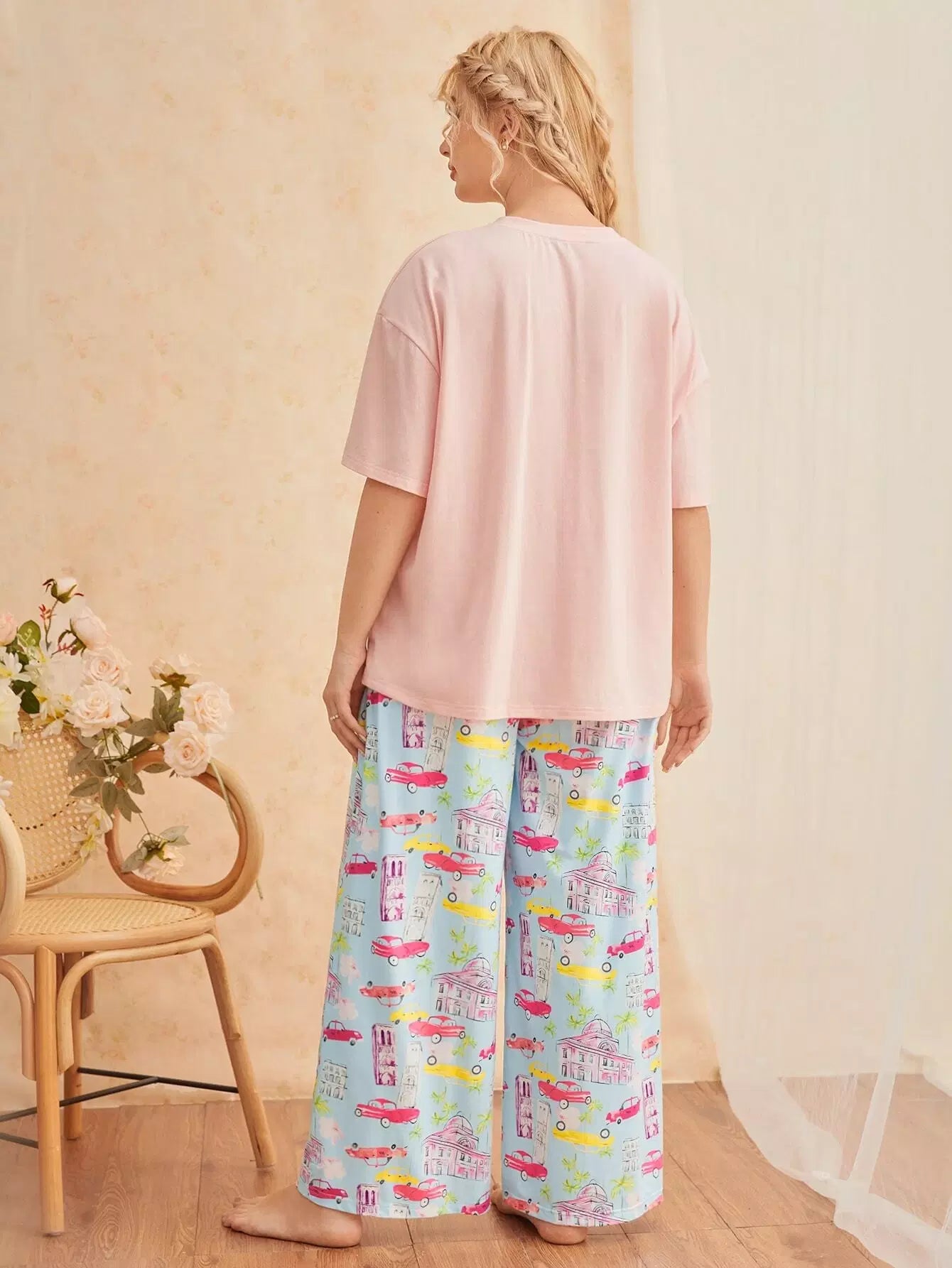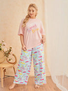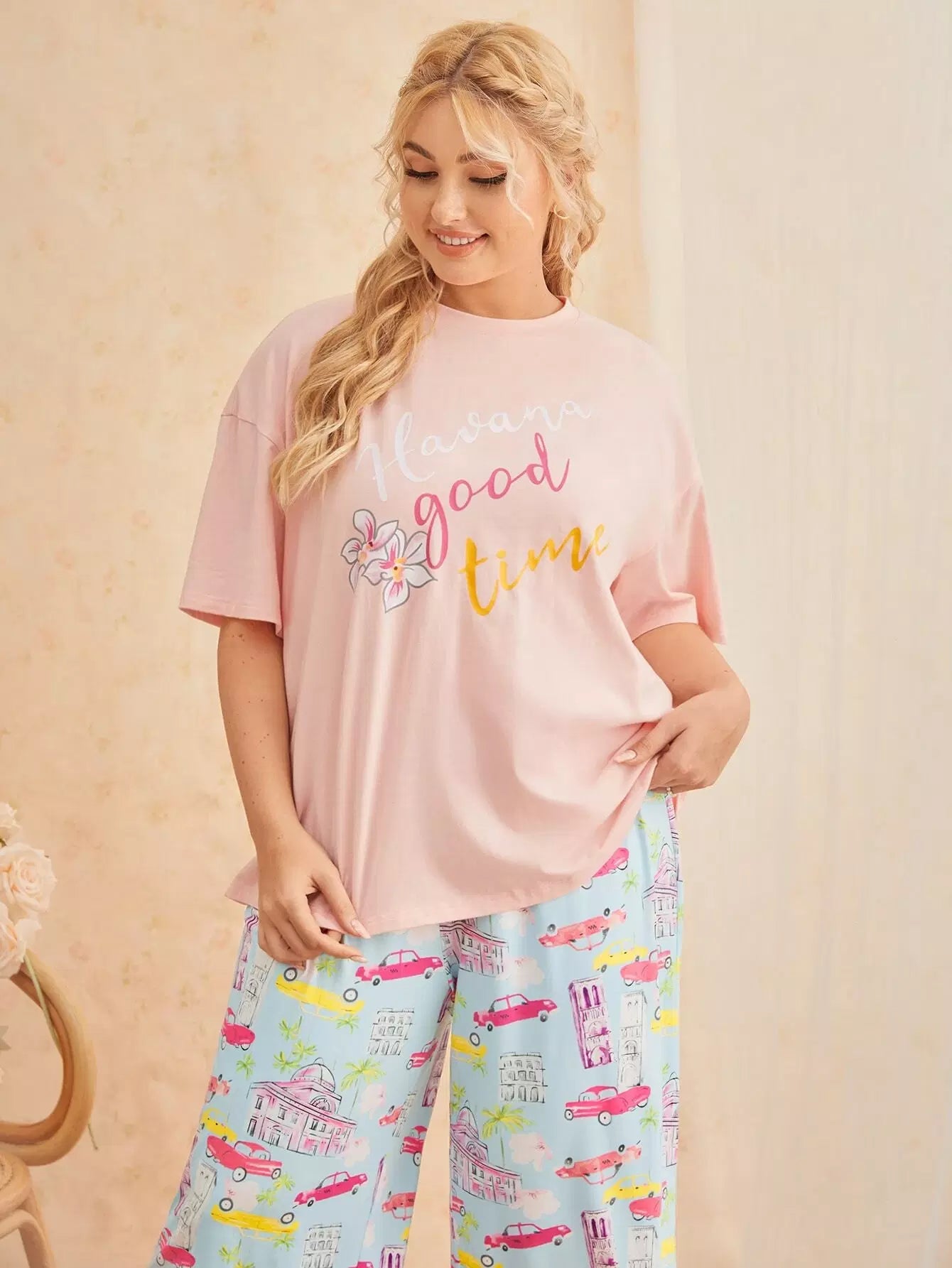 Plus Letter & Floral Print Tee and Pants PJ Set