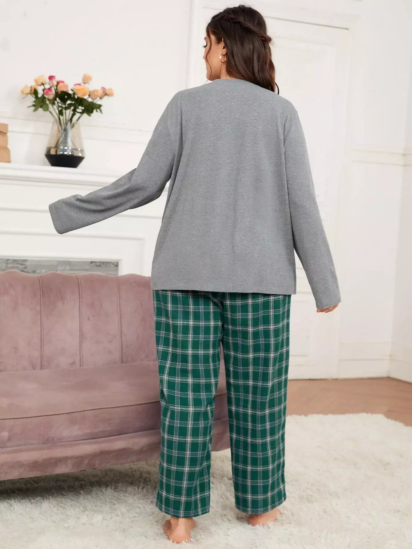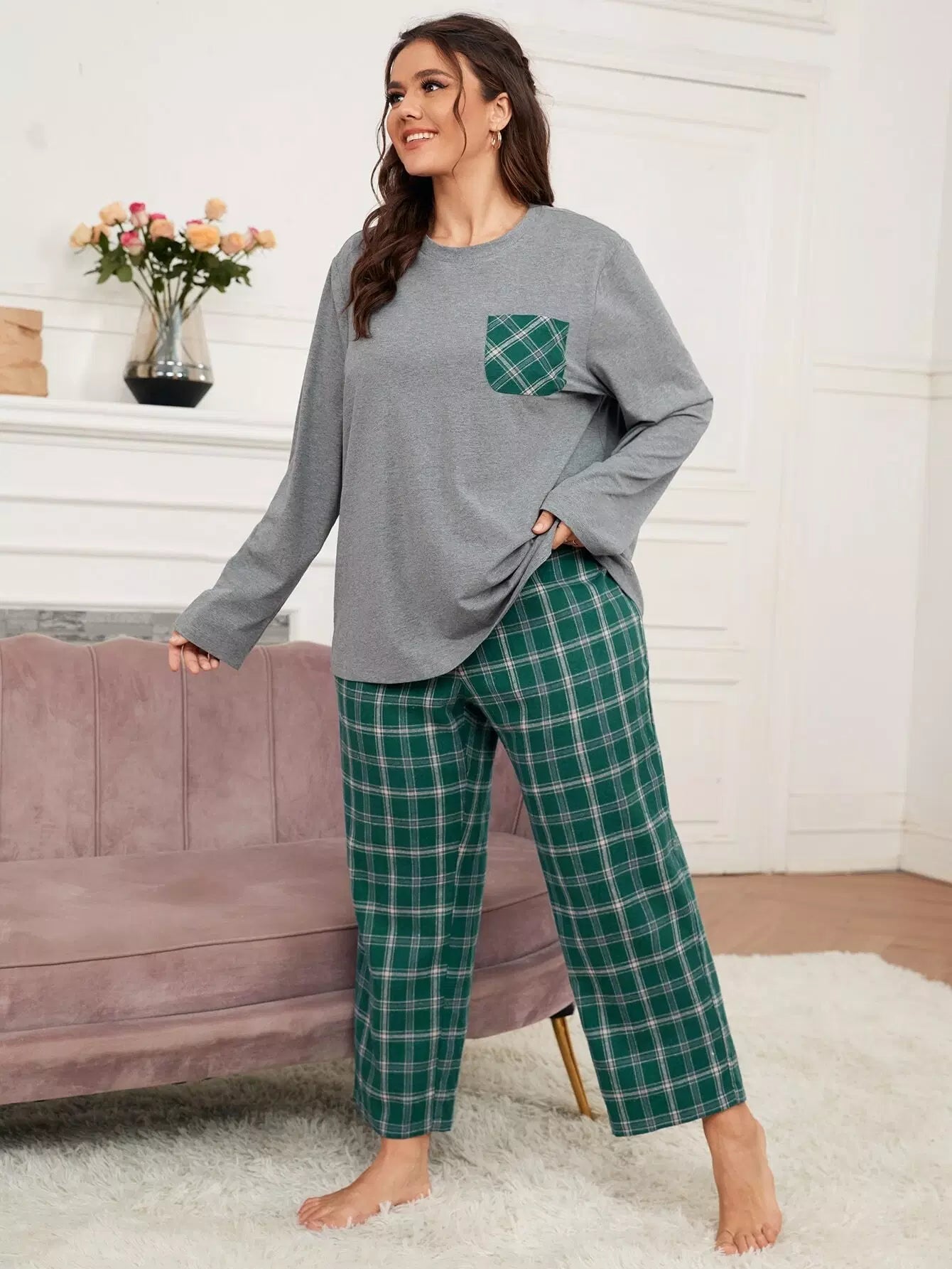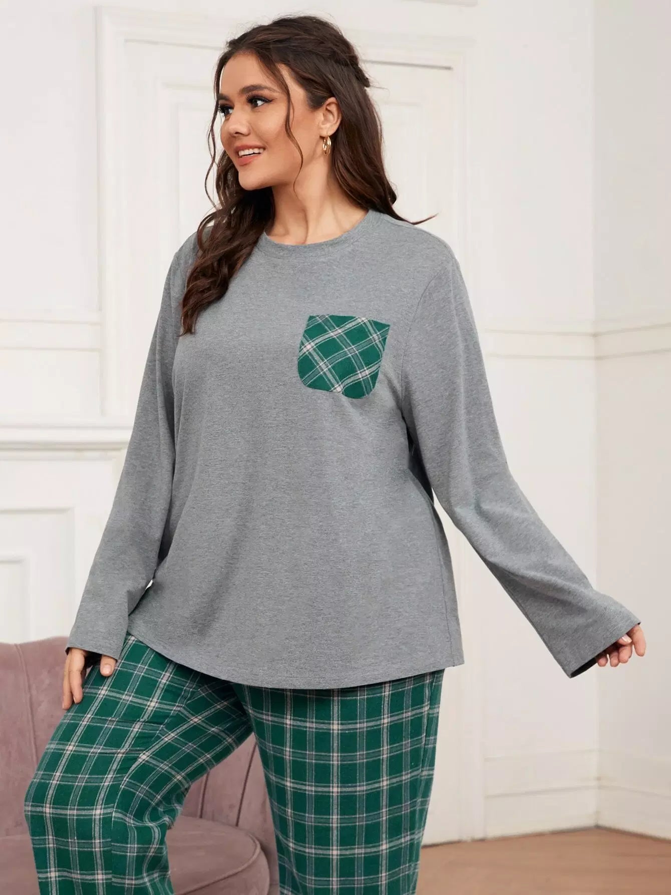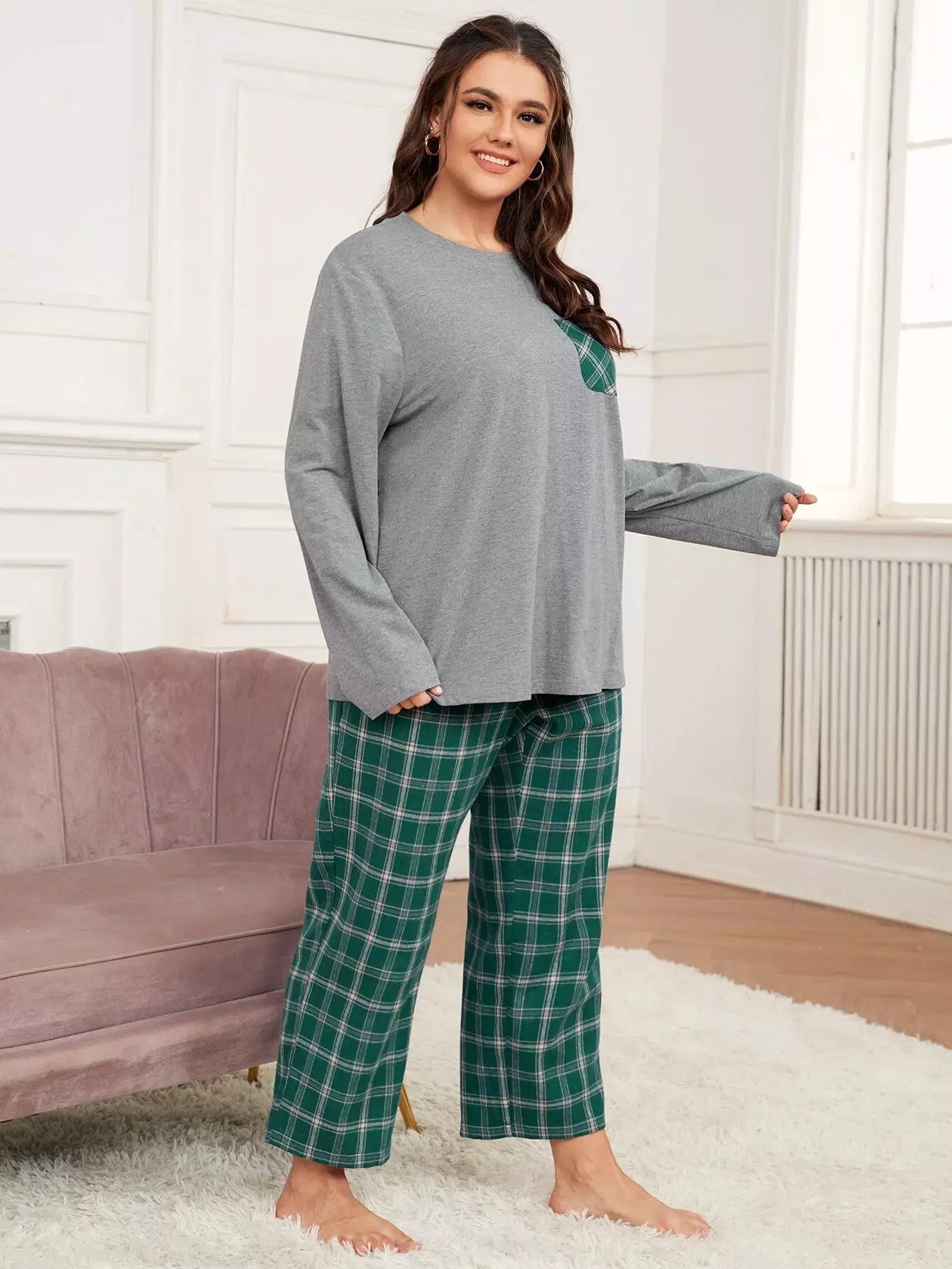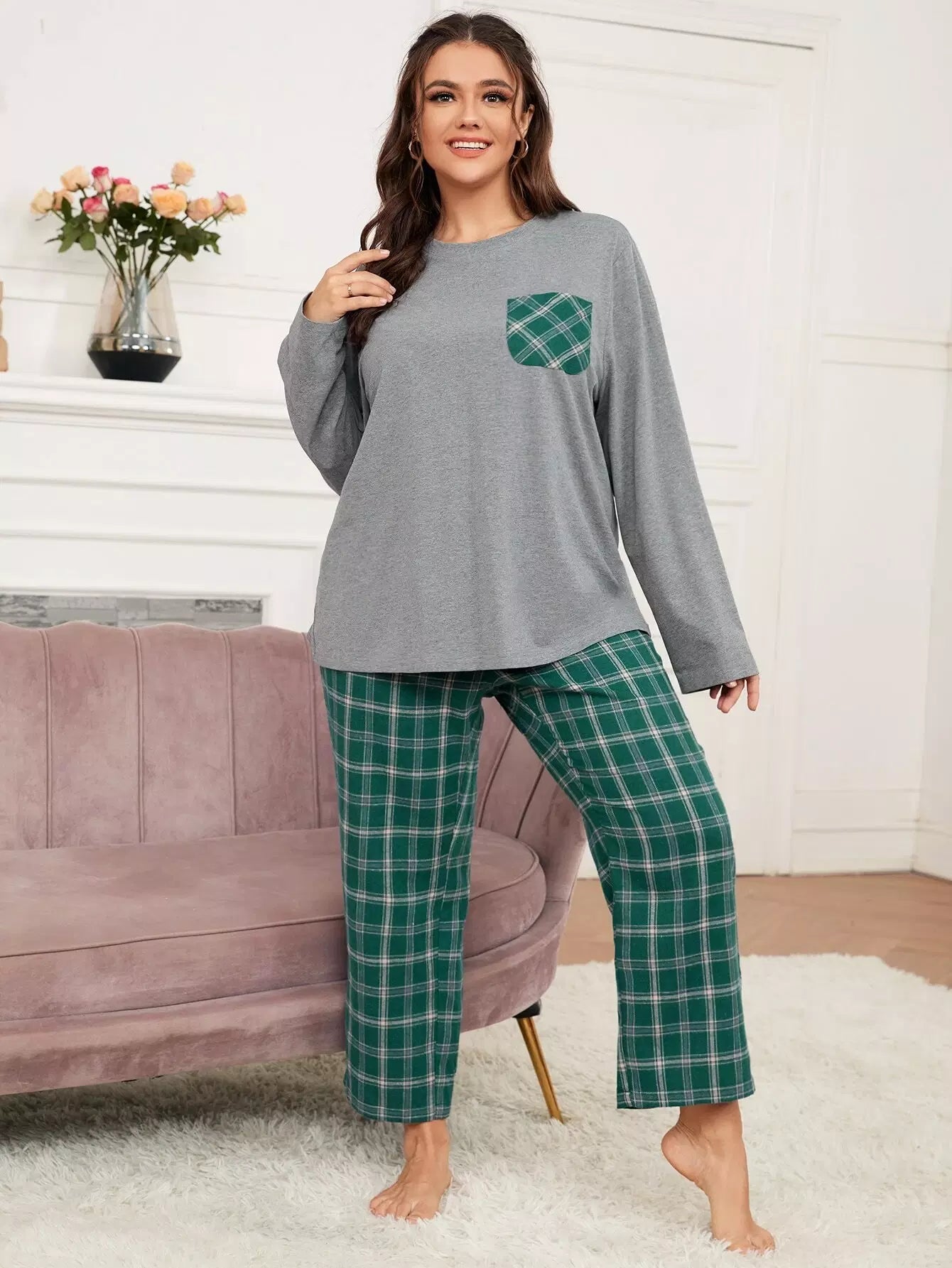 Plus Pocket Patched Top & Plaid Print Pants PJ Set