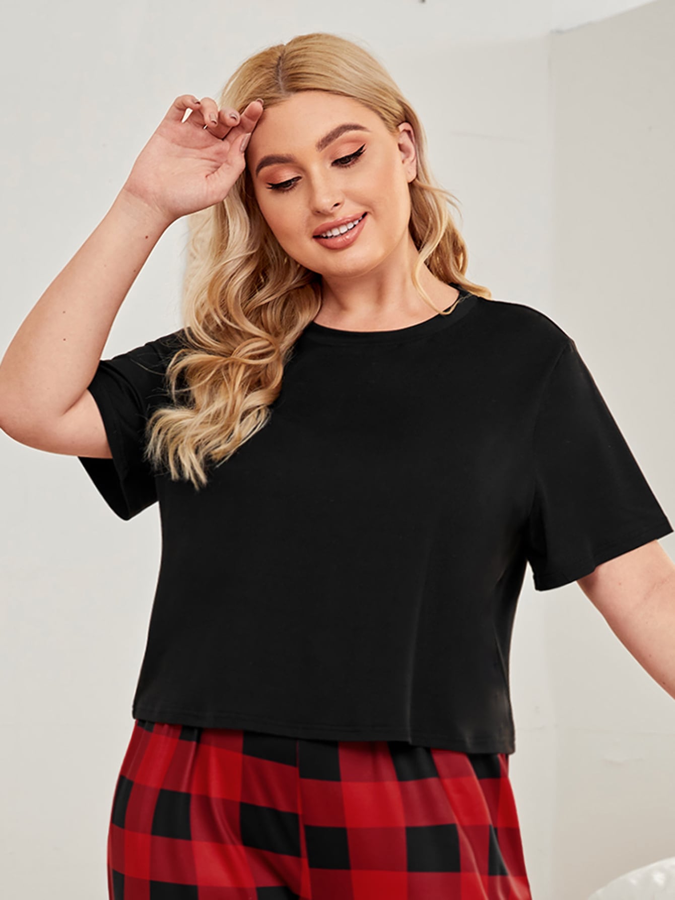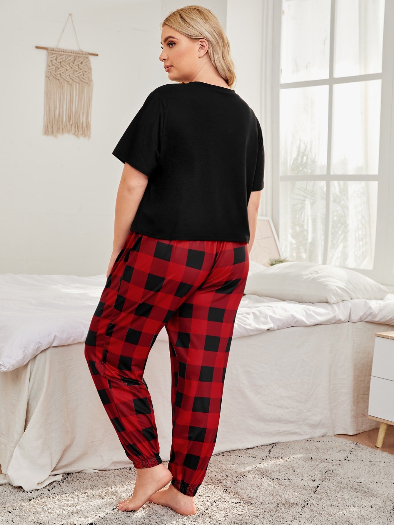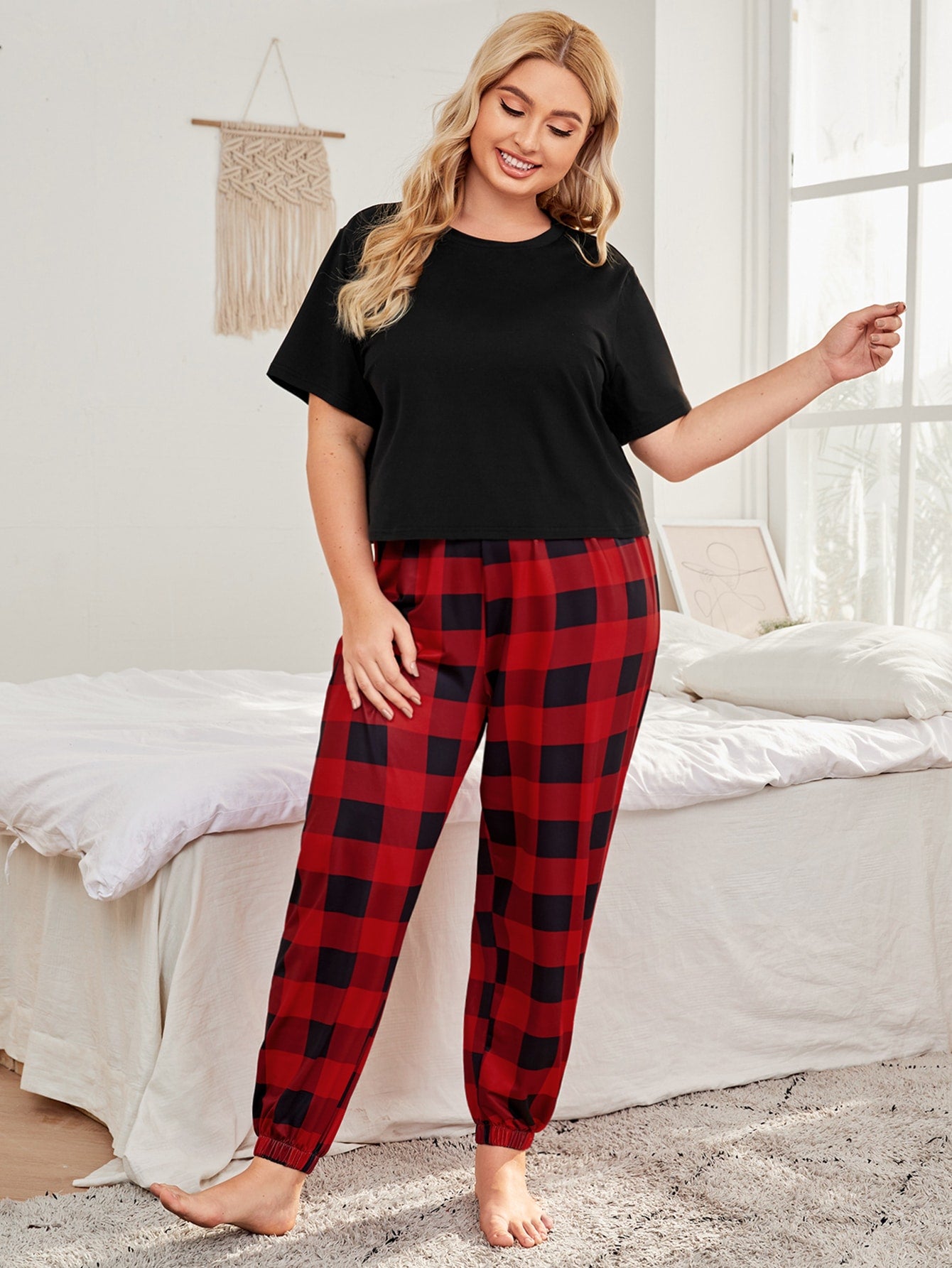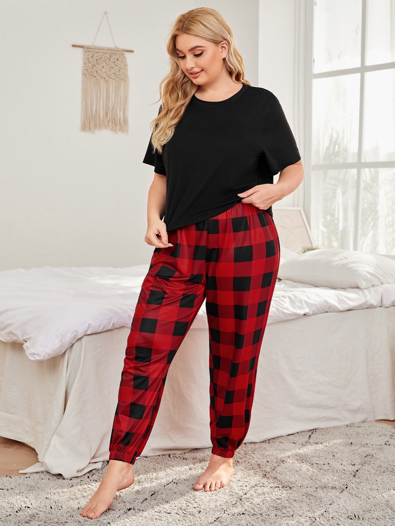 Plus Solid Tee With Plaid Print Pants PJ Set