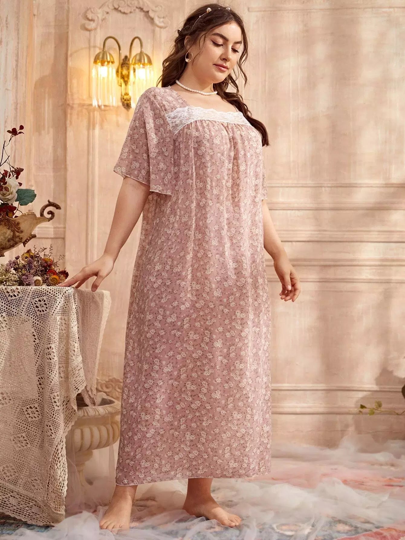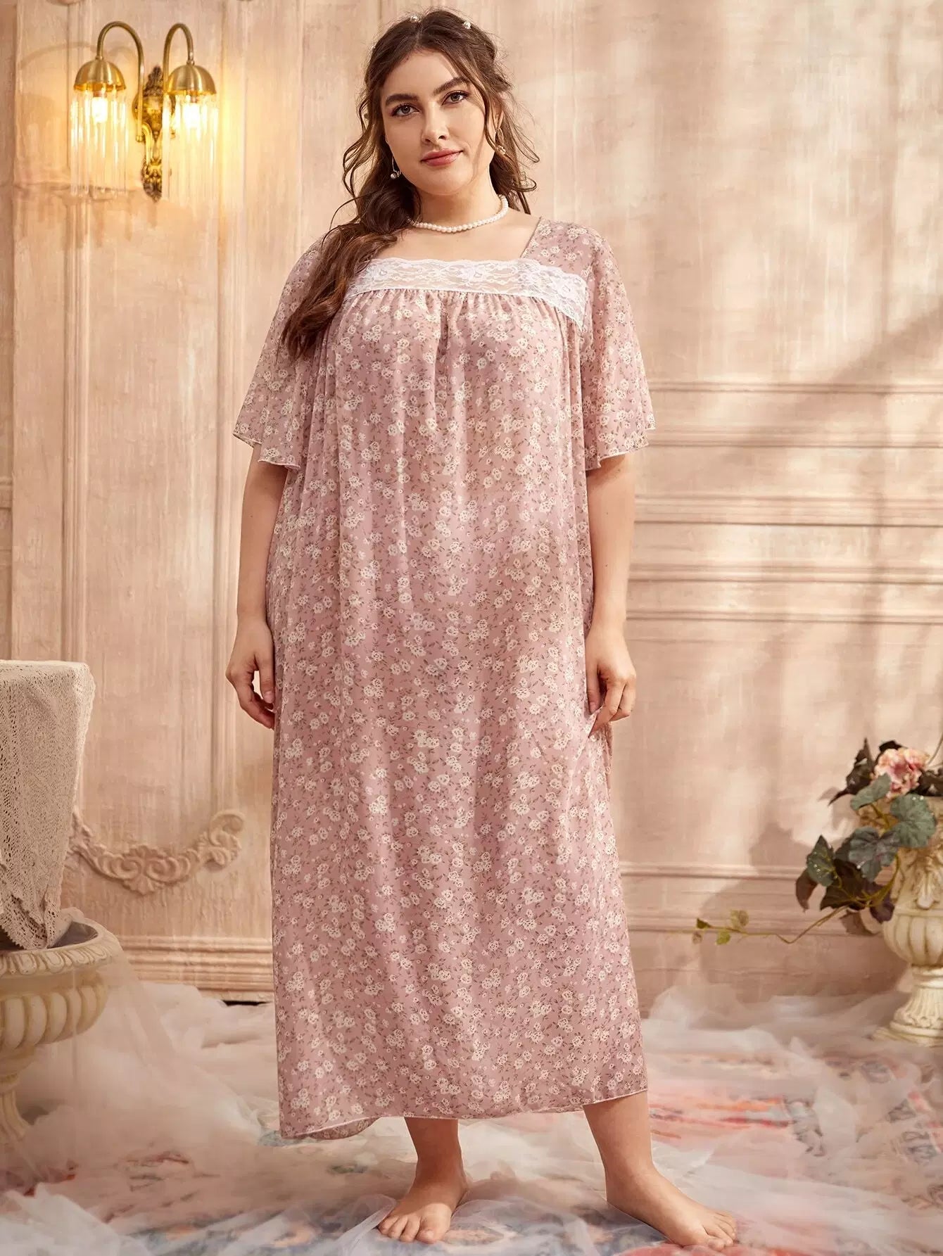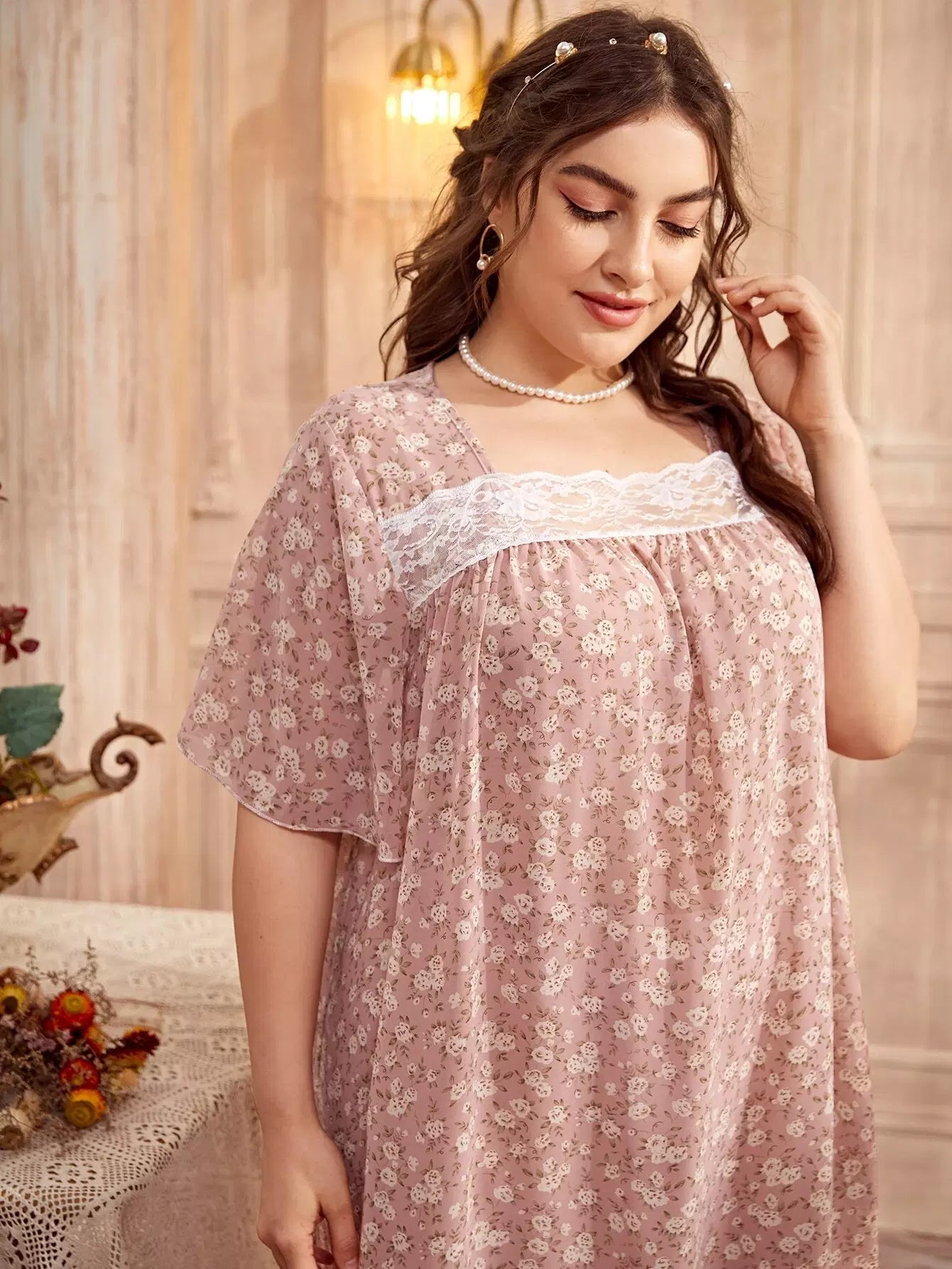 Plus All Over Floral Print Square Neck Contrast Lace Night Dress