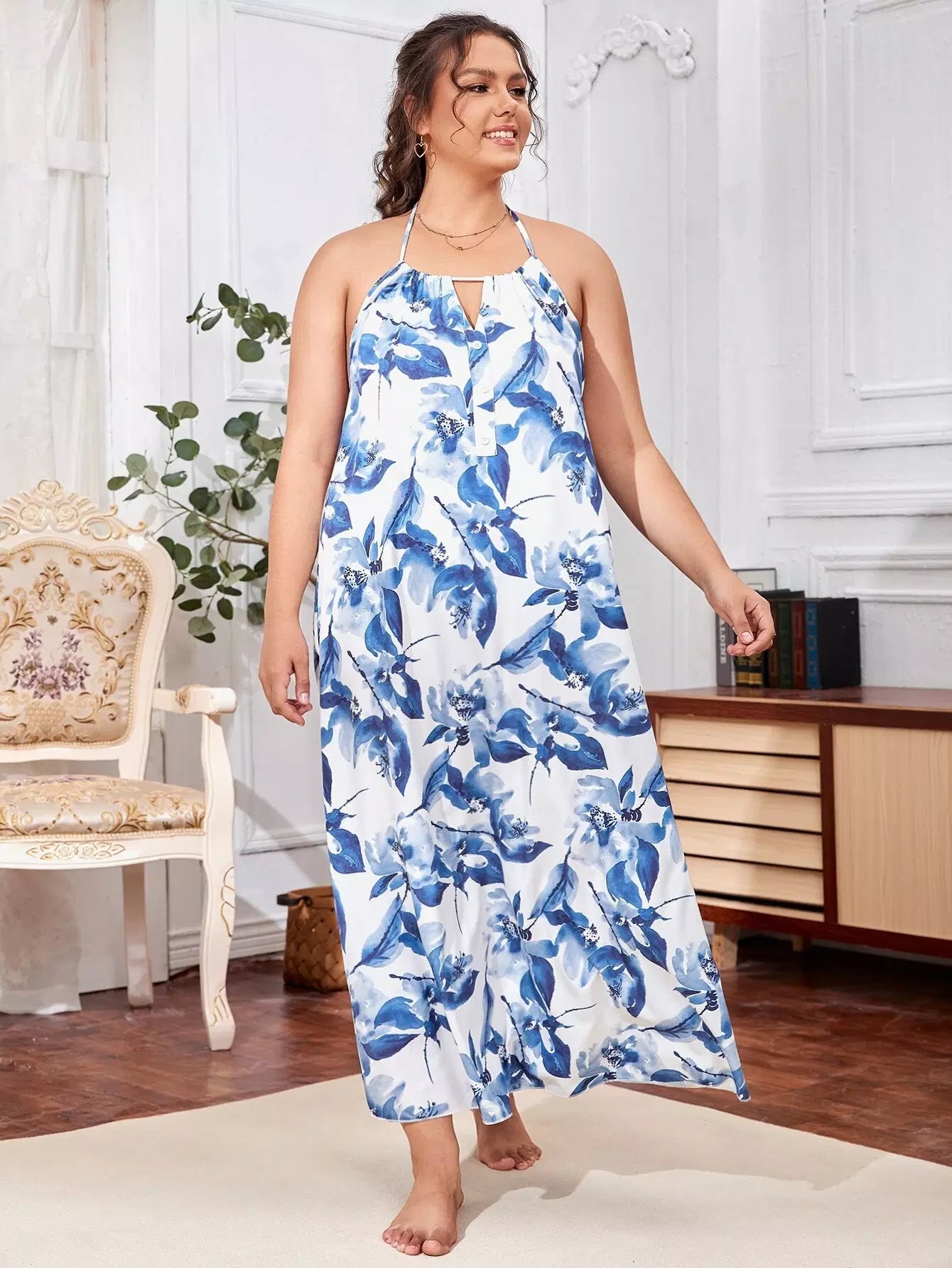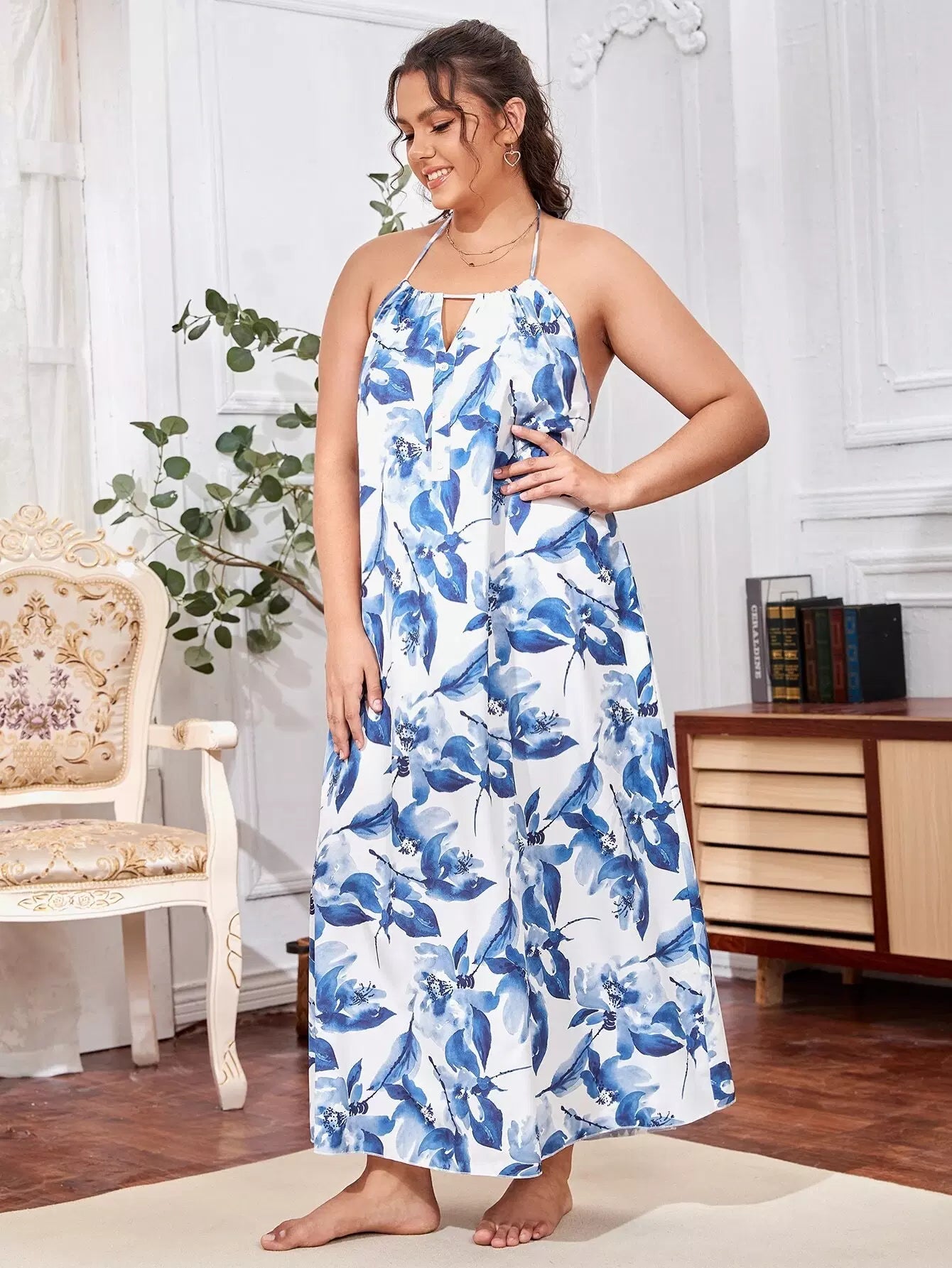 Plus Allover Floral Print Backless Night Dress