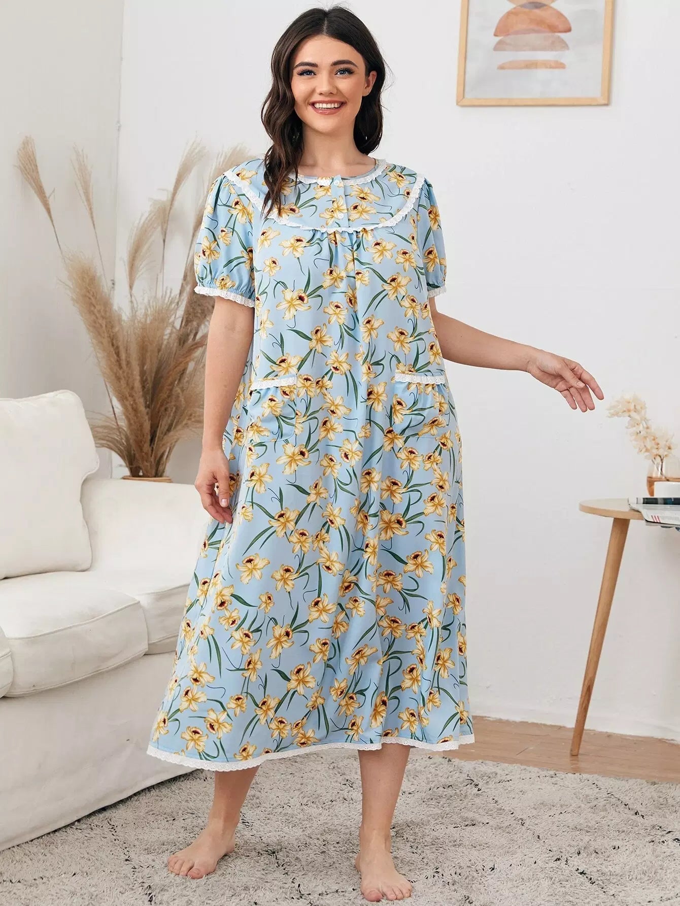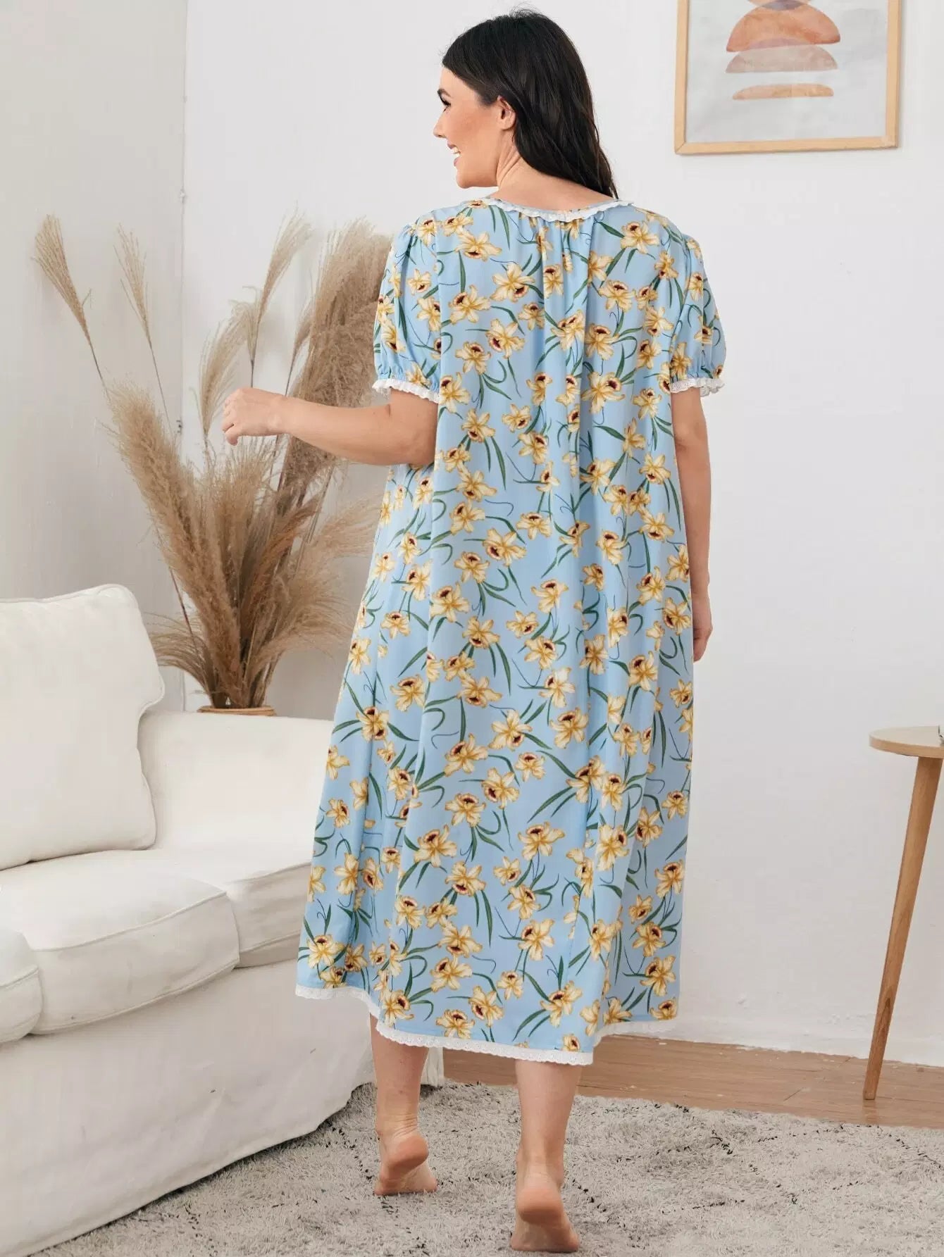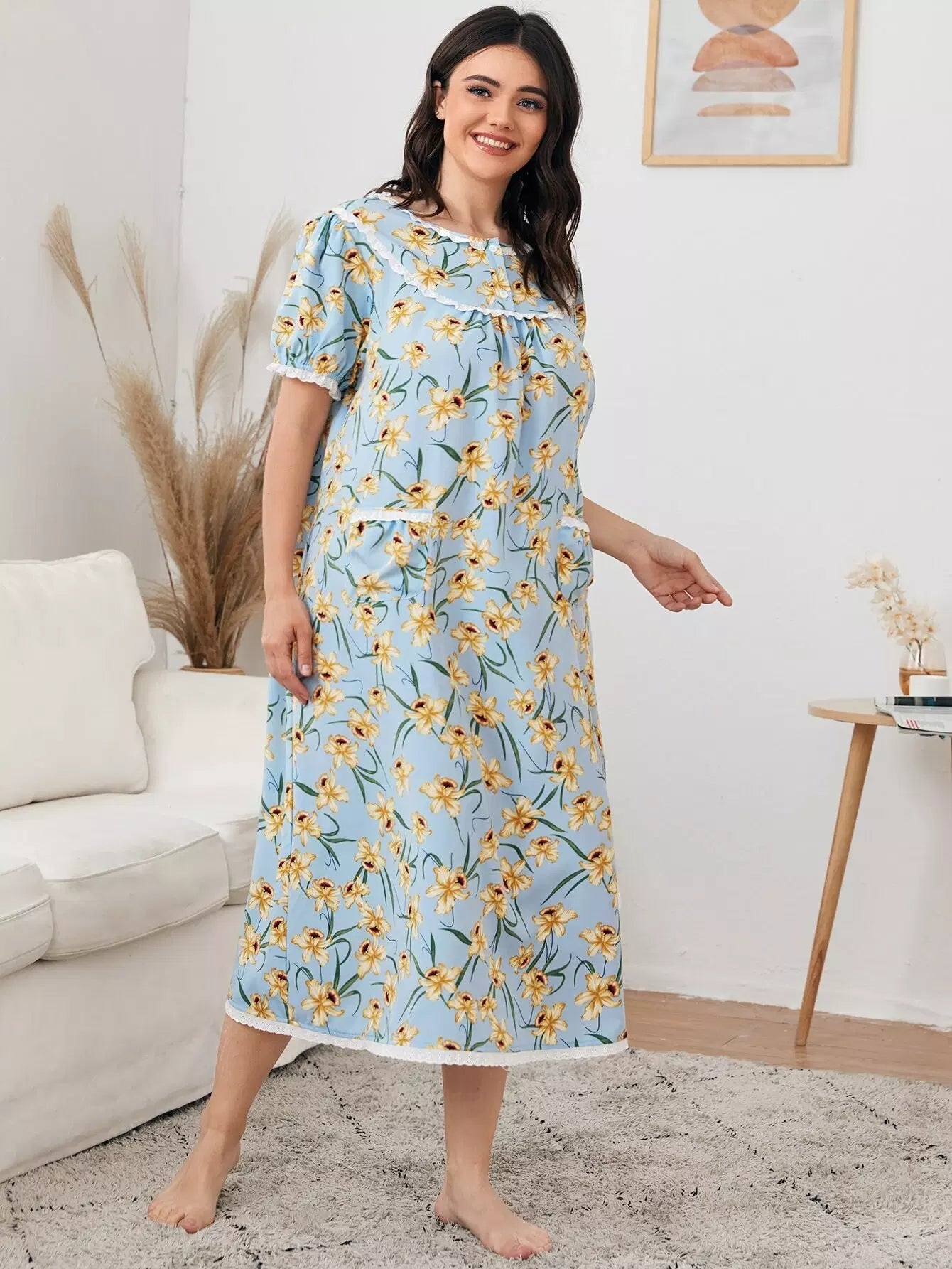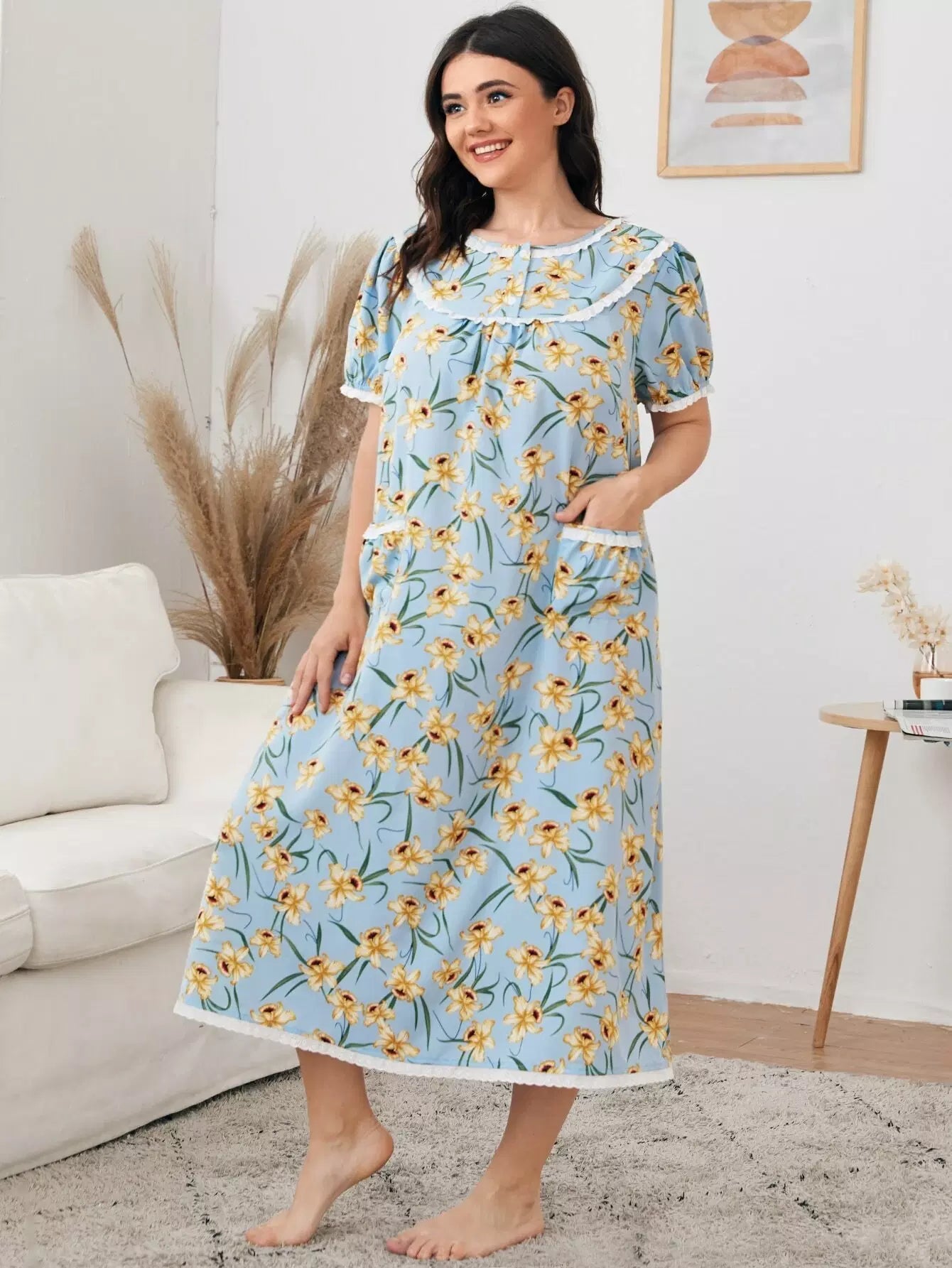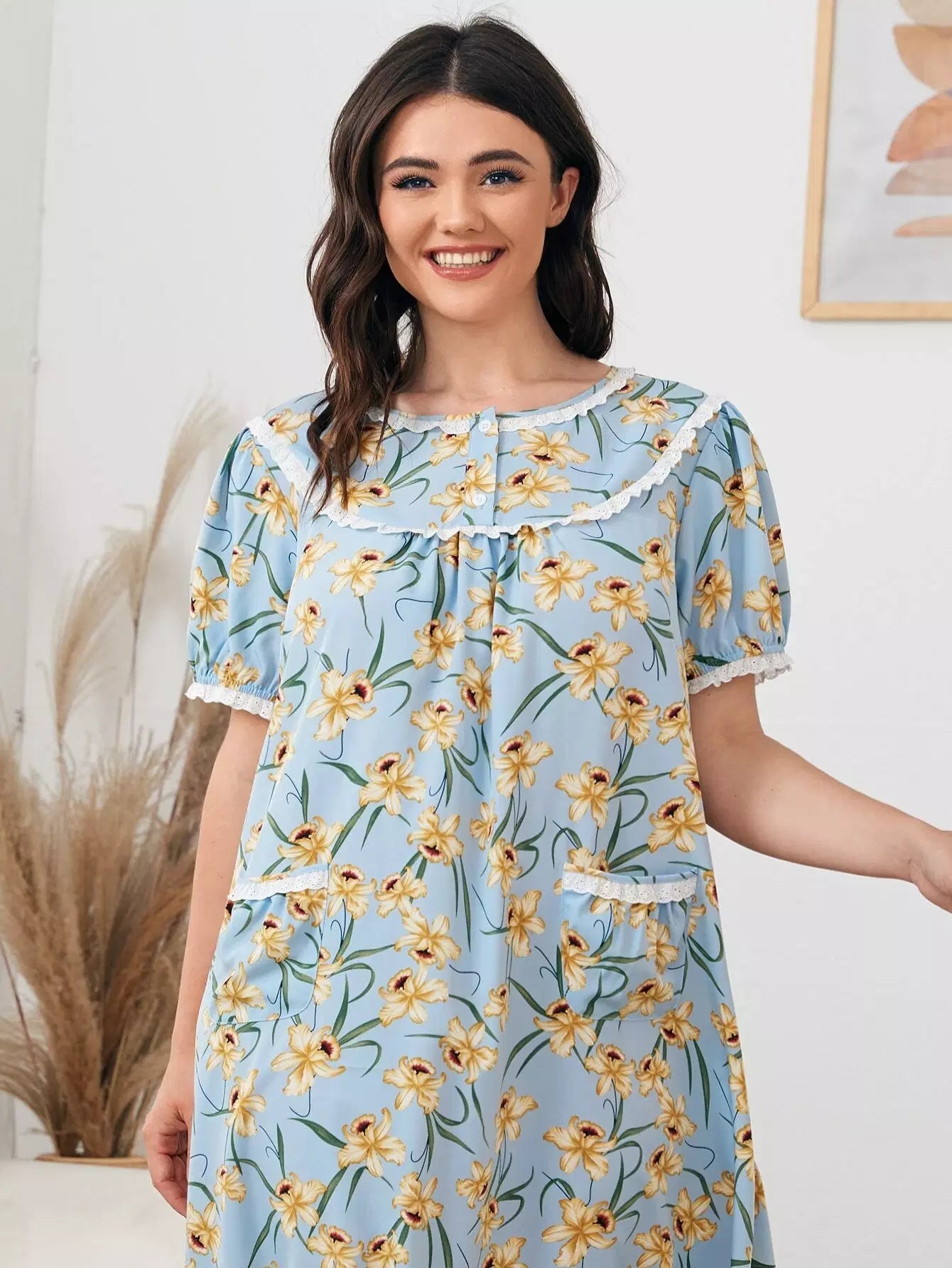 Plus Contrast Schiffy Trim Allover Floral Print Nightdress