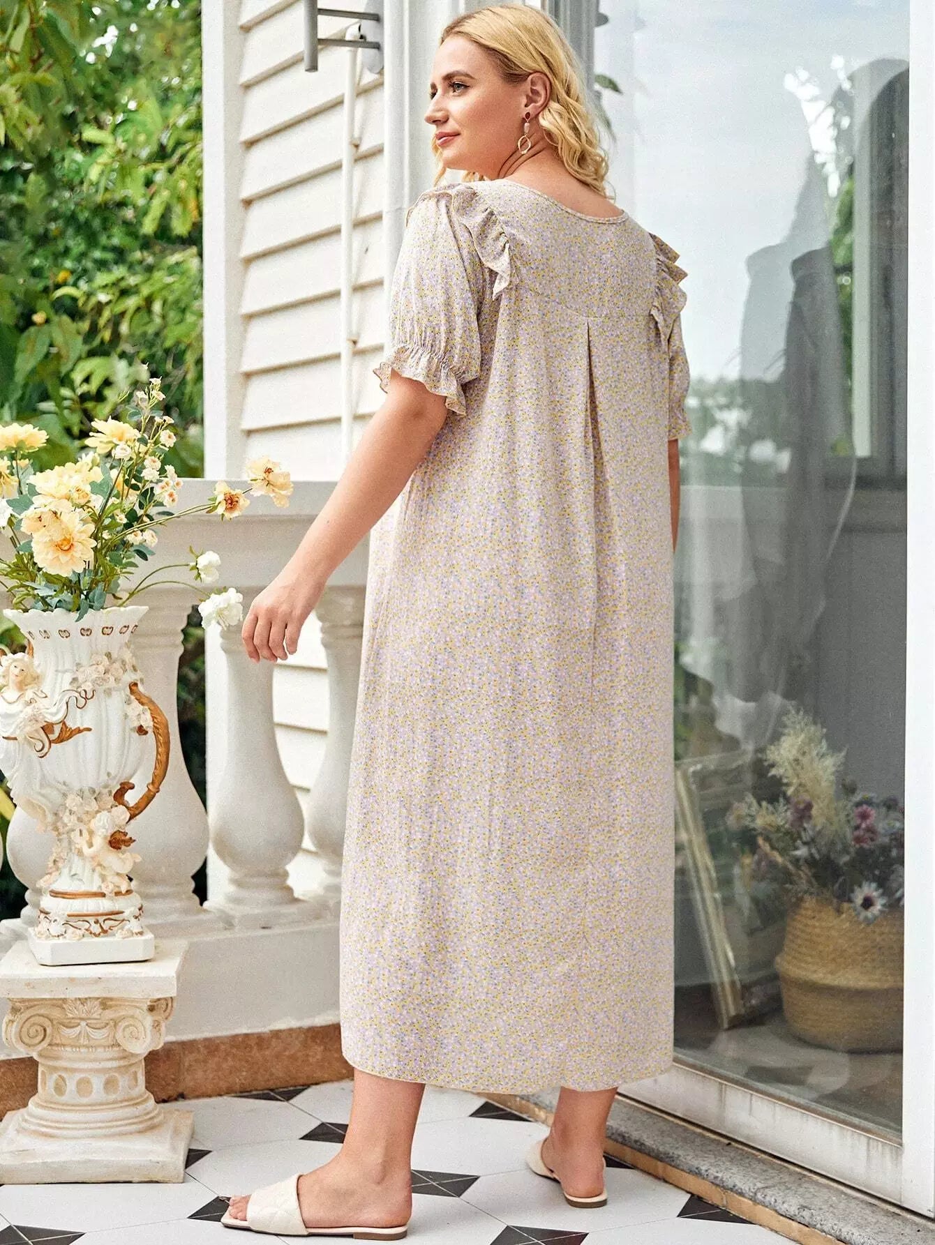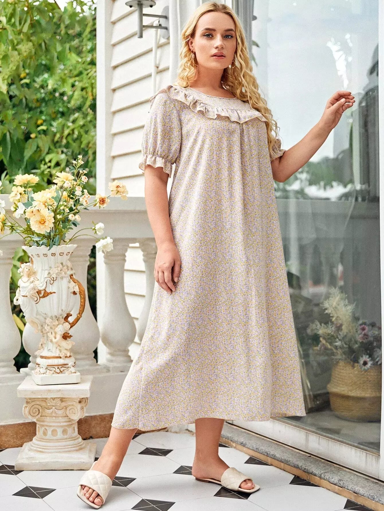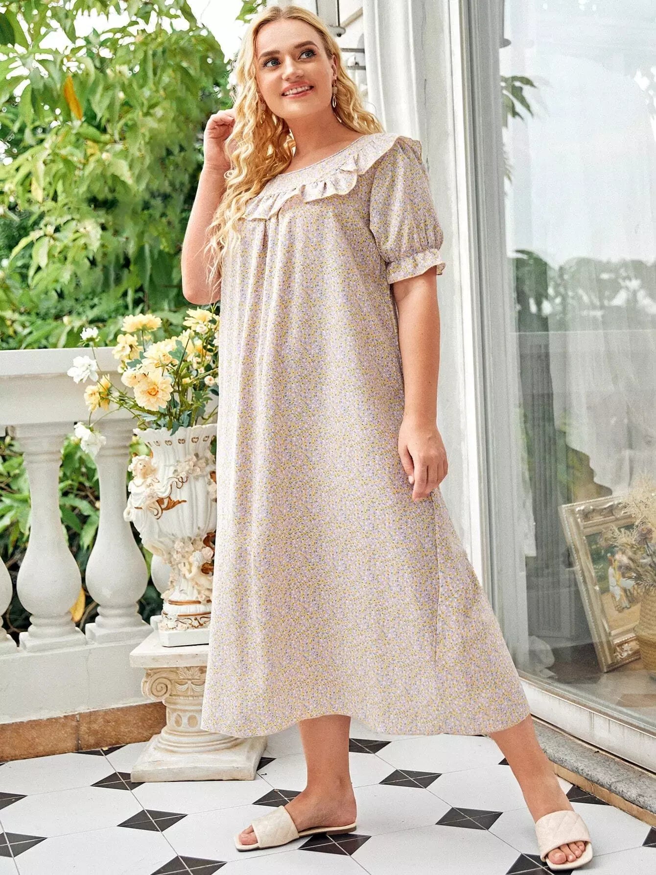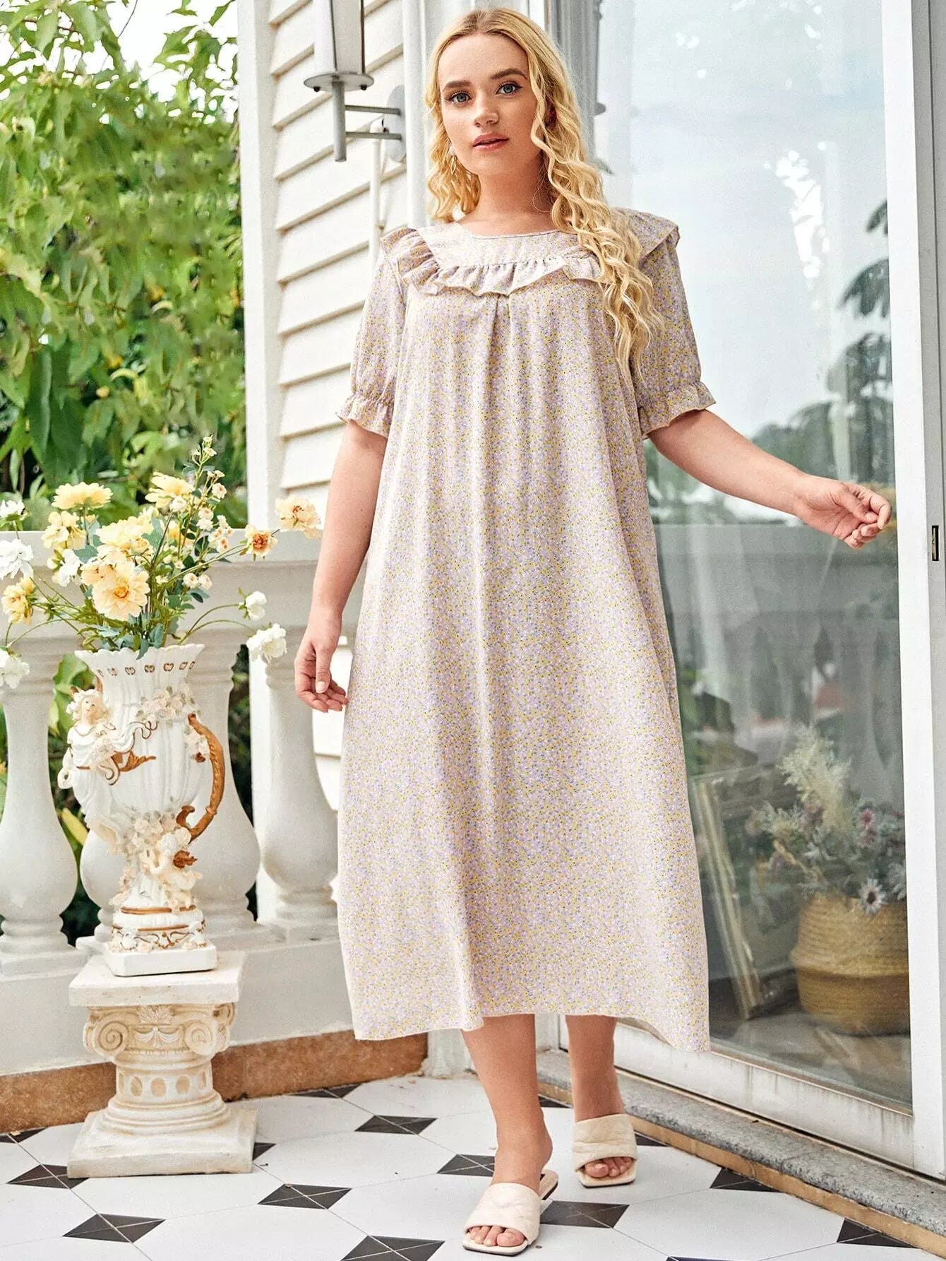Plus Ditsy Floral Ruffle Trim Pajama Dress