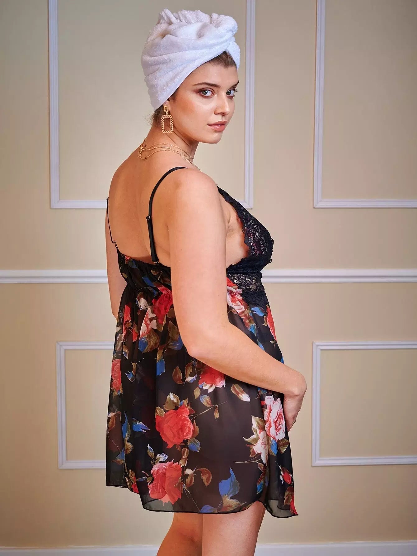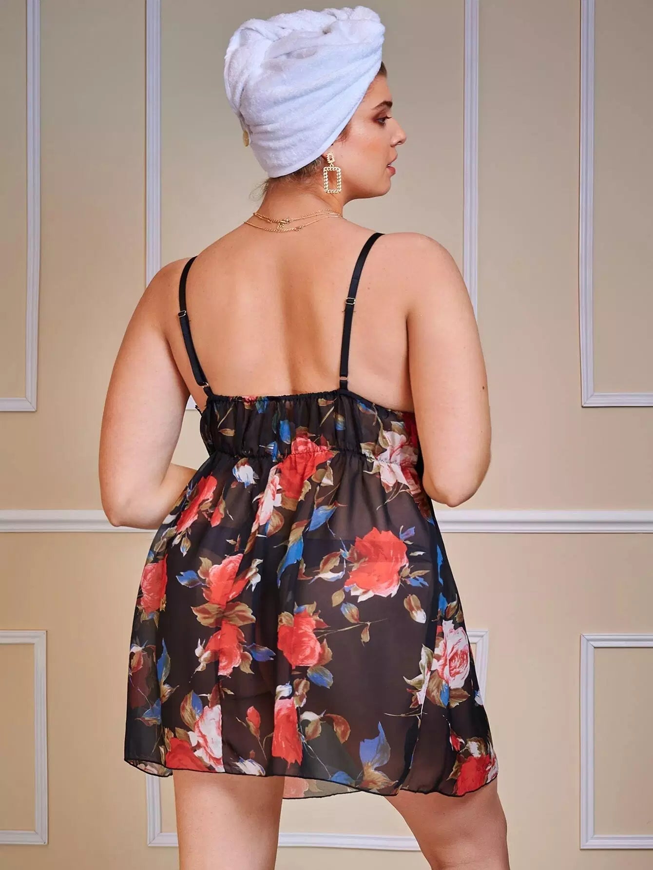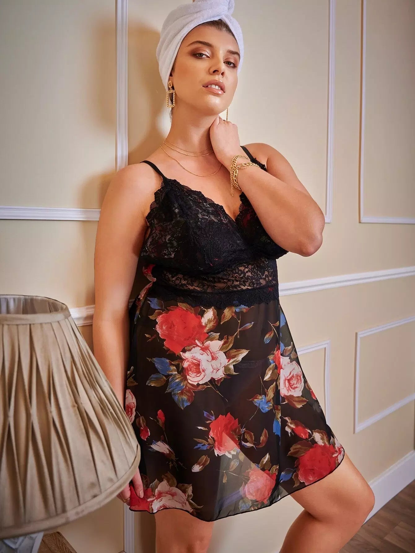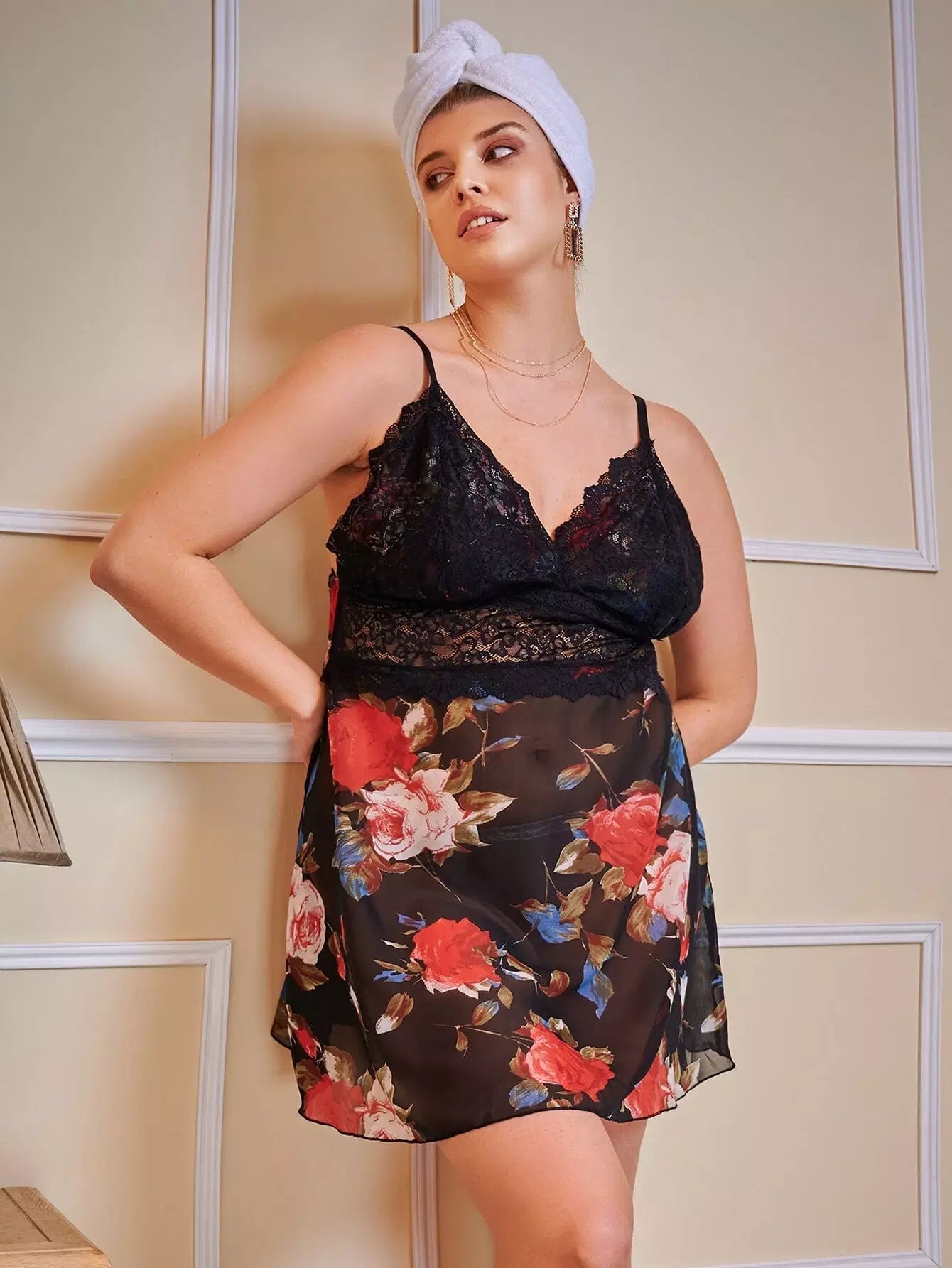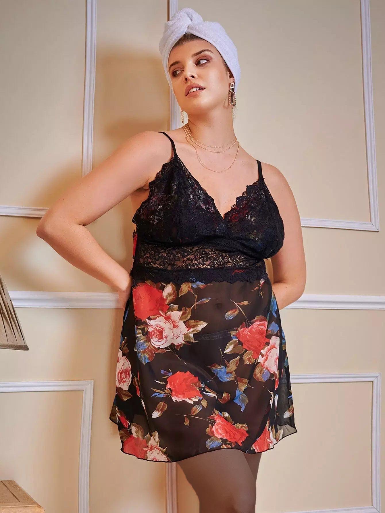 Plus Floral Mesh Contrast Lace Cami Nightdress