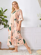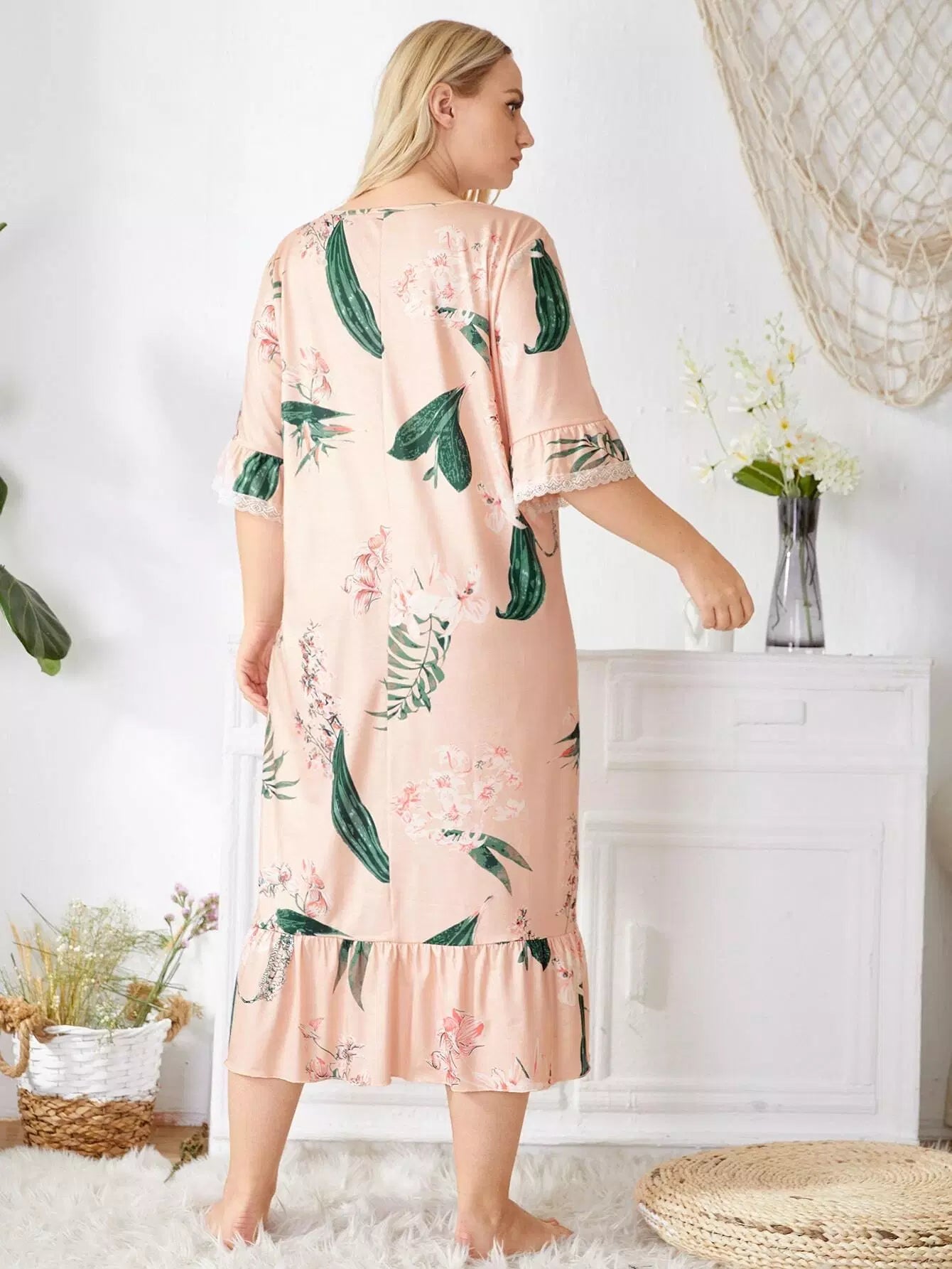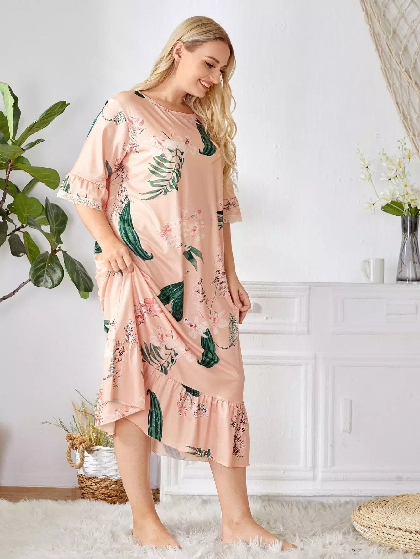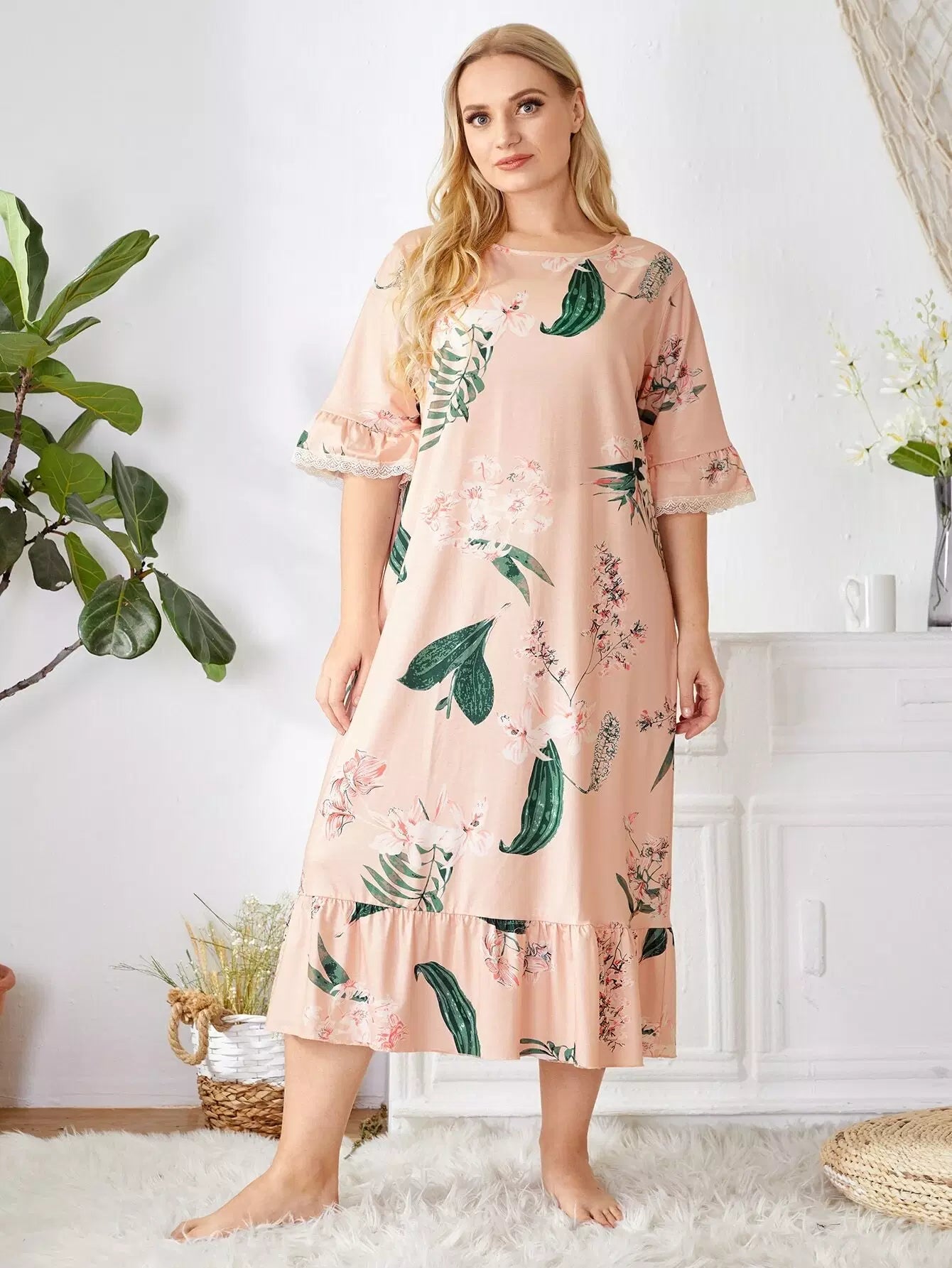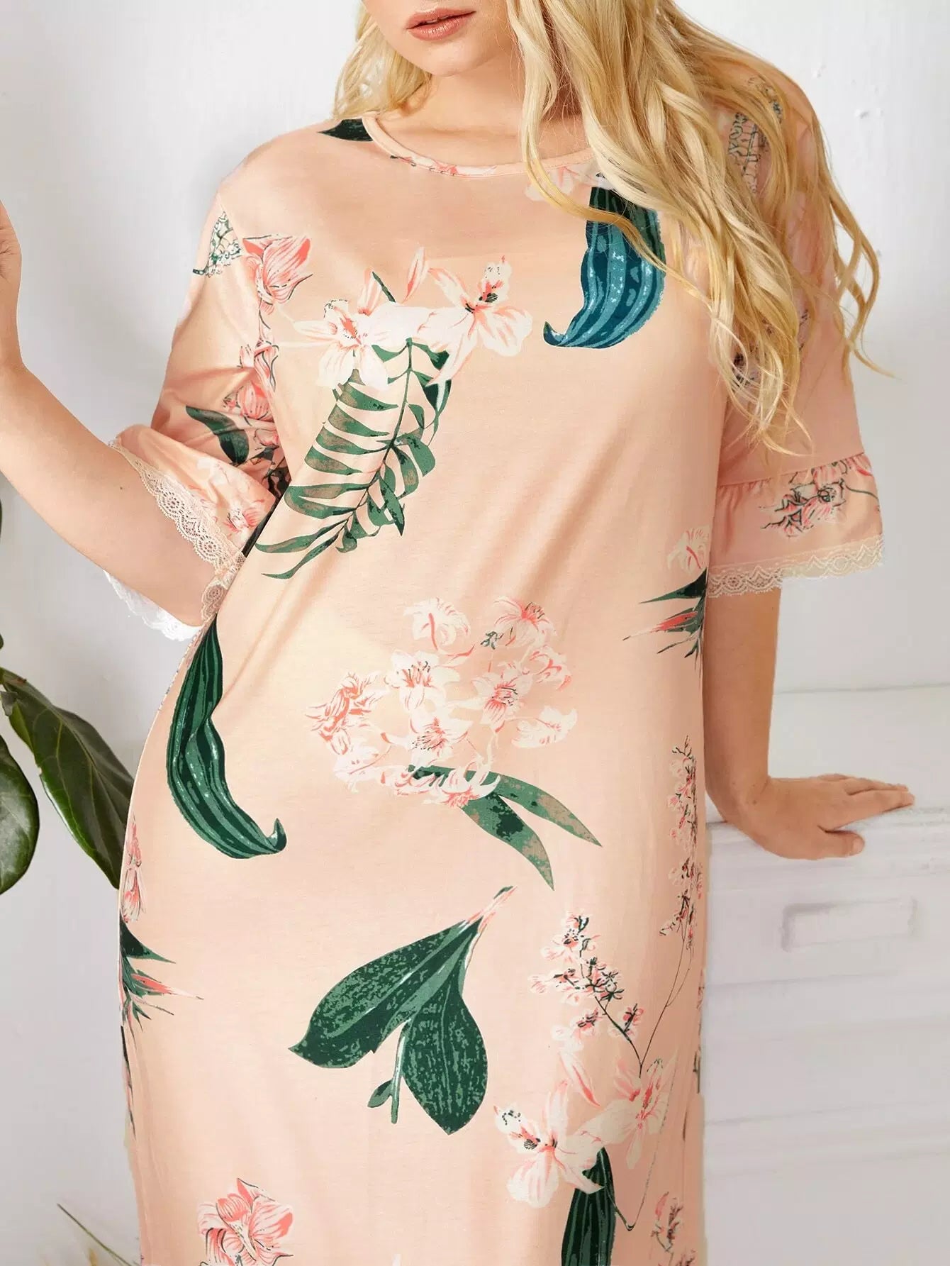Plus Floral Print Contrast Lace Ruffle Hem Night Dress