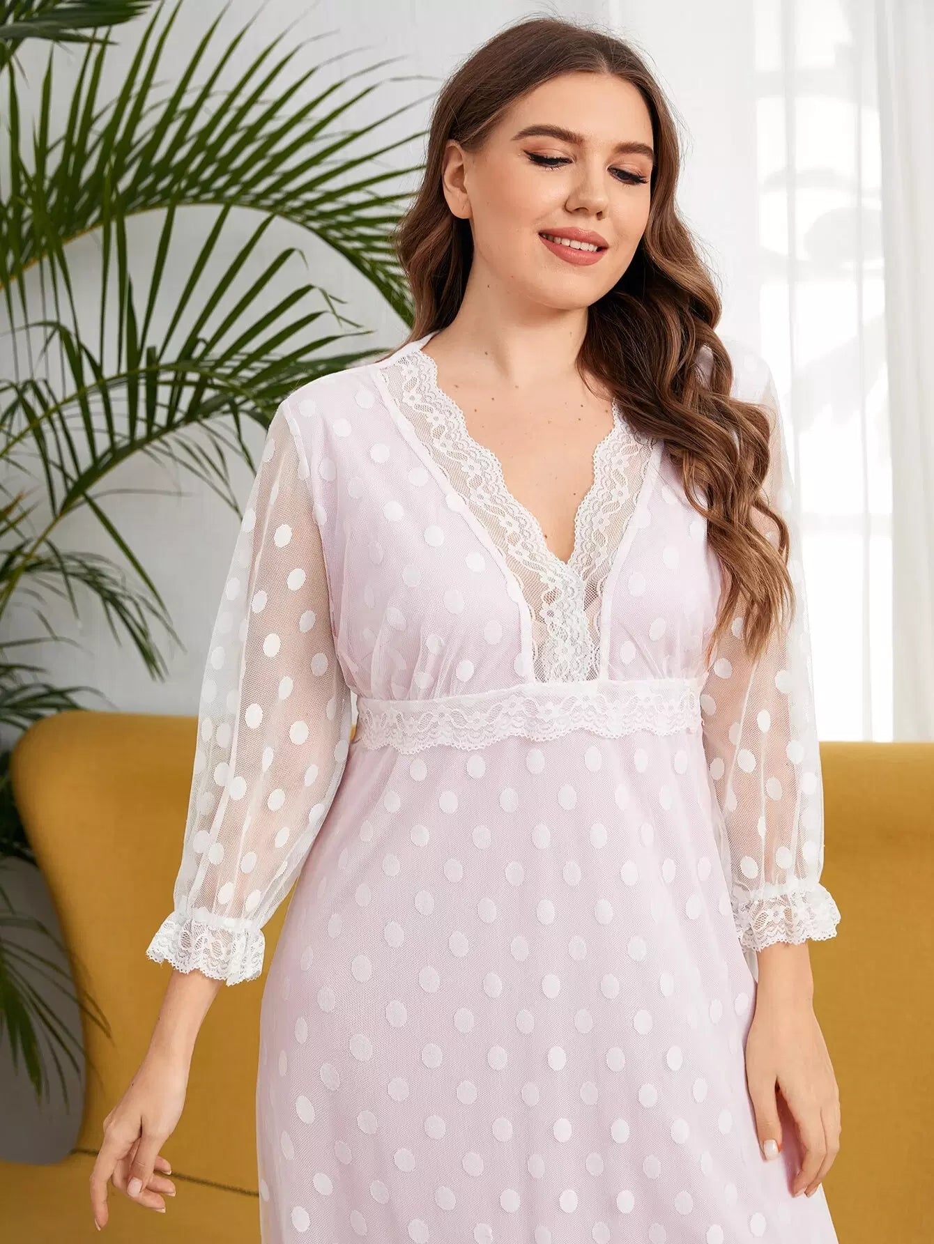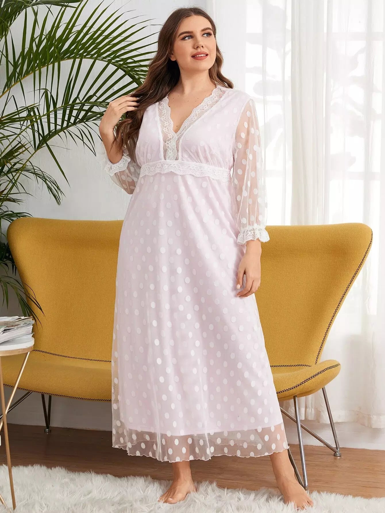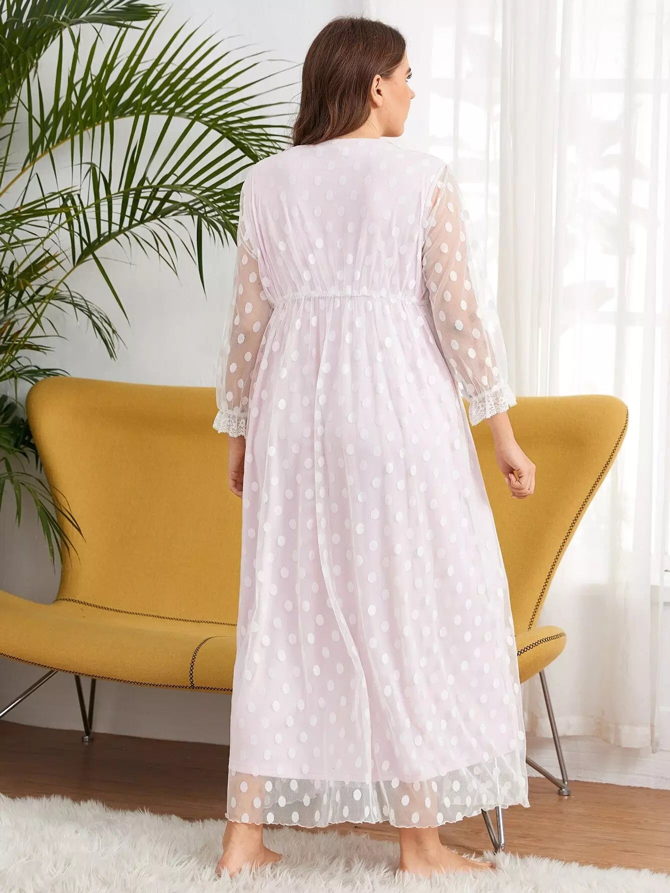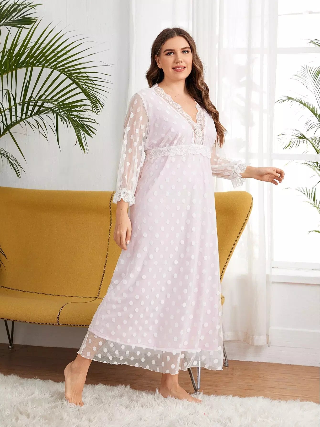 Plus Polka Dot Print Lace Trim Mesh Overlay Nightdress
