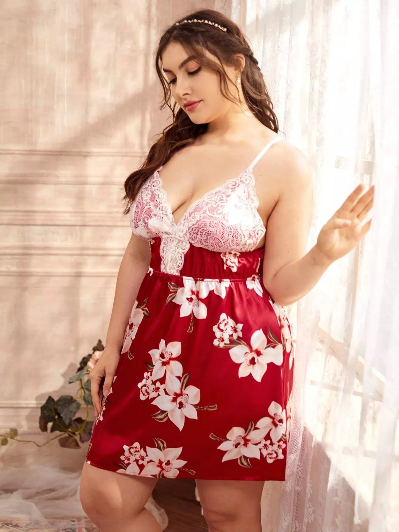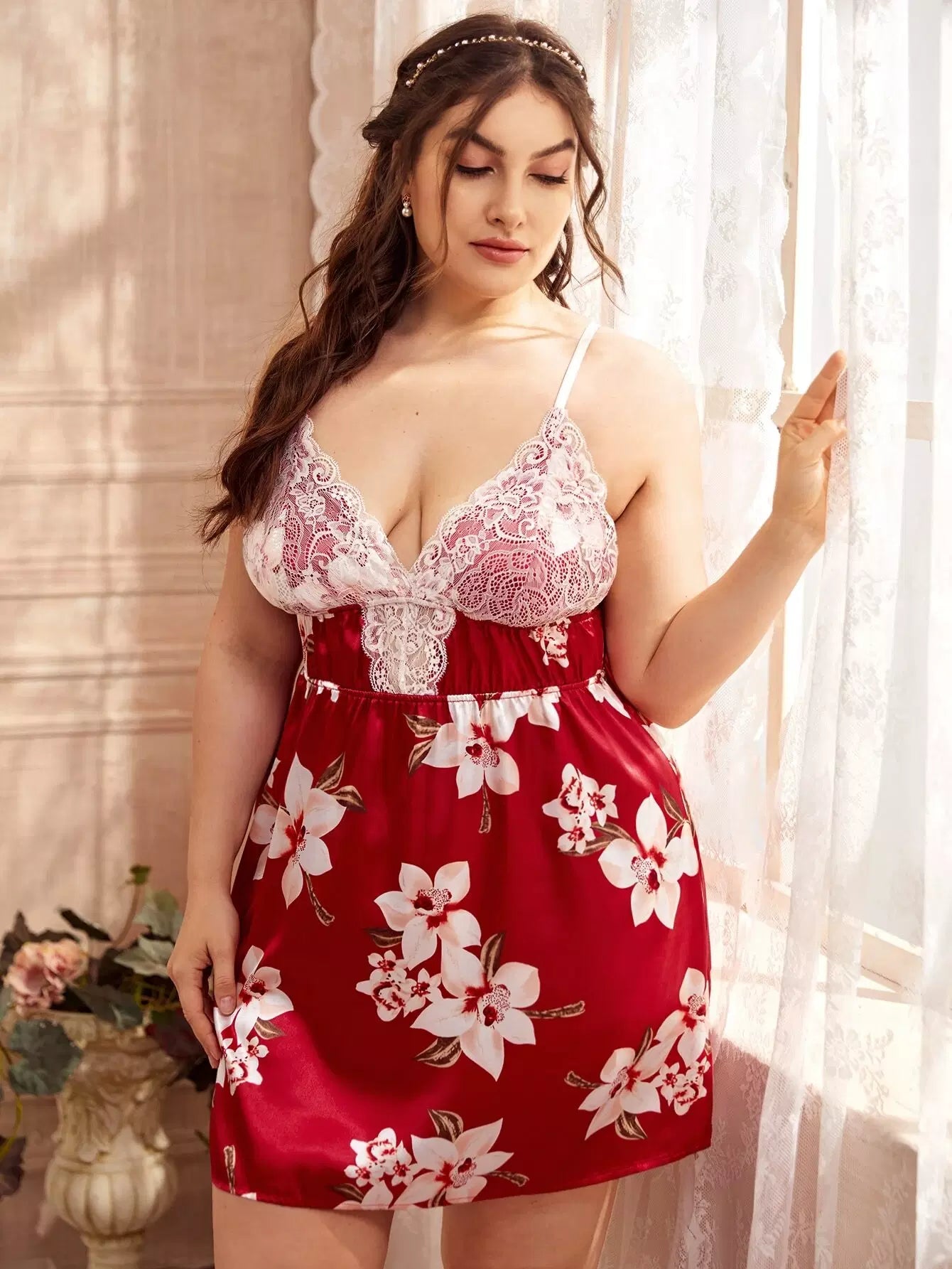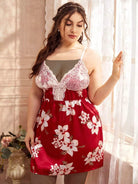 Women - Plus Satin Floral Print Contrast Lace Cami Night Dress