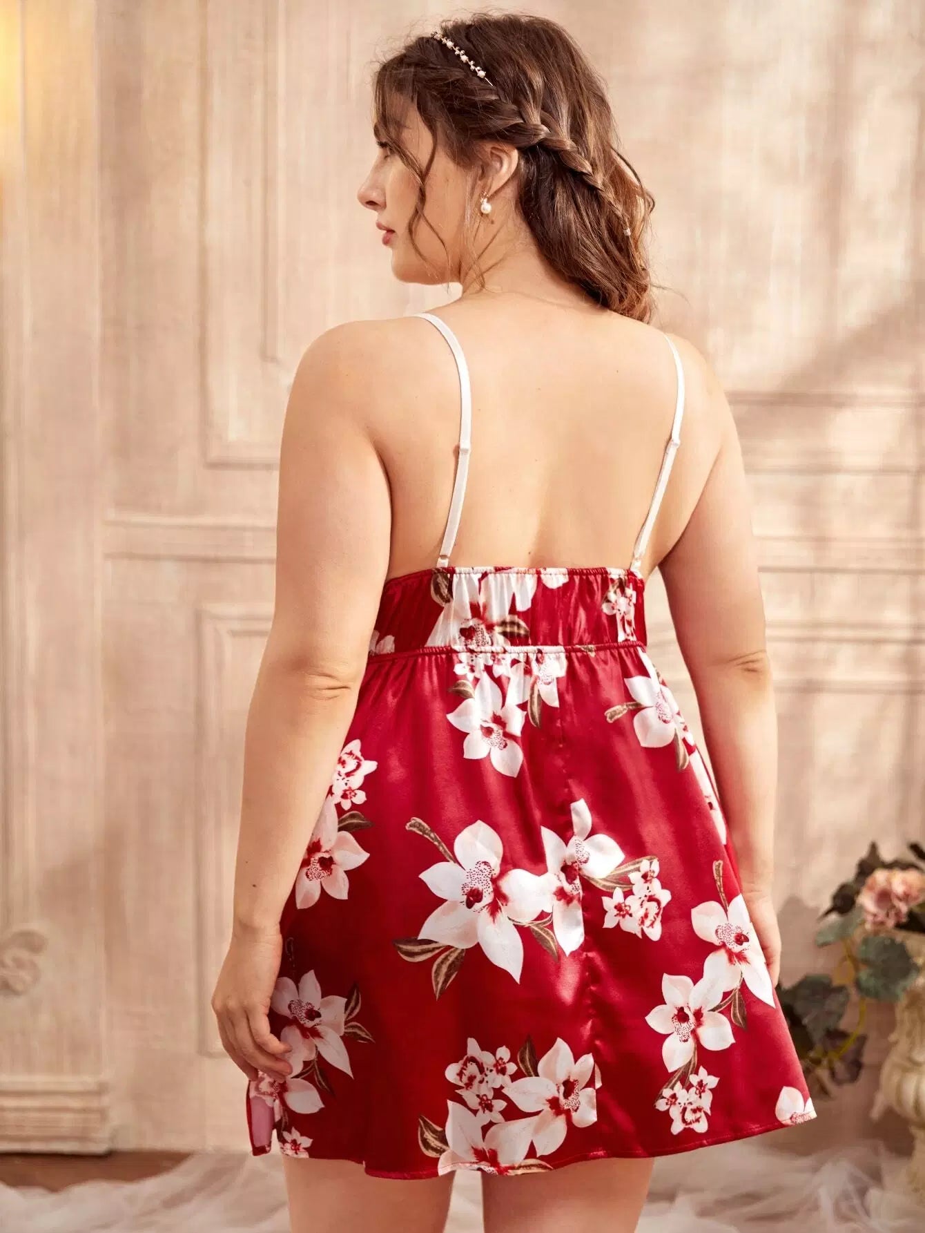 Plus Satin Floral Print Contrast Lace Cami Night Dress