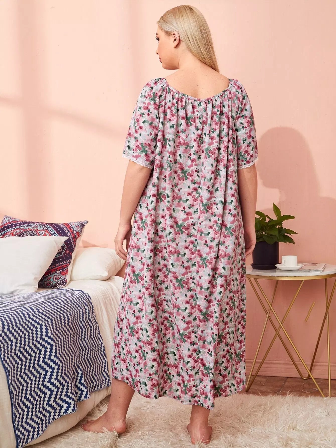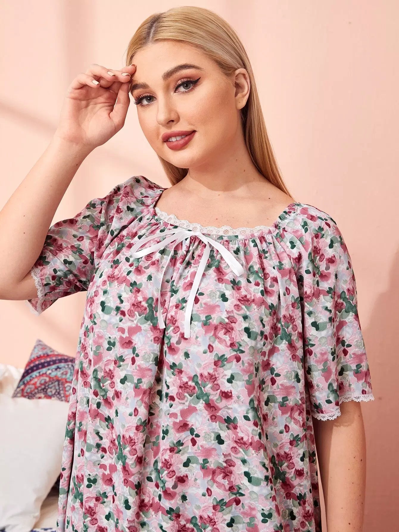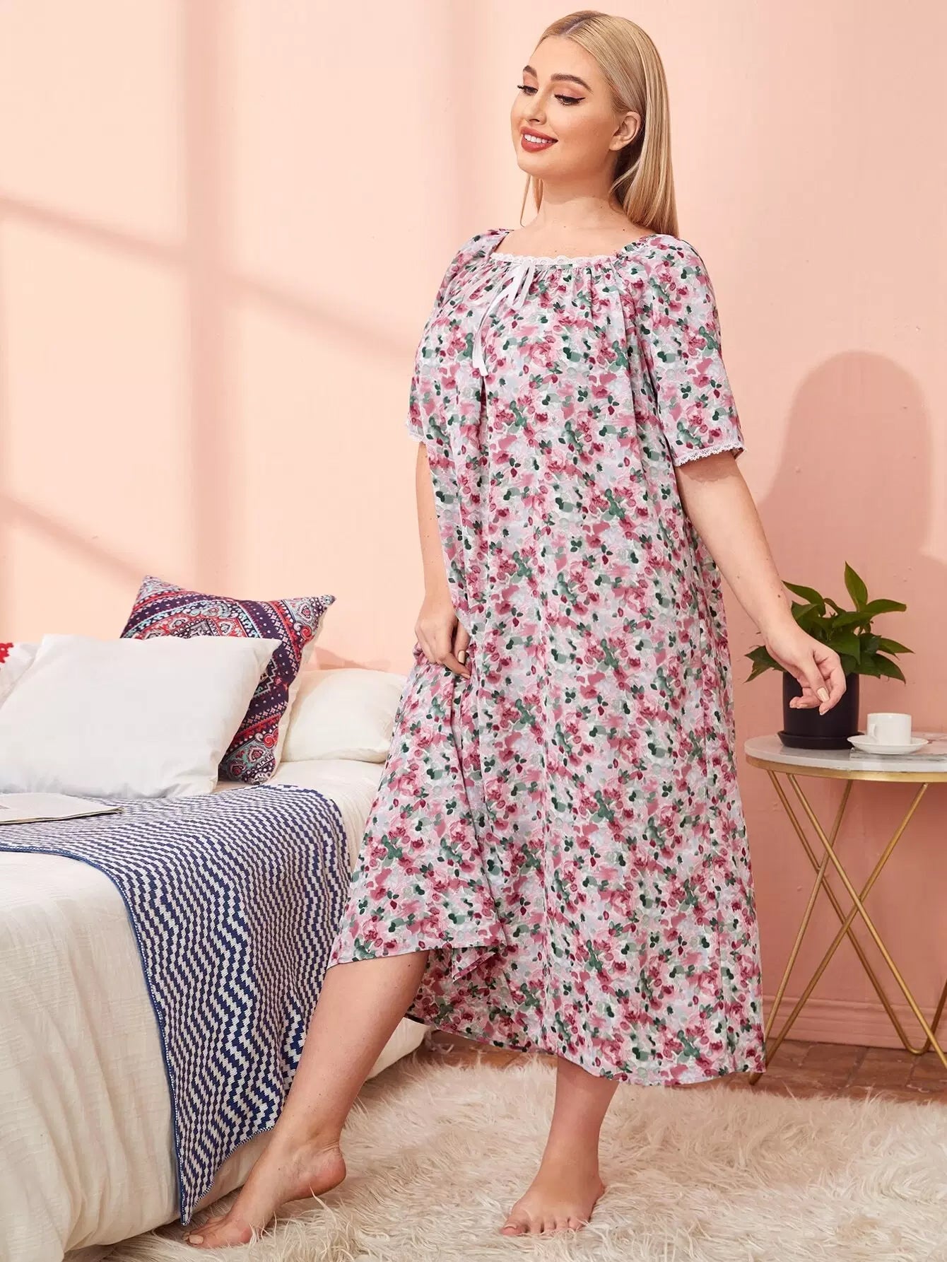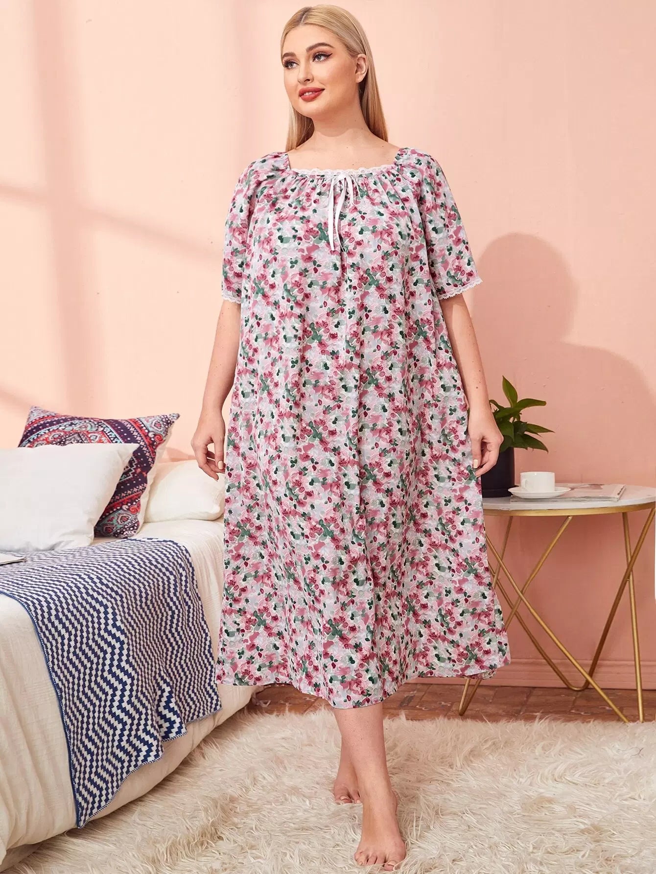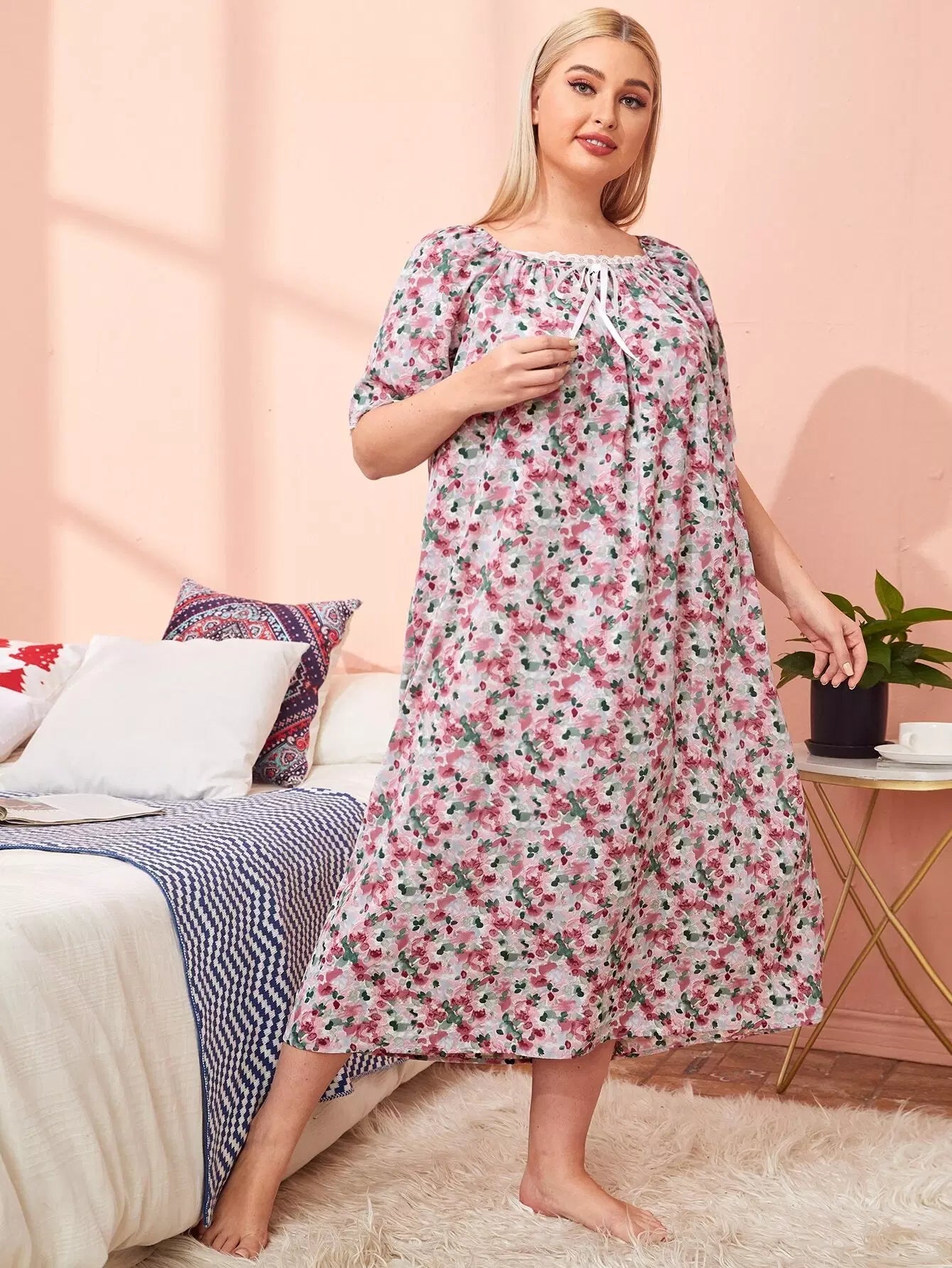 Plus Square Neck Tie Front Ditsy Floral Sleepdress