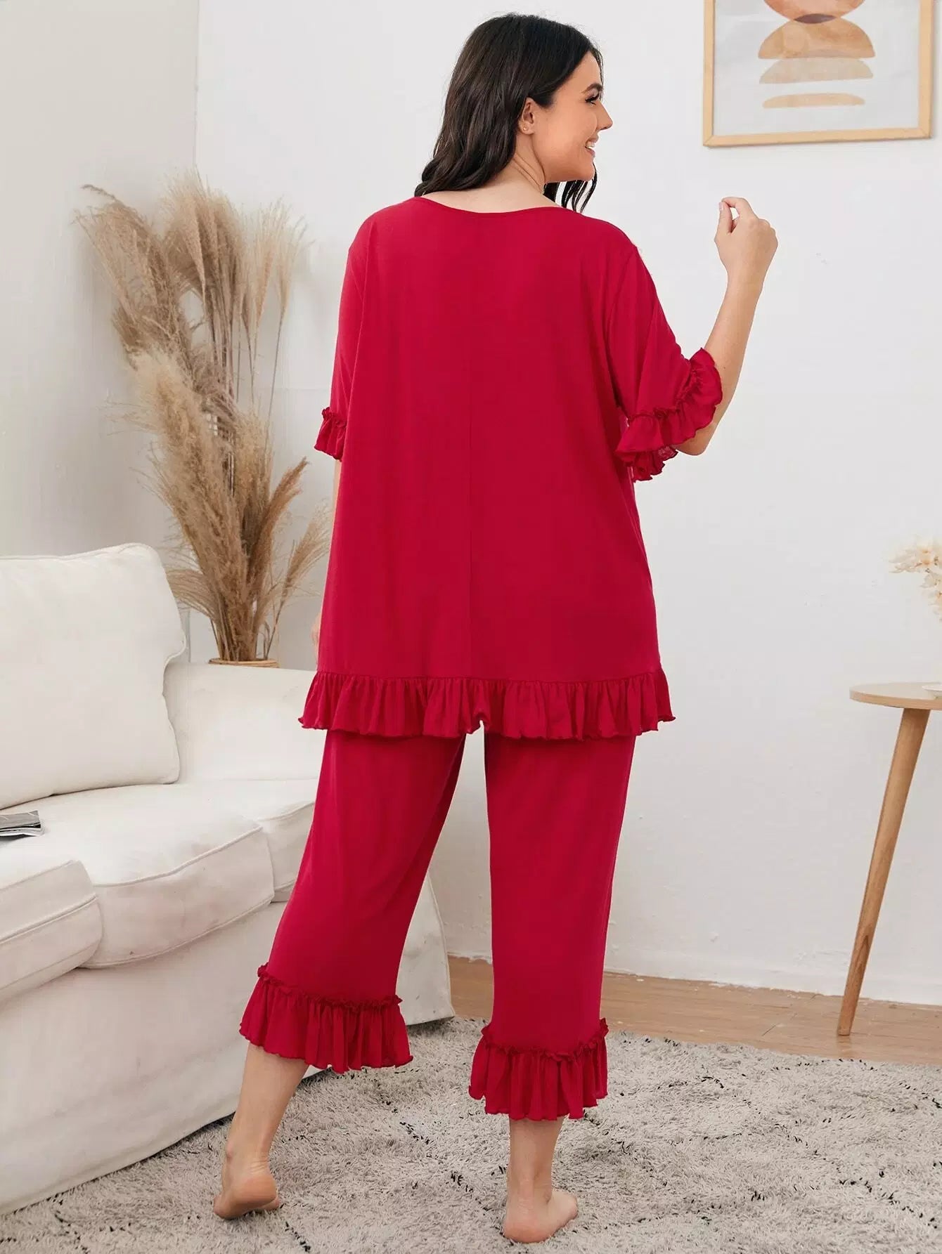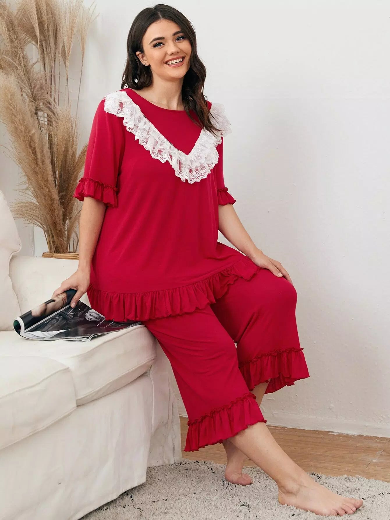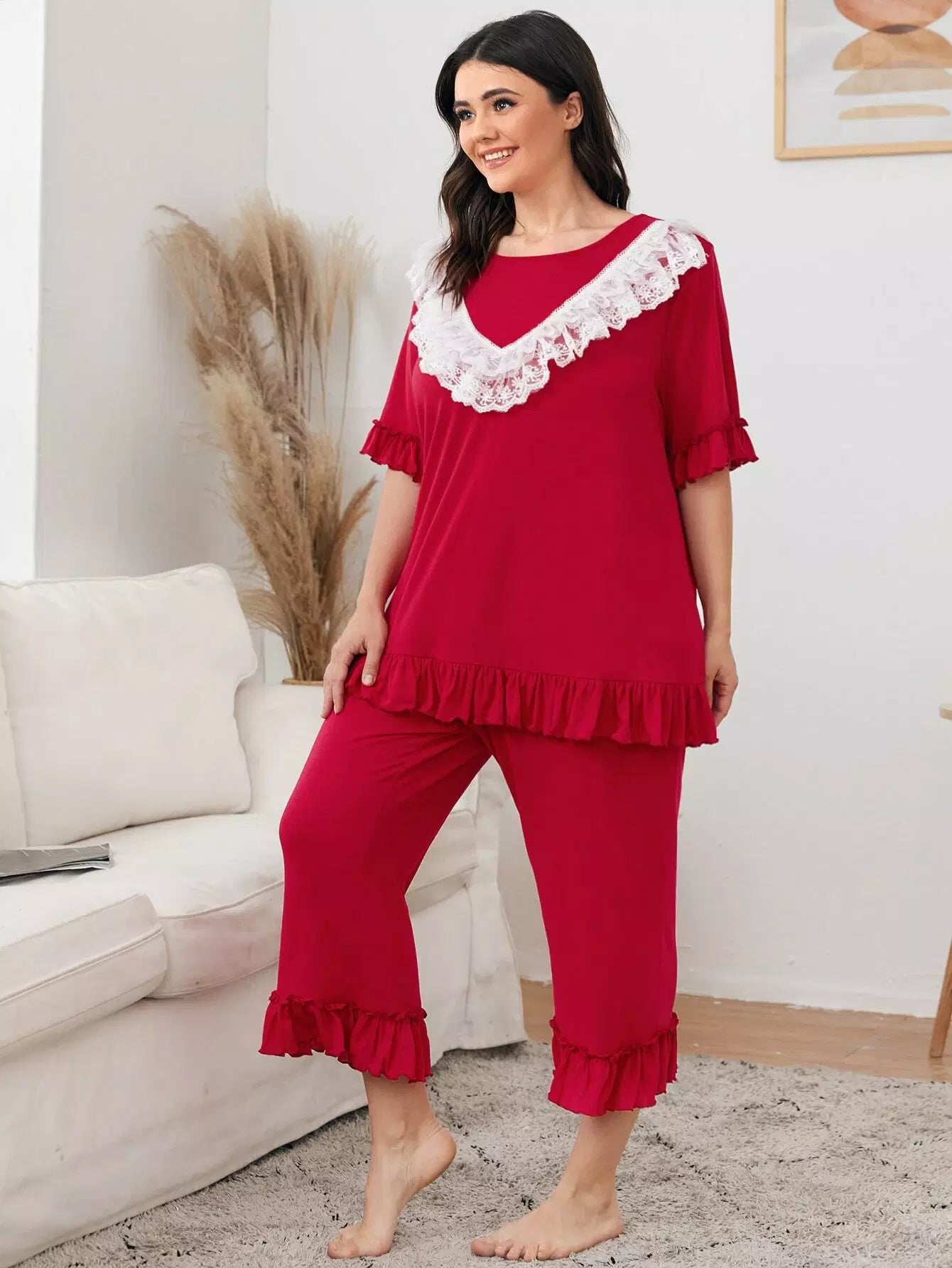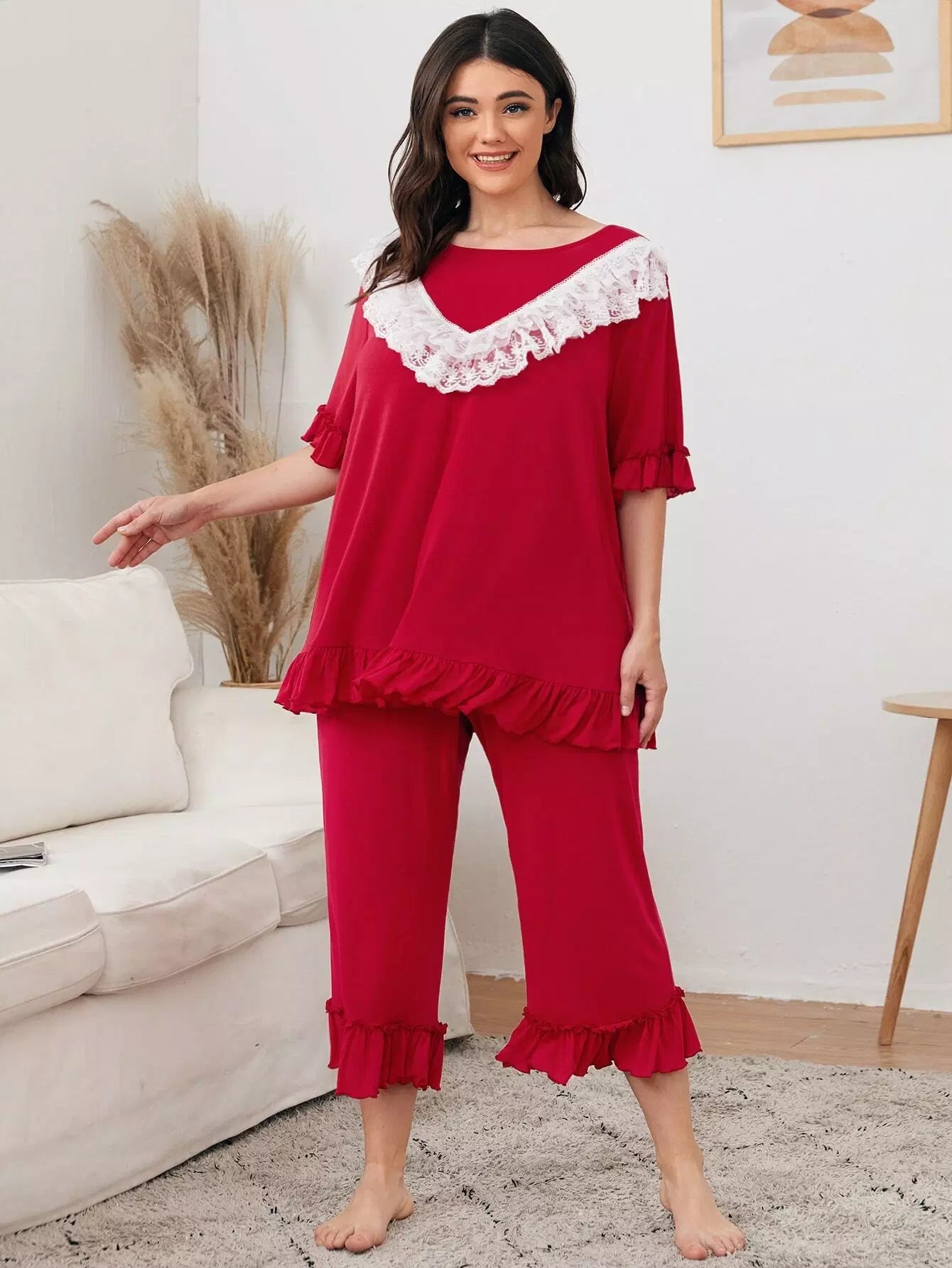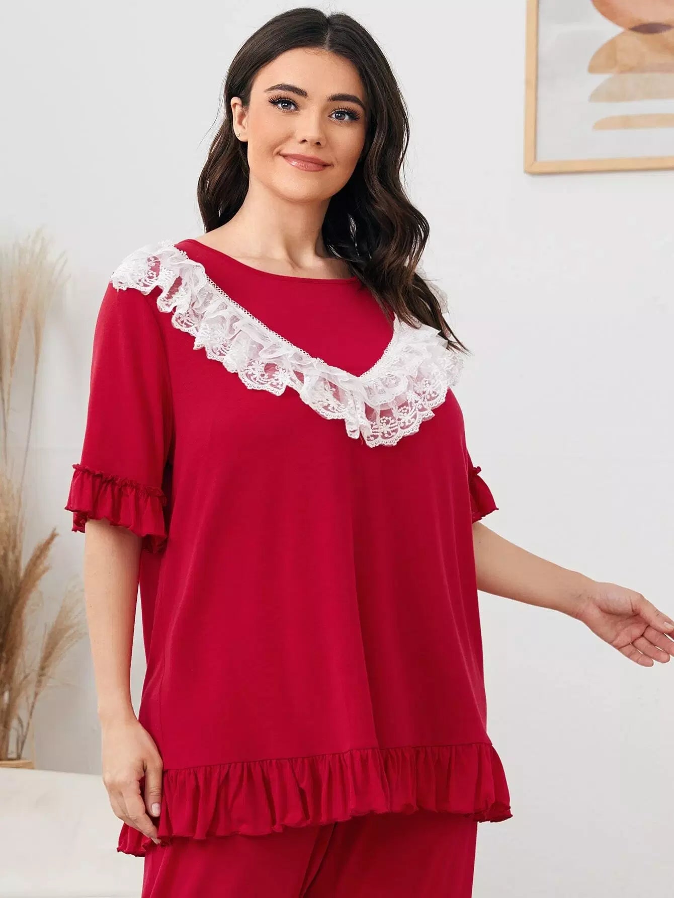Plus Contrast Embroidery Mesh Ruffle Detail Top & Pants PJ Set