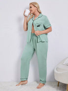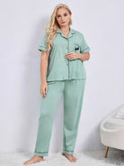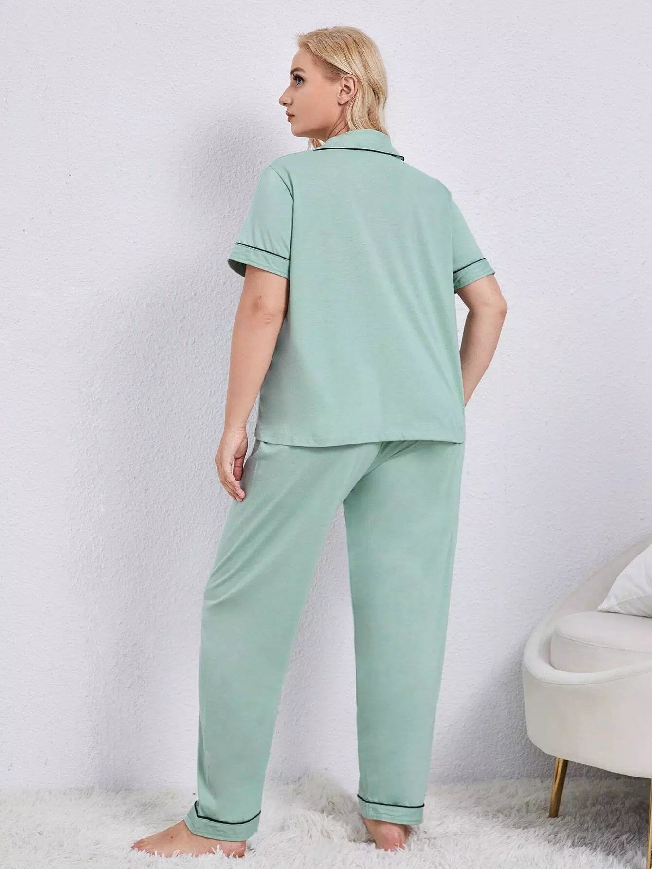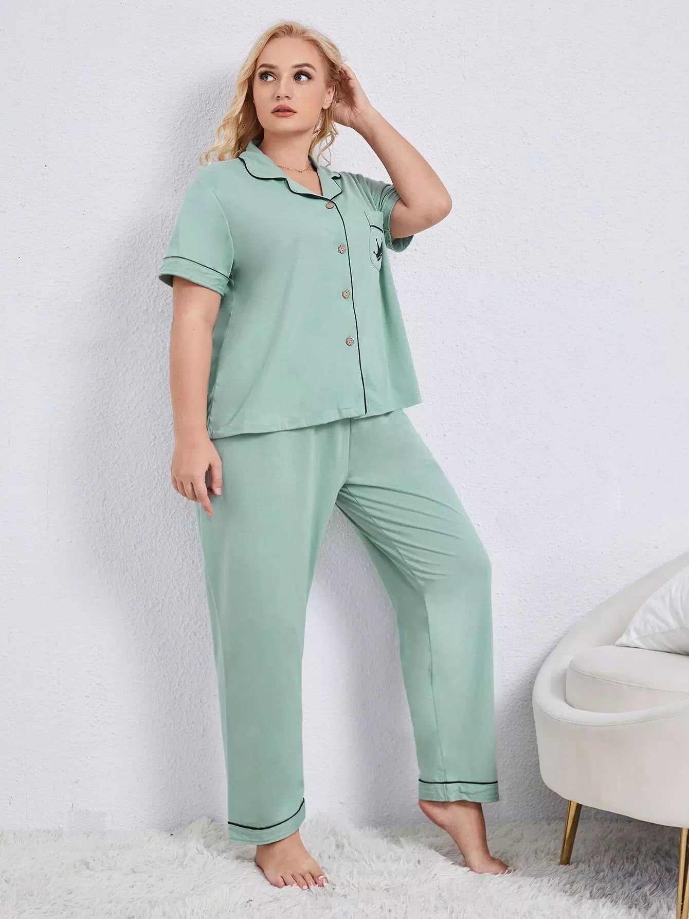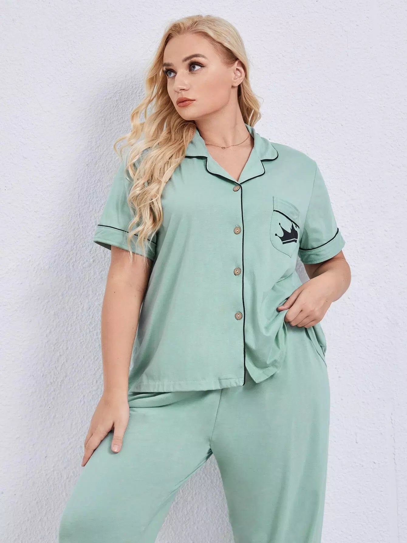 Plus Crown Print Contrast Piping Top & Pants PJ Set