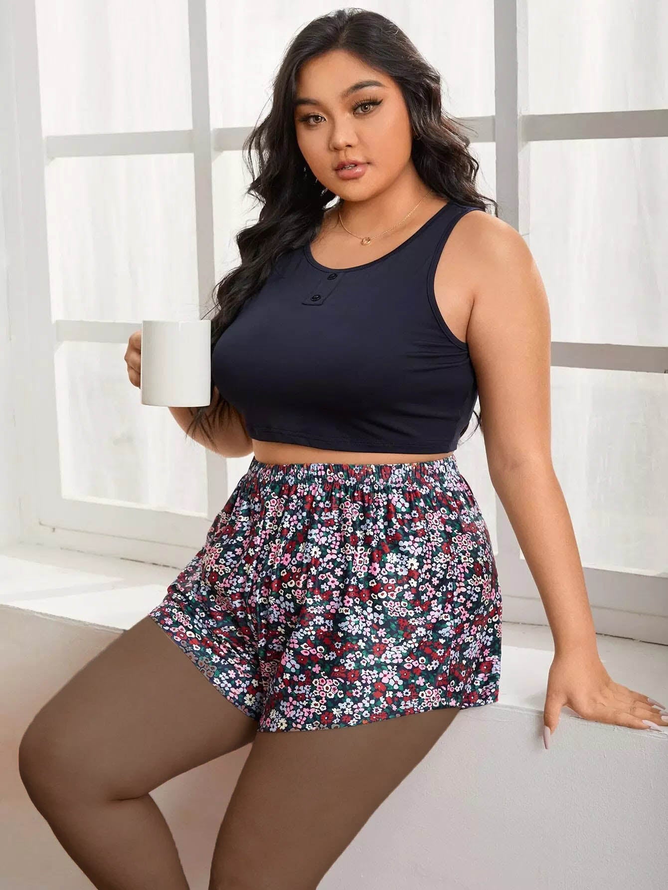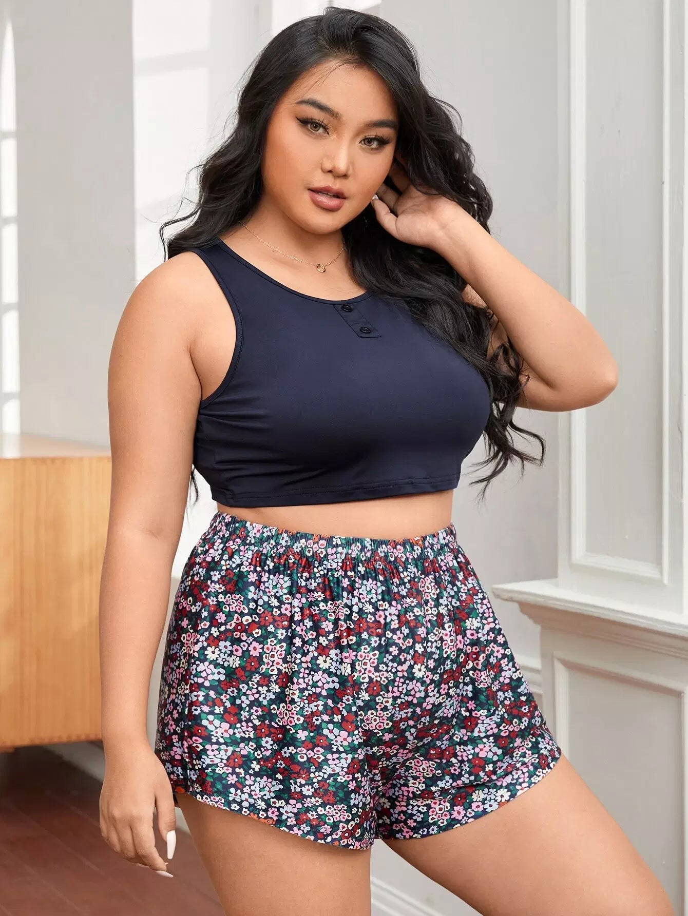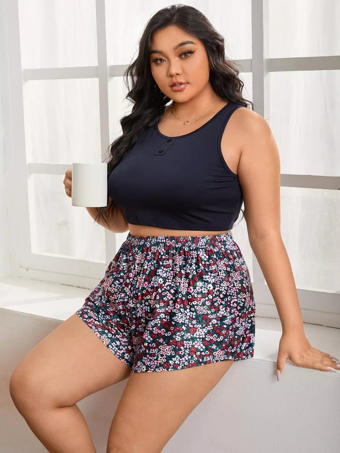 Plus Ditsy Floral Fake Button PJ Set