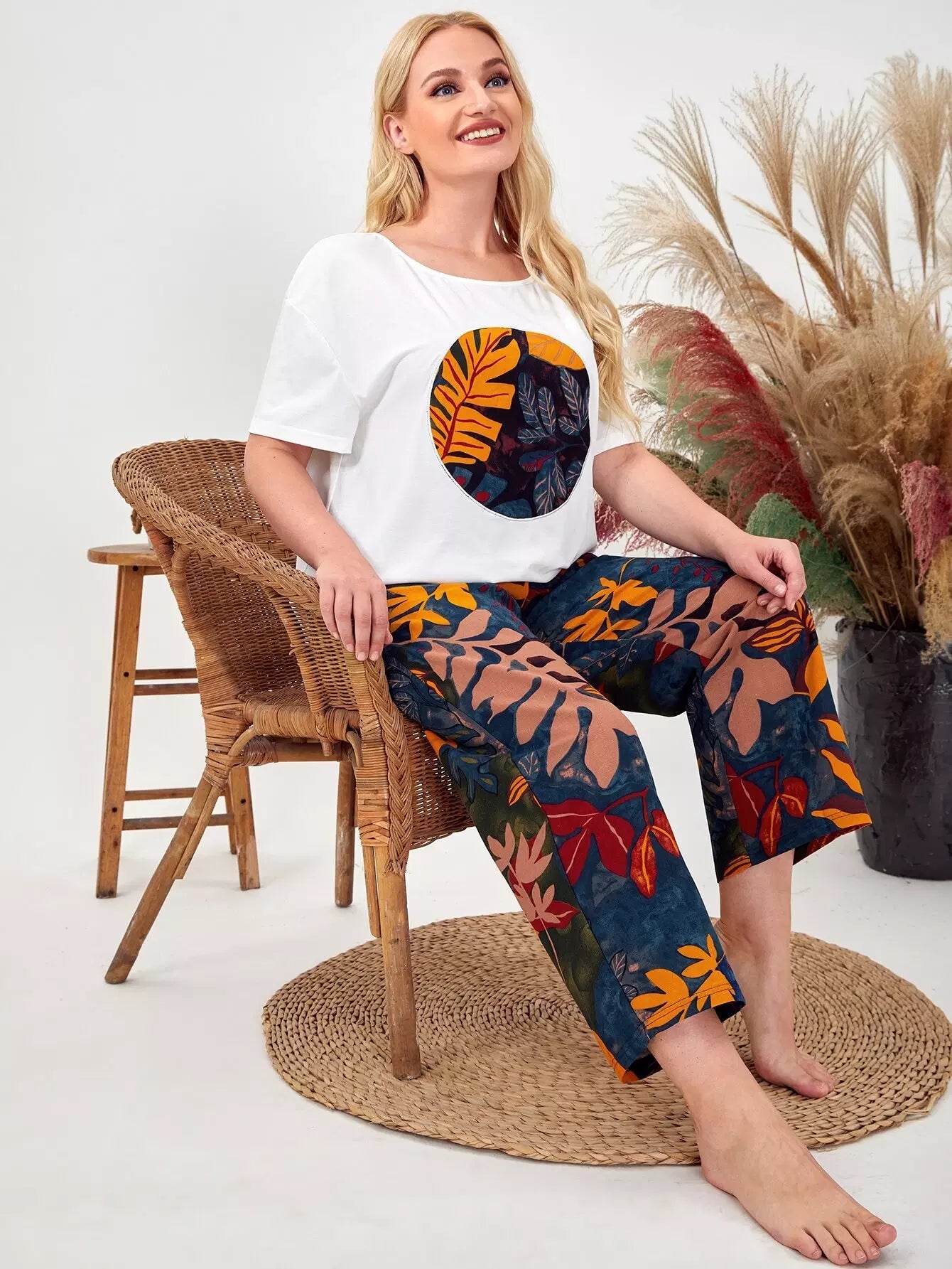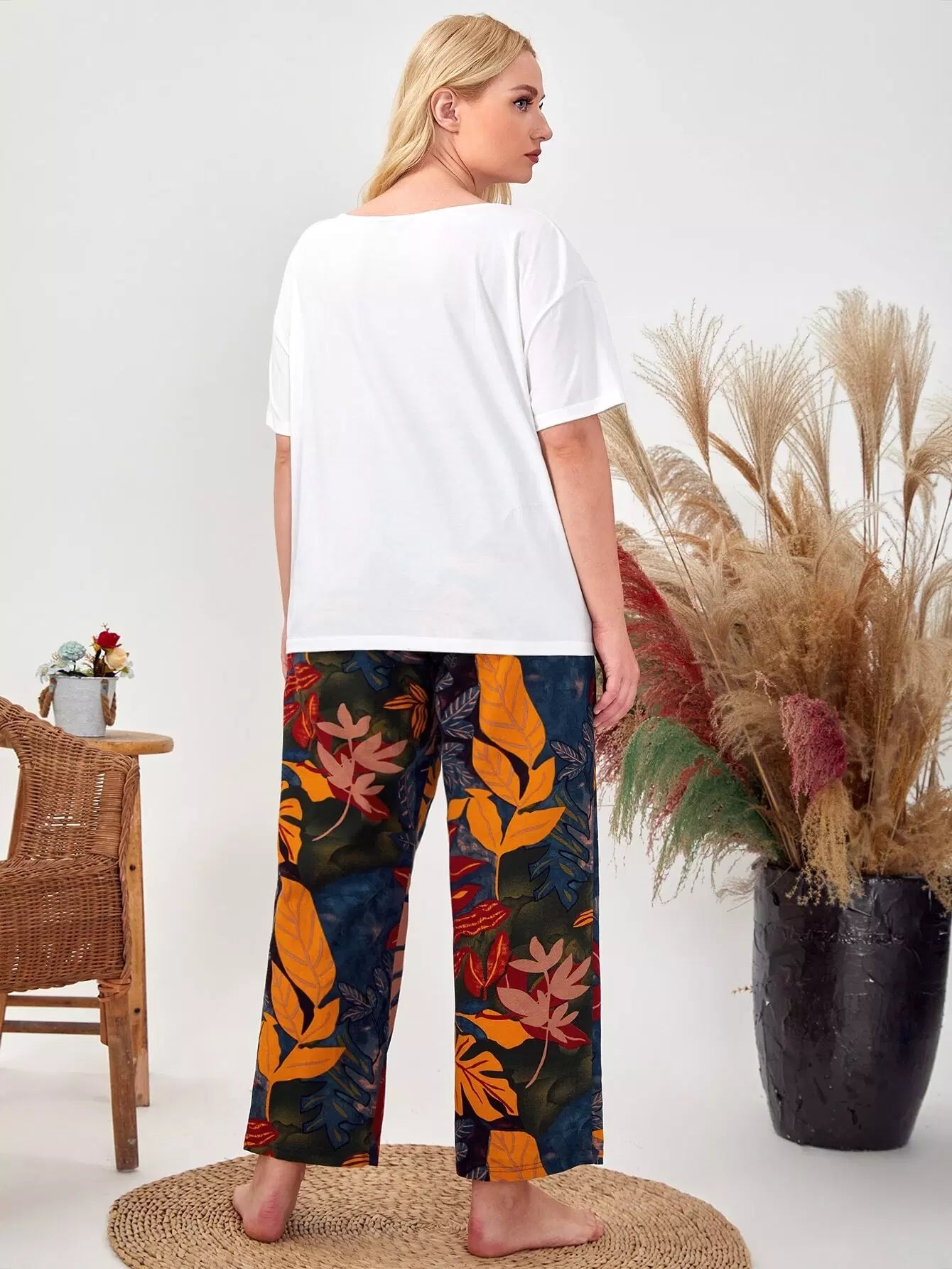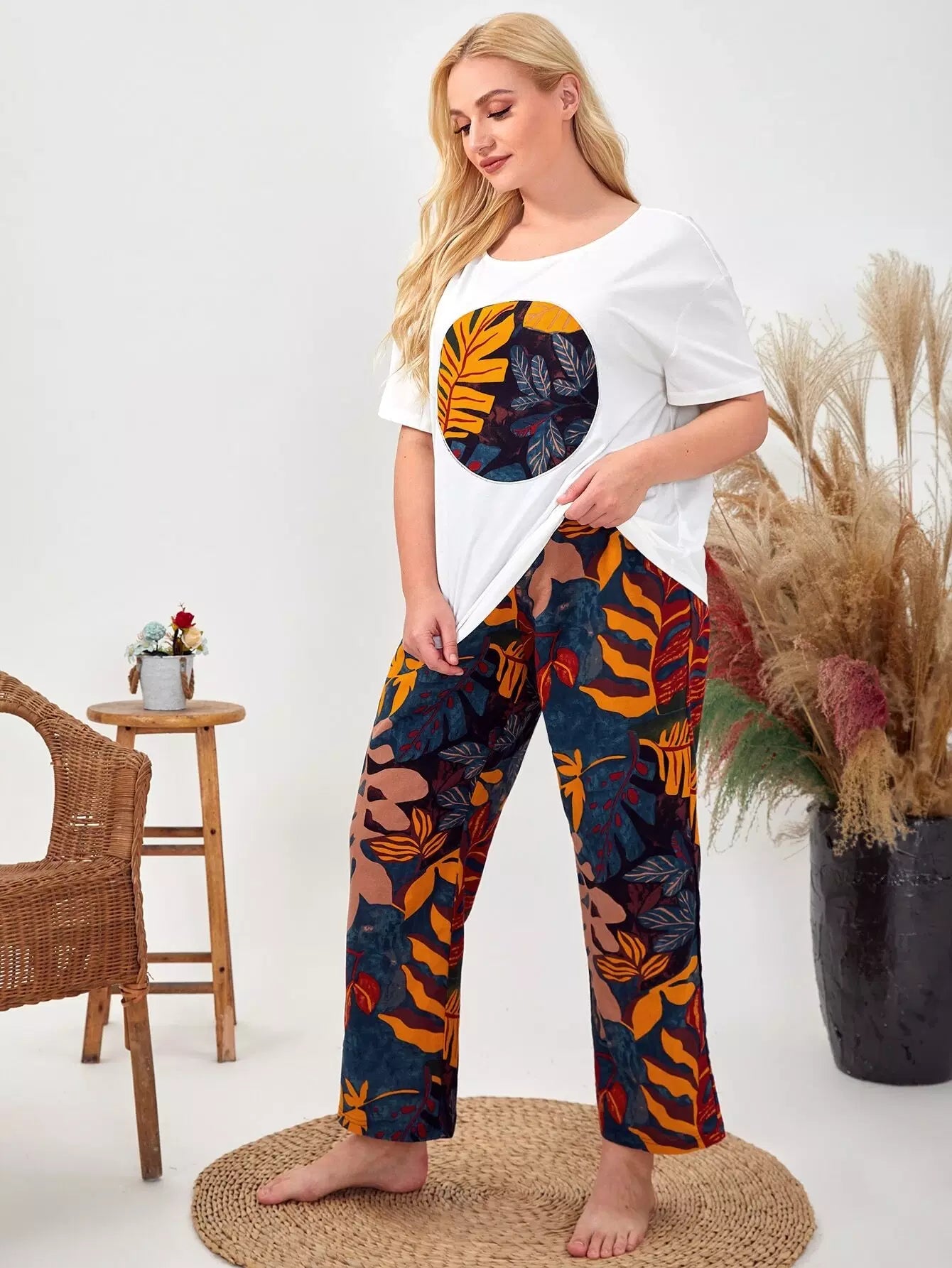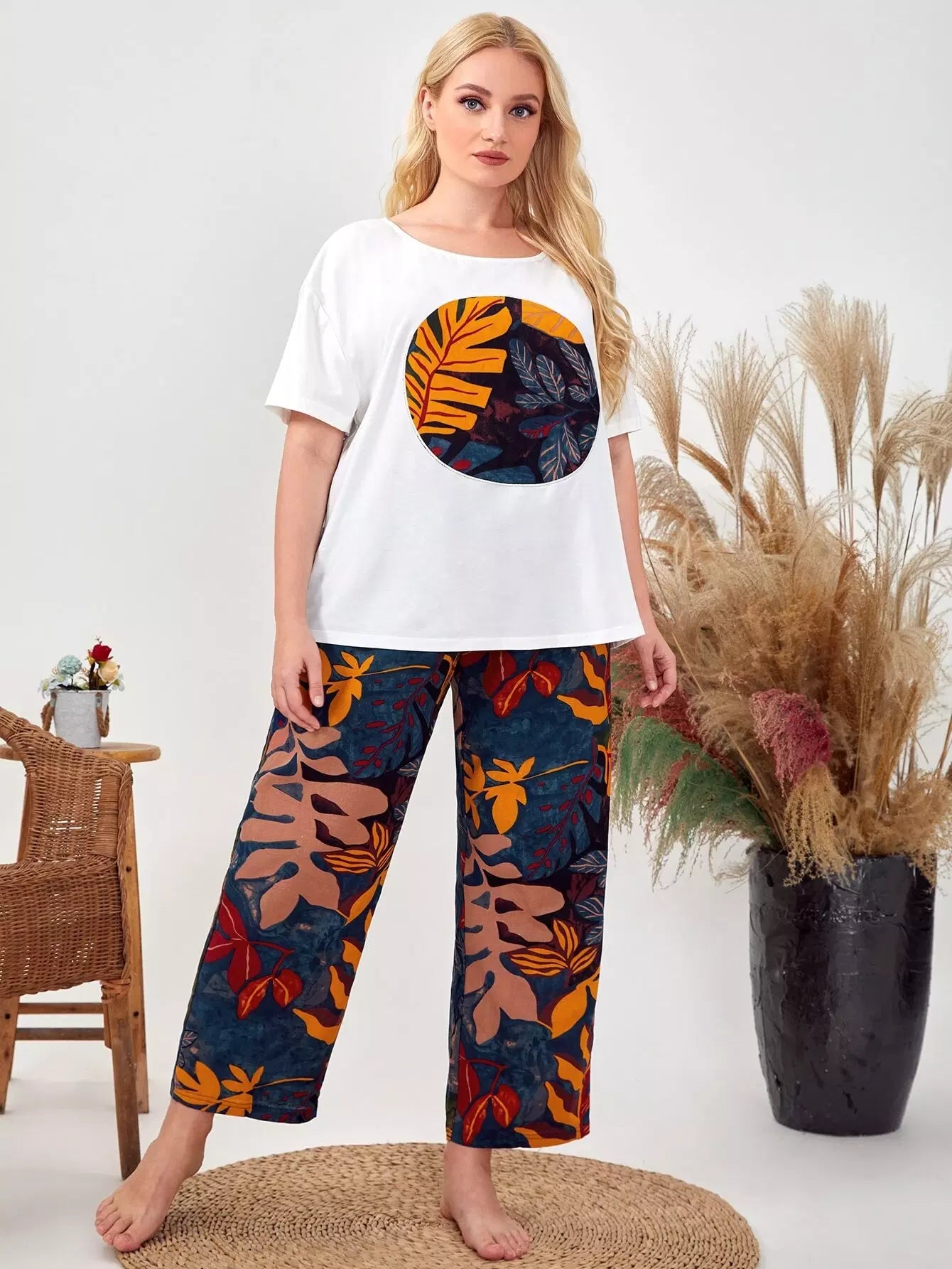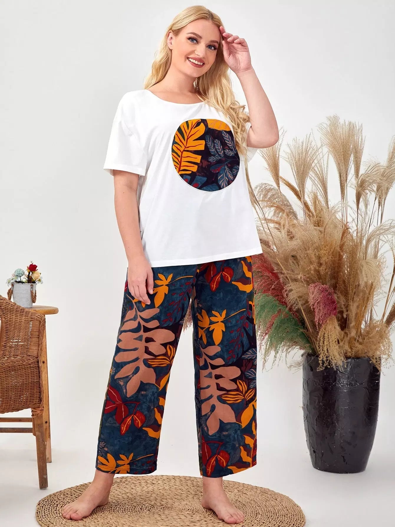 Plus Drop Shoulder Leaves Top & Pants PJ Set